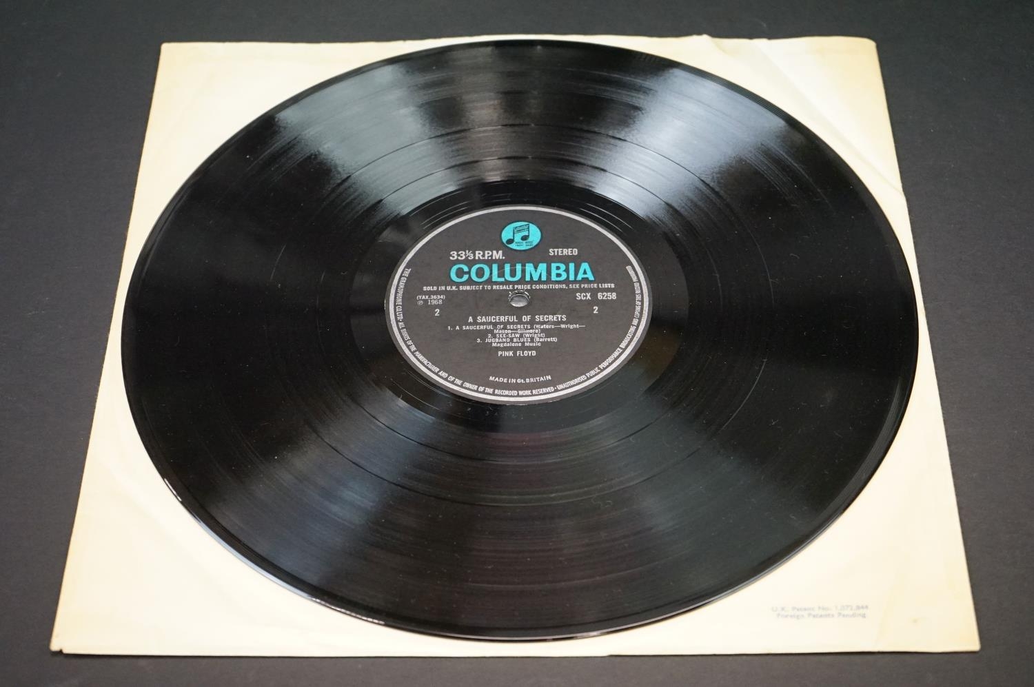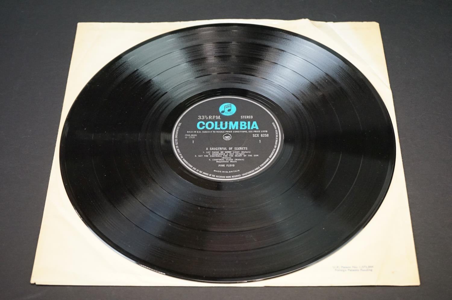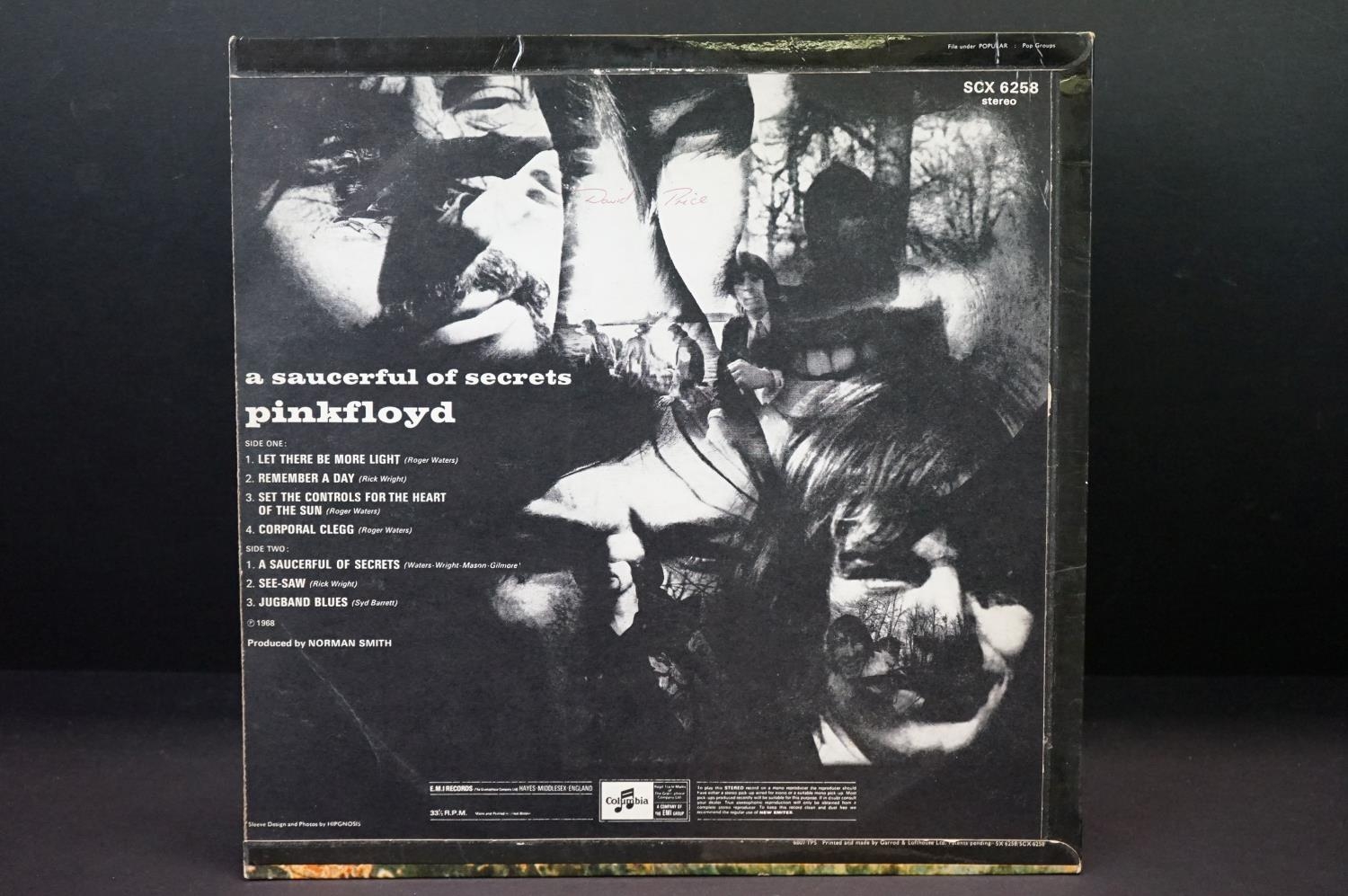 Vinyl - Pink Floyd A Saucerful Of Secrets on Columbia SCX 6258. 1968 UK 1st pressing Stereo, blue Columbia labels. Sleeve VG+ (Small name written on back), Vinyl VG+ / EX- light scuffs