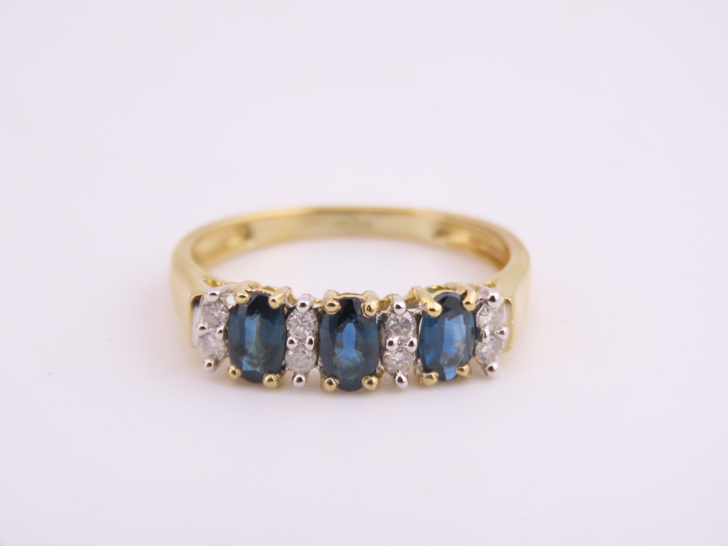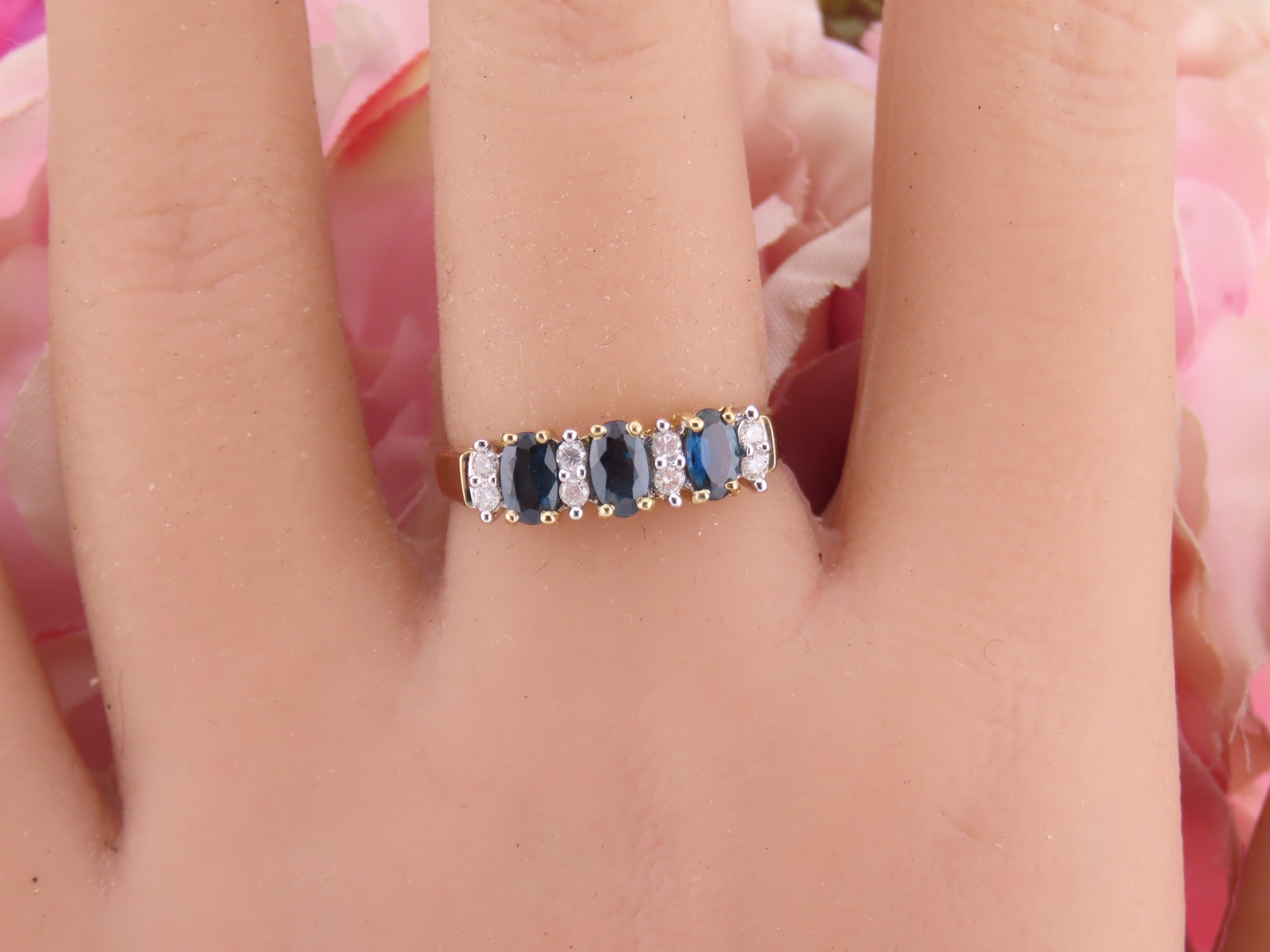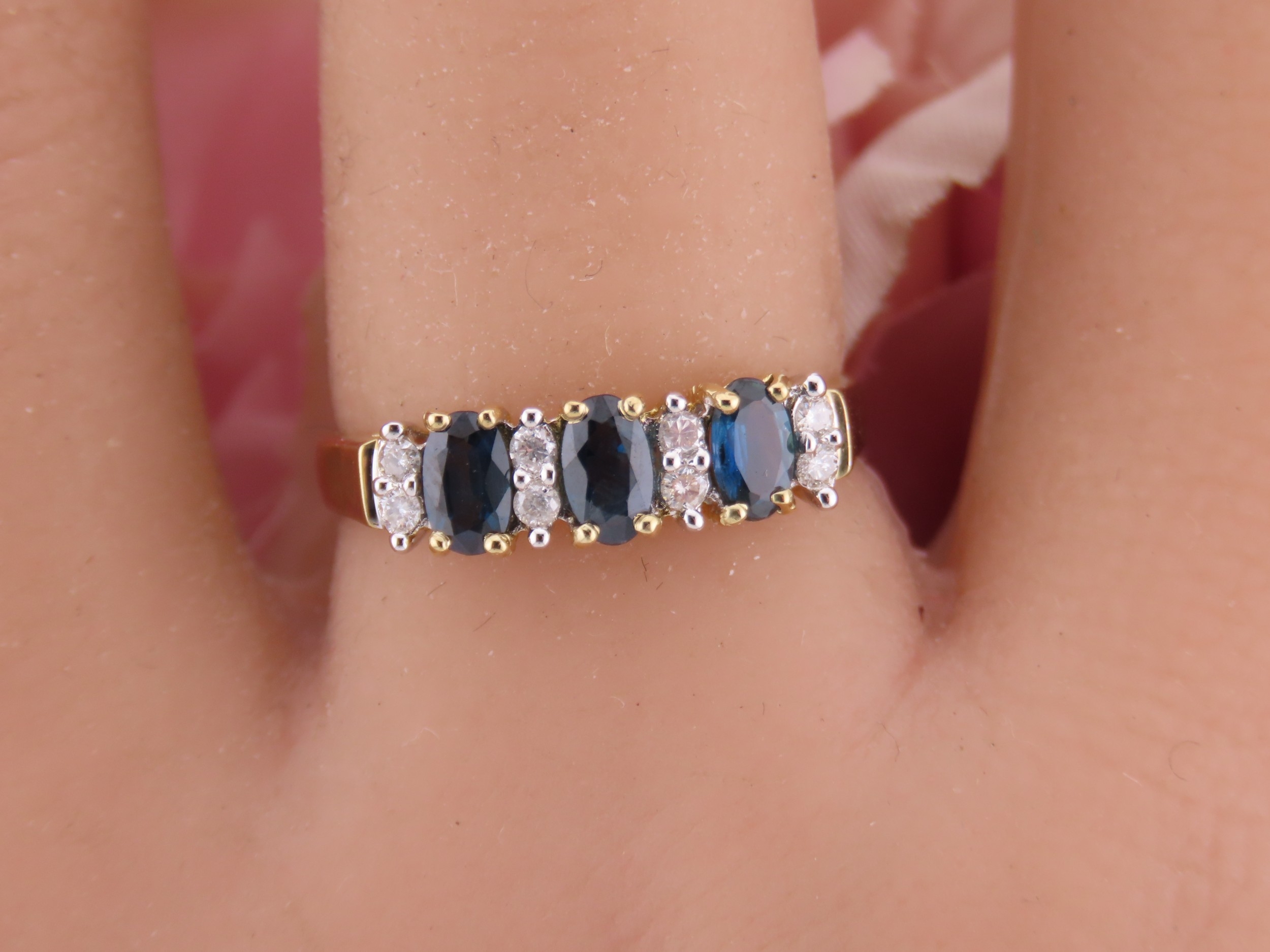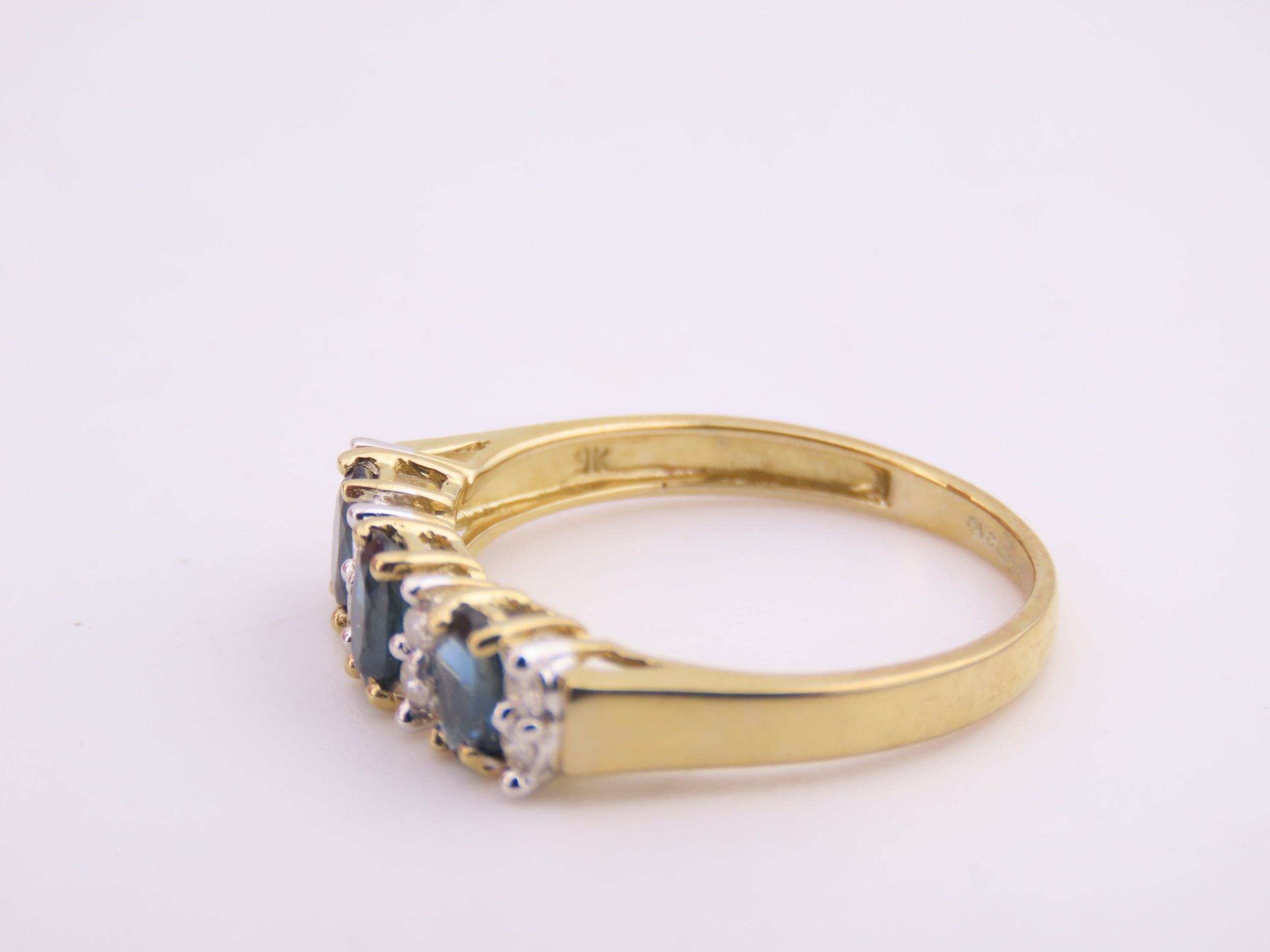 A 9ct gold ring set with alternating sapphires and diamonds. Ring size M. Gross weight 1.7 grams.