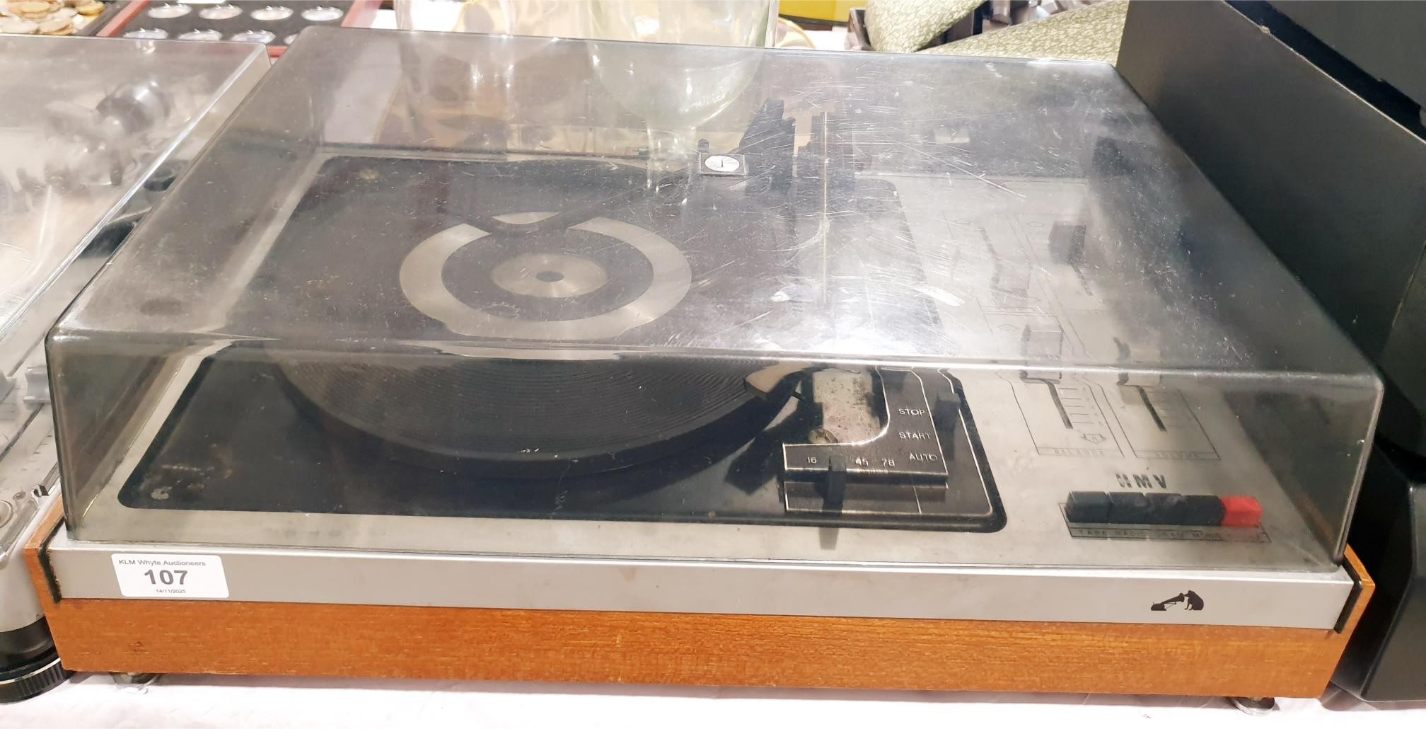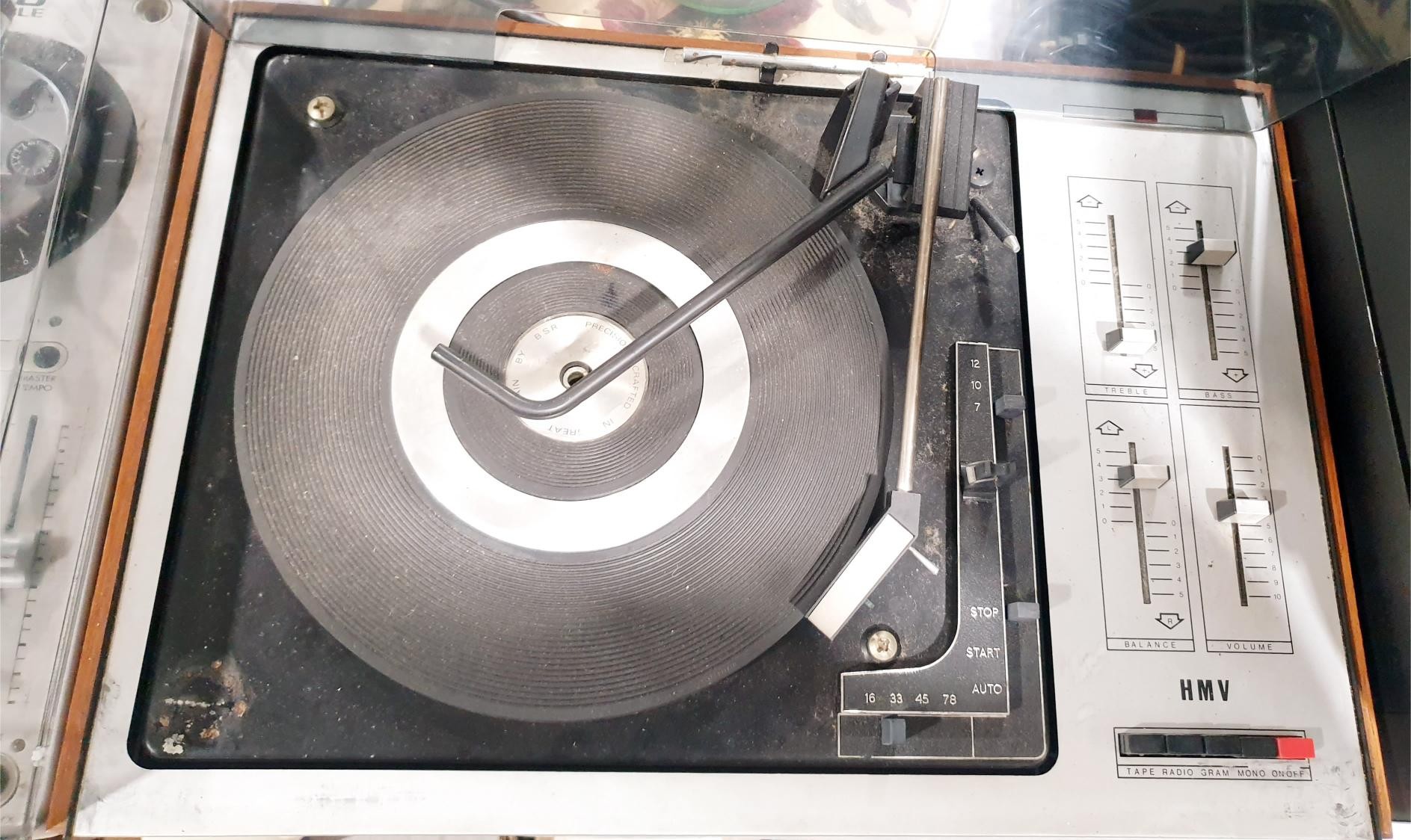 A vintage HMV turntable. No Shipping. Arrange collection or your own packer and shipper, please. Electricals are sold as scrap.
