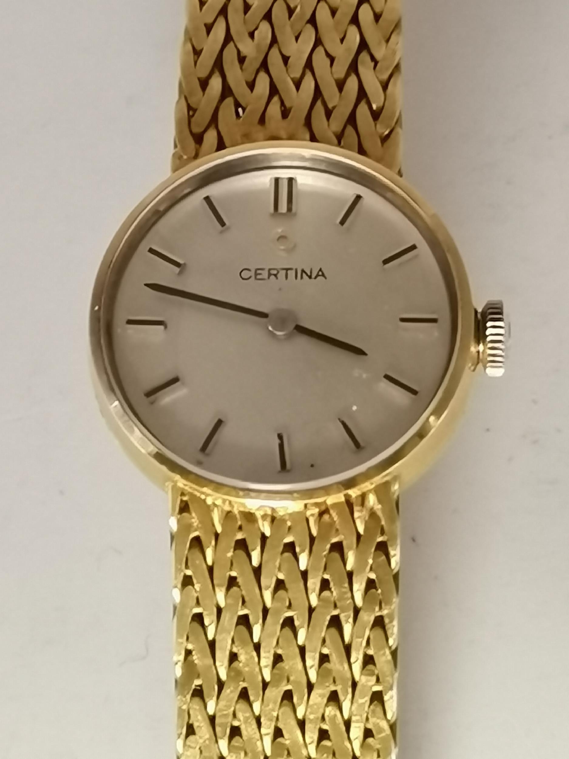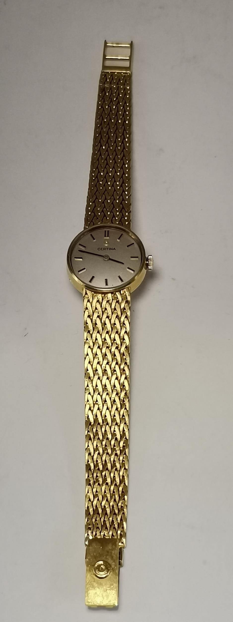 A lady's 18 carat gold bracelet wristwatch, the silvered circular dial signed Certina, with blued steel hands and gilt baton hour markers, the movement marked 17 Jewels and Certina 13-21, the caseback hallmarked 18K 0.750 inside, numbered 0810 930 and 877661 to back, case marked to side and stamped '750' to strap clasp. Case 21mm diameter, 40.5g (excl. movement)