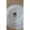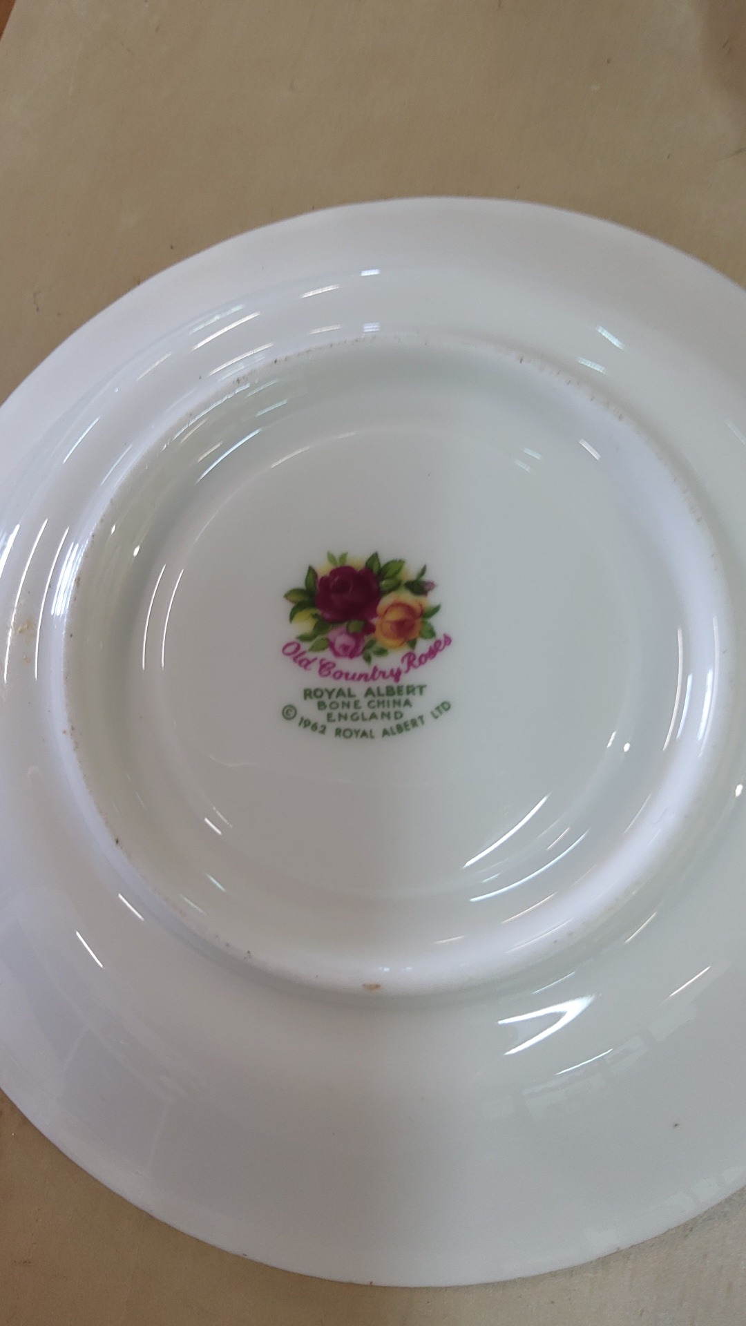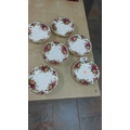 Set of six Royal Albert “Old Country Roses” bone china saucers, gilt-edged with crimson and yellow rose sprays, pattern introduced 1962.