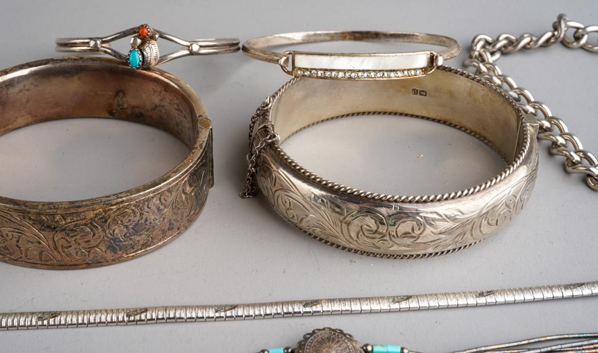 Assorted silver jewellery including two bangles, chain bracelet with heart shaped lock, a Sign of the Zodiac coin bracelet, further bracelets, hallmarked, stamped 925 with some white metal items, hallmarked or stamped silver gross approx weight 113.8 grams (1 bag)