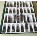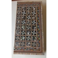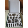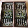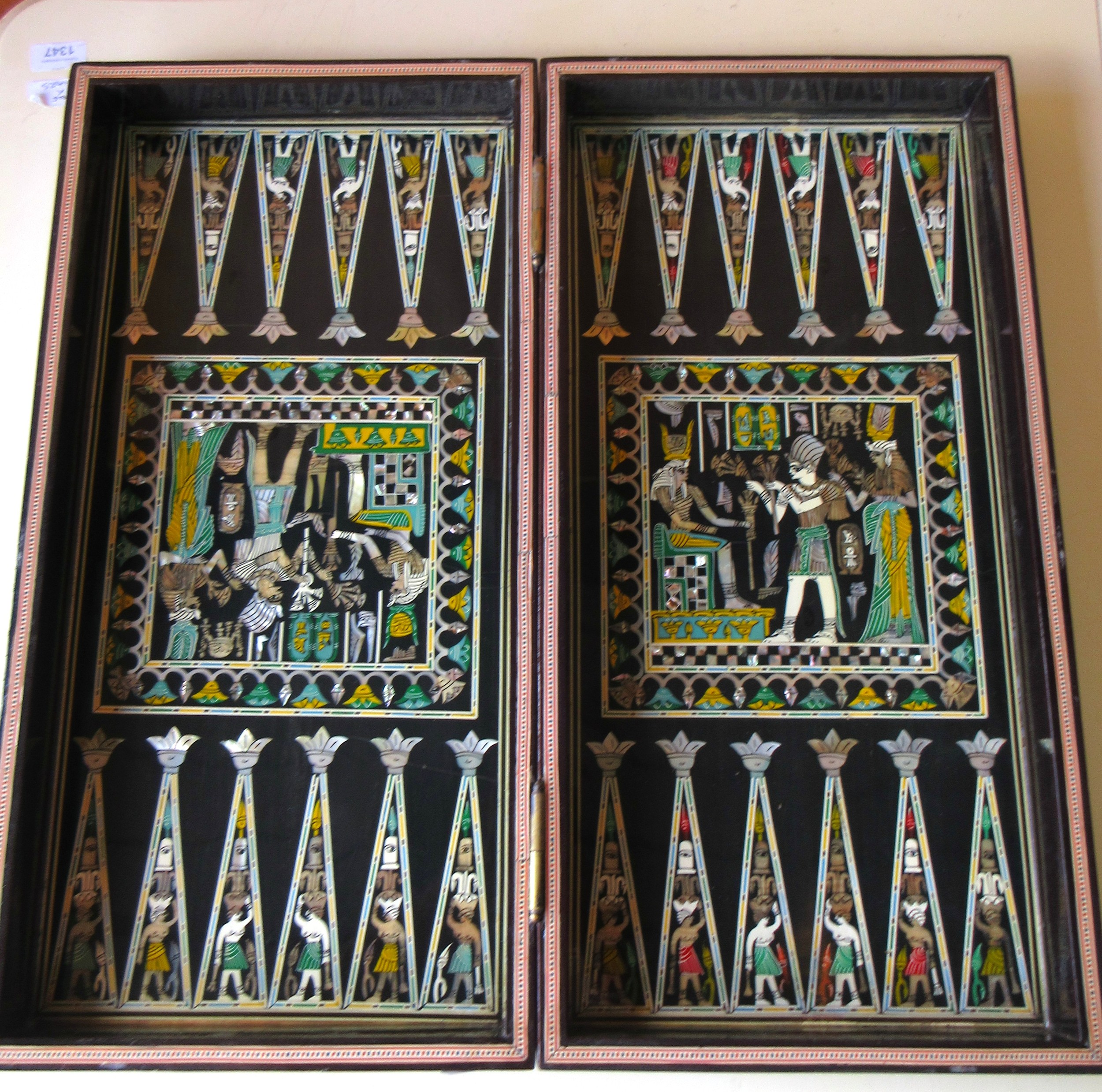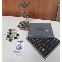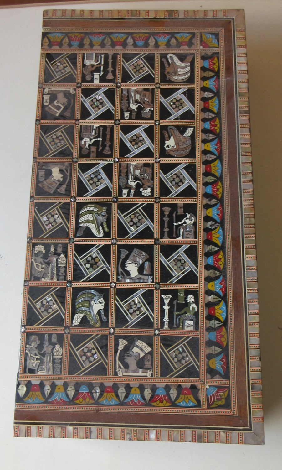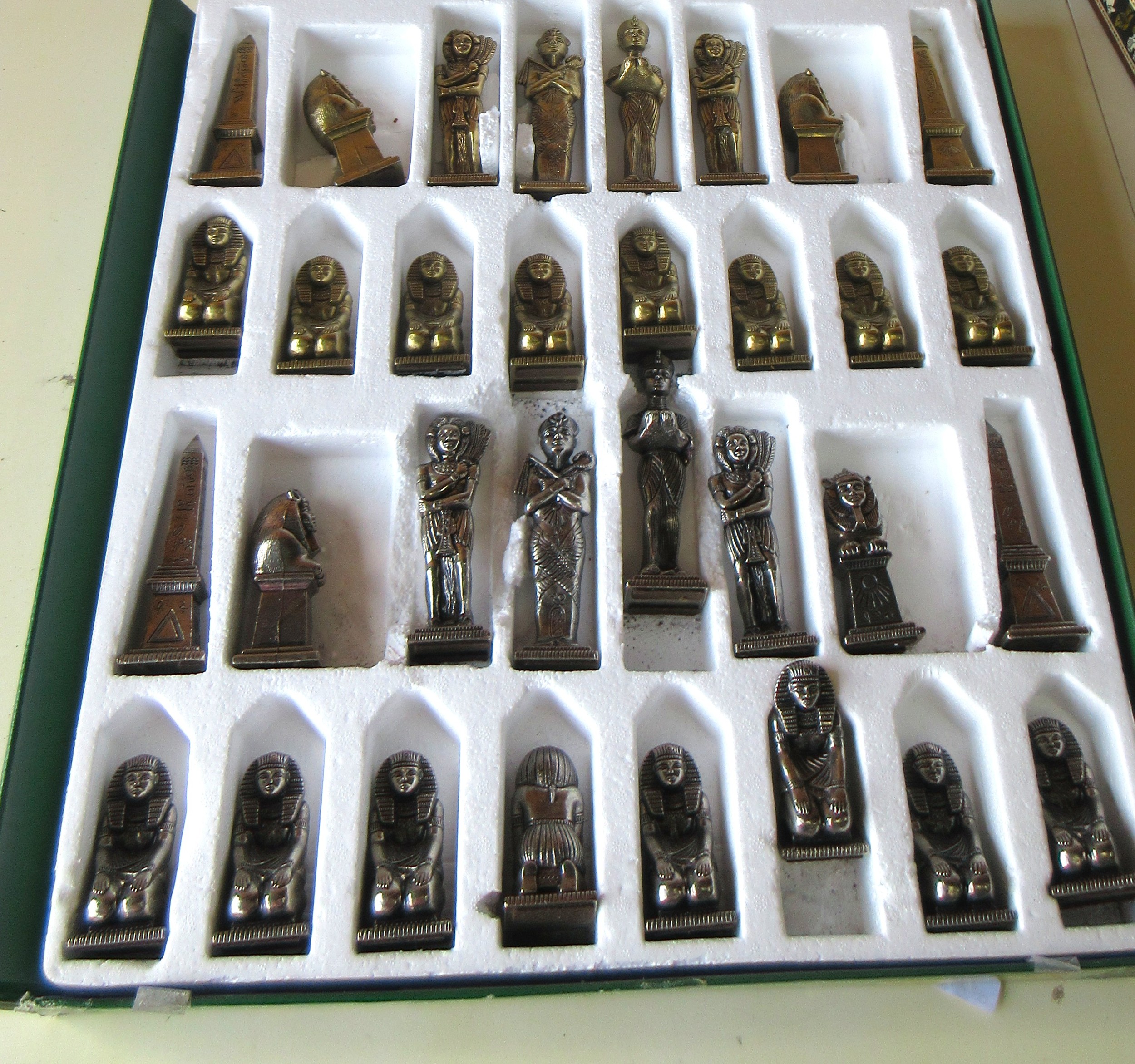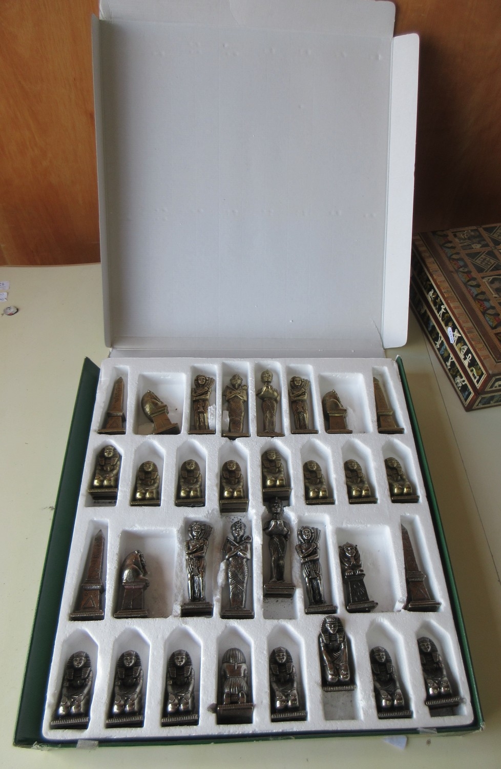 Boxed Ancient Egyptian themed metal chess pieces and Ancient Egyptian themed chess board with mother of pearl inlay