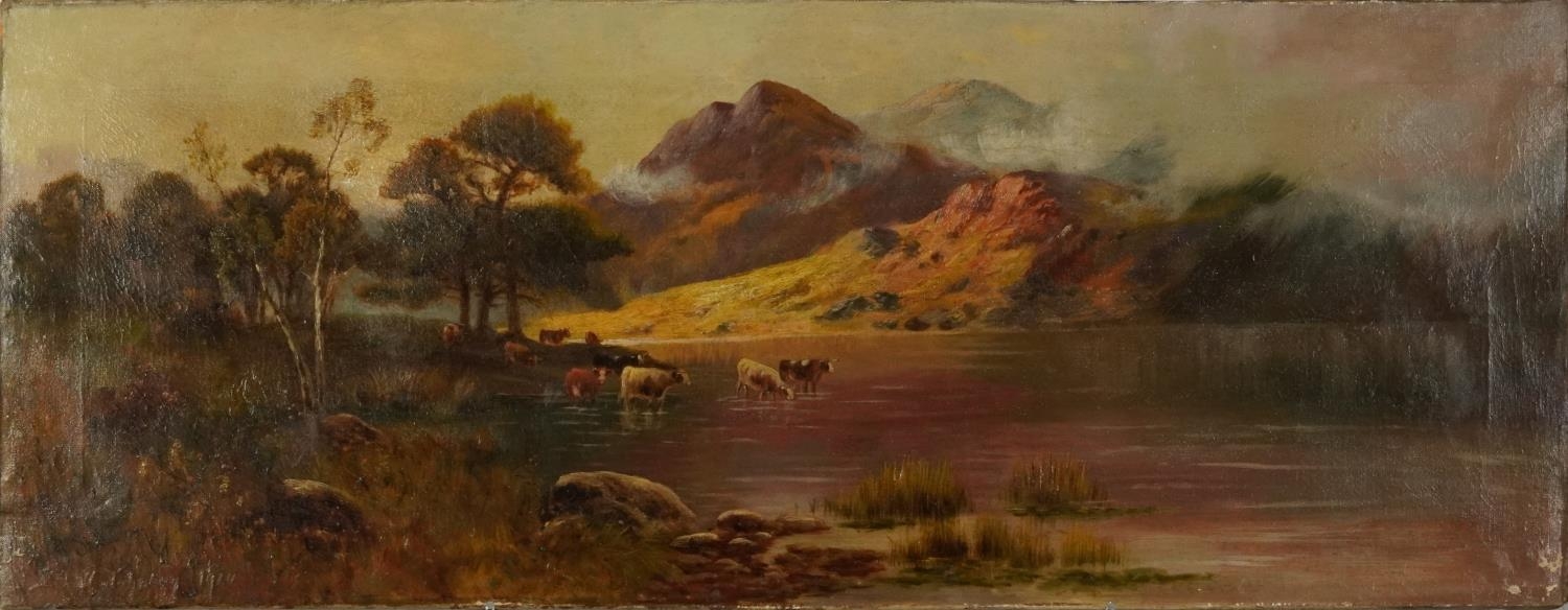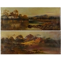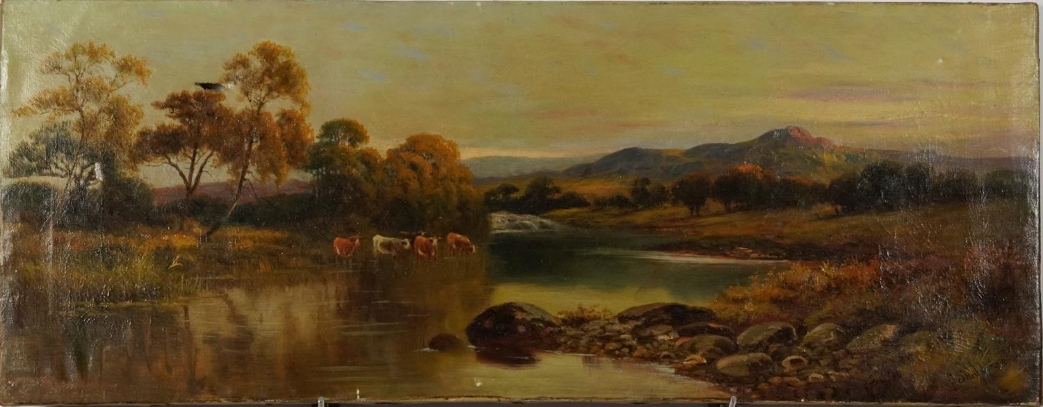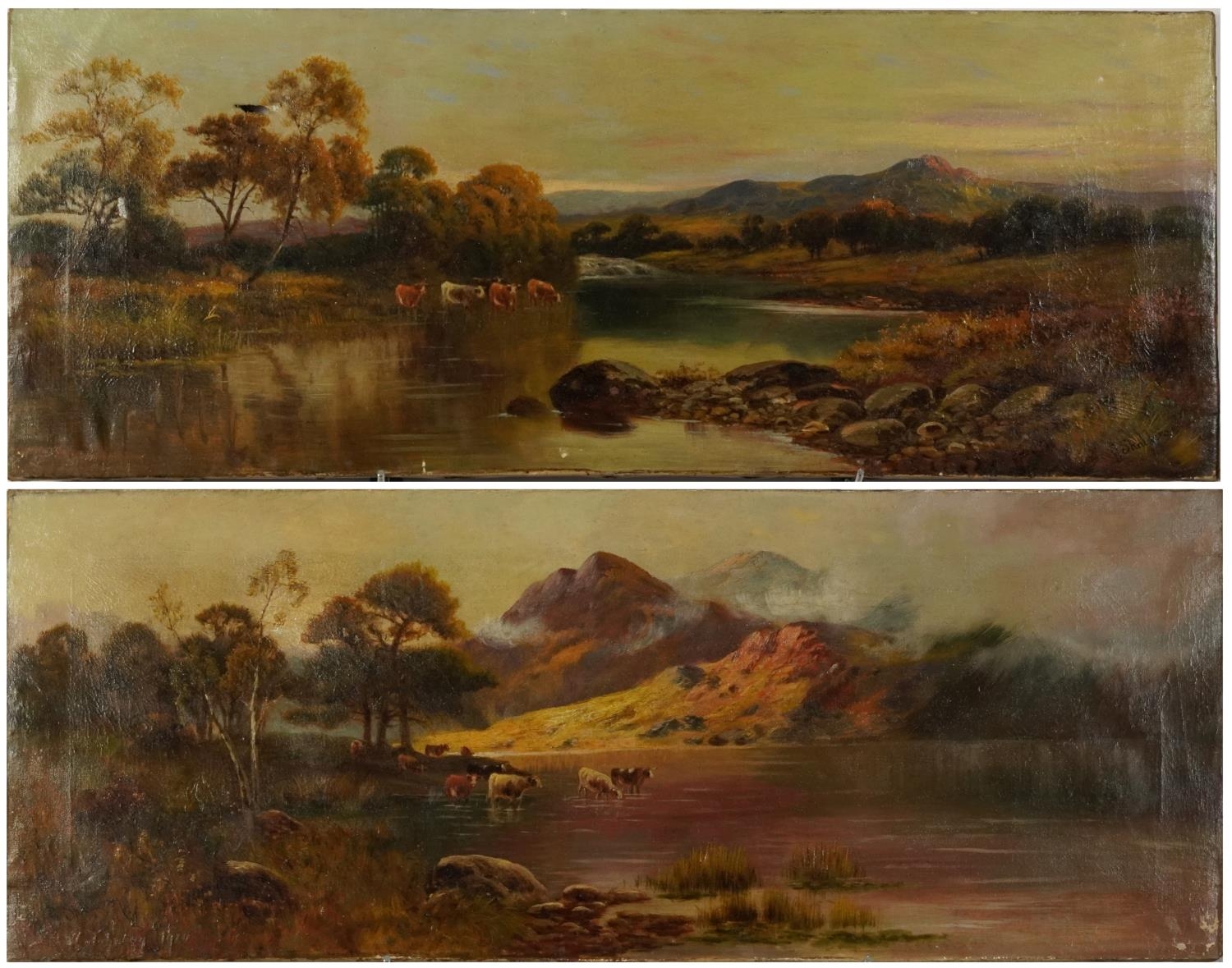 Manner of George Shalders - Mountainous river landscapes with Highland cattle, pair of 19th century Scottish oil on canvasses, unframed, each 92cm x 35cm