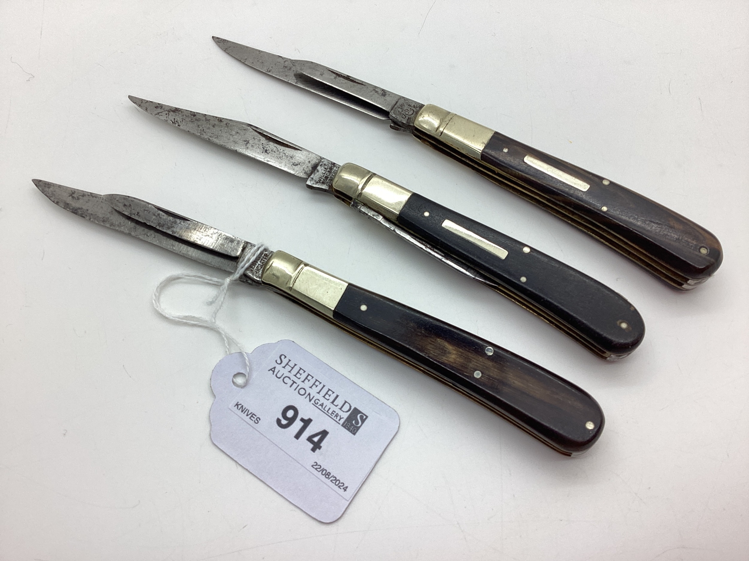 Three Two Blade Folding Pocket Knives, horn scales, William Rodgers and Venture H M Slater (9.1CM-9.3cm closed). (3)