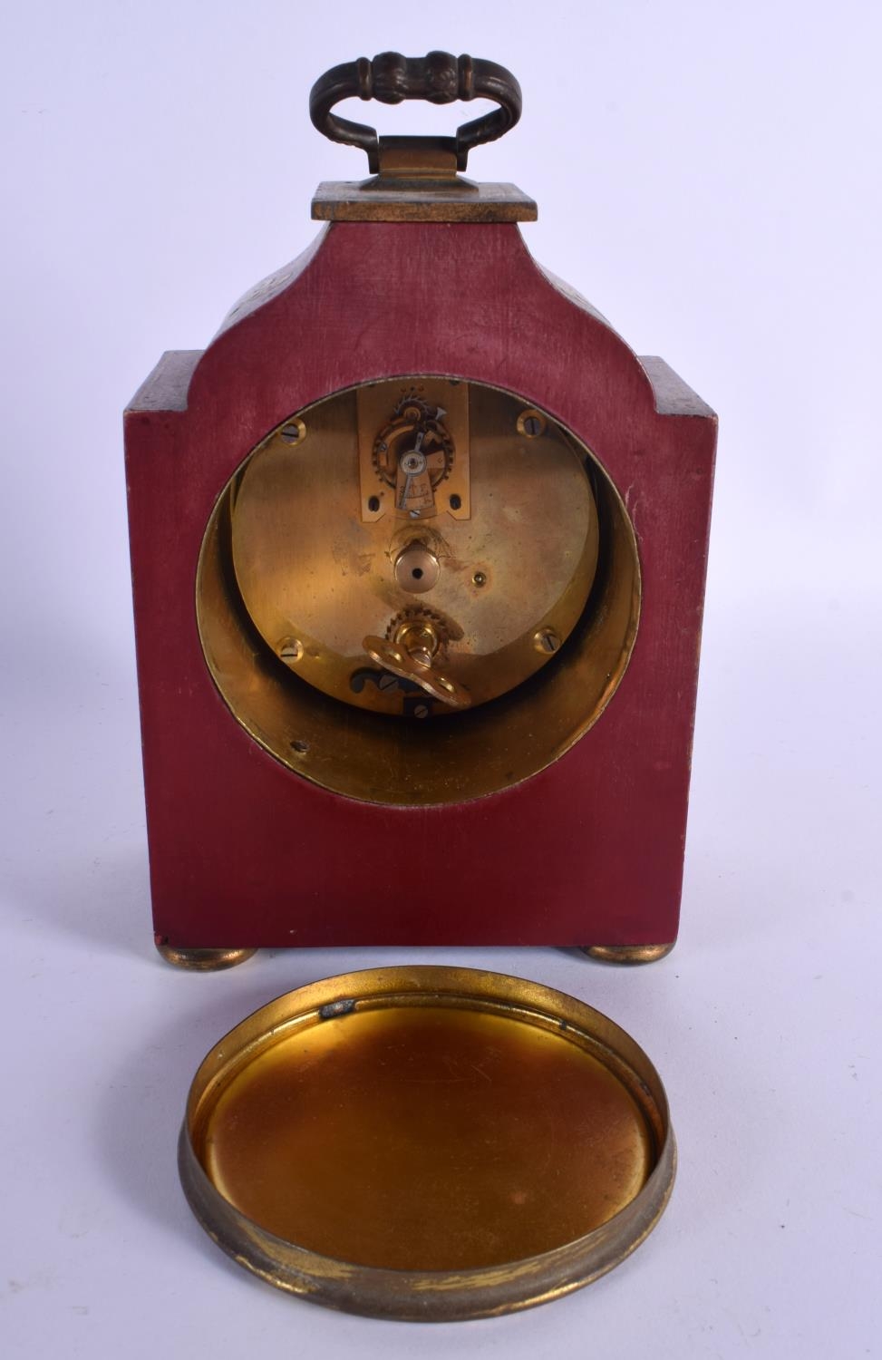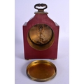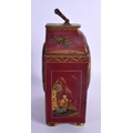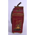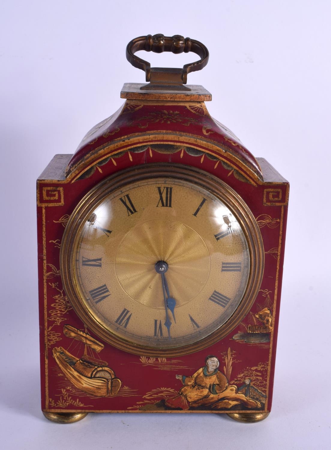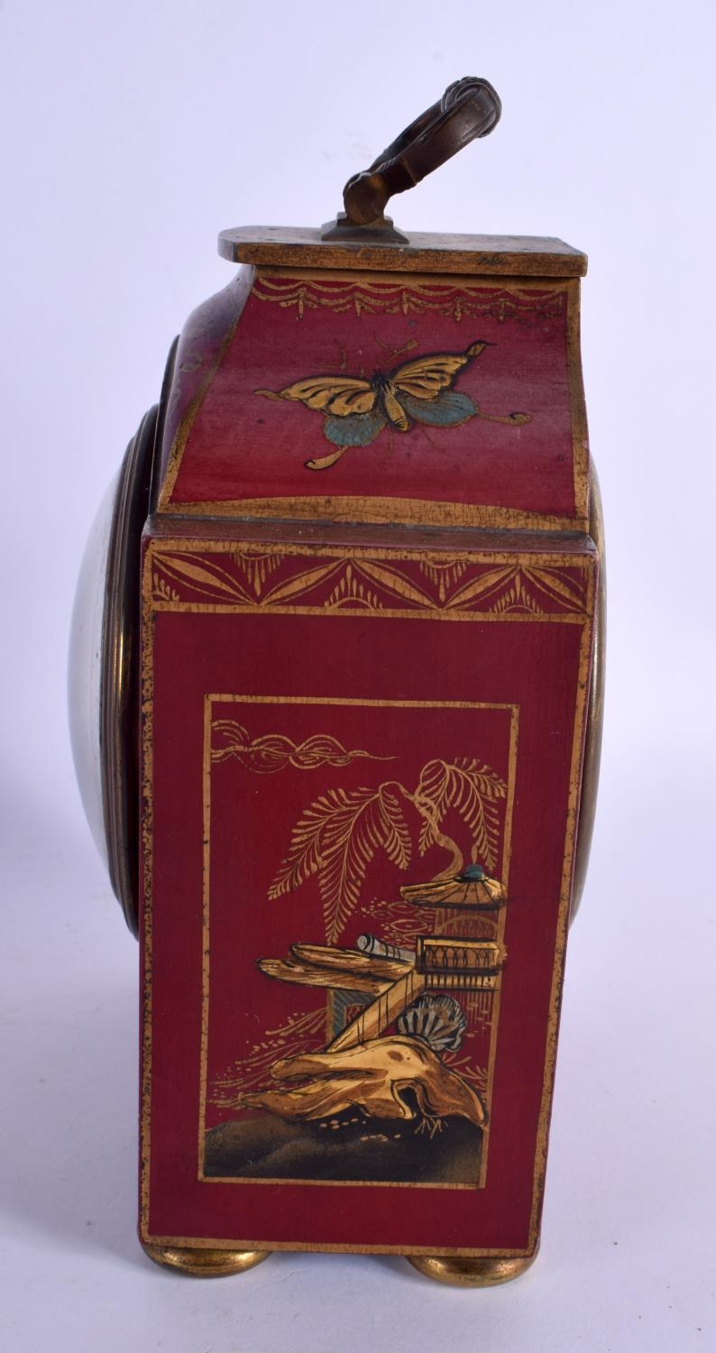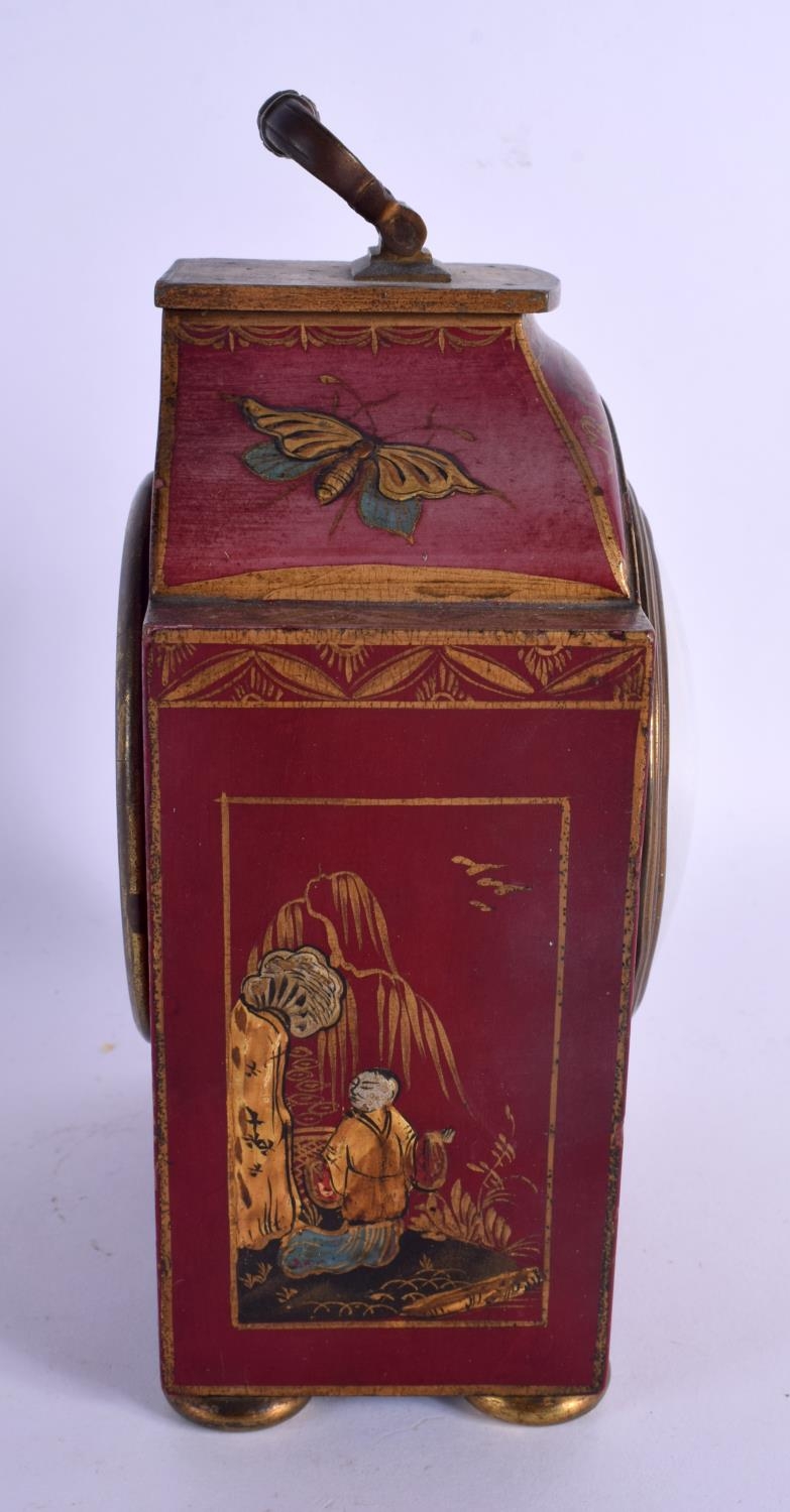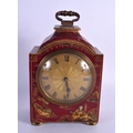 A GEORGE III STYLE COUNTRY HOUSE RED LACQUER MANTEL CLOCK decorated with figures. 21 cm x 11 cm inc handle.