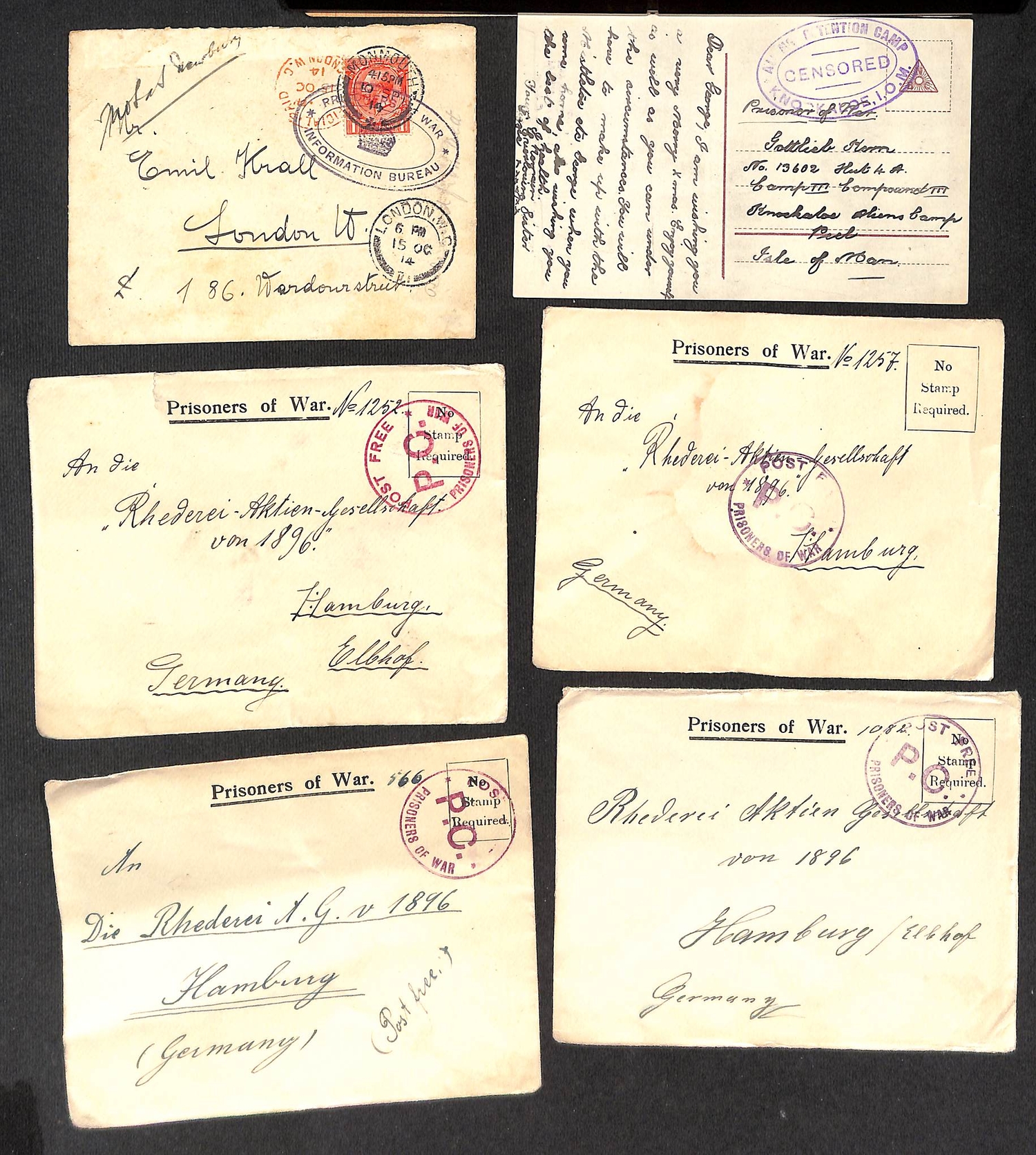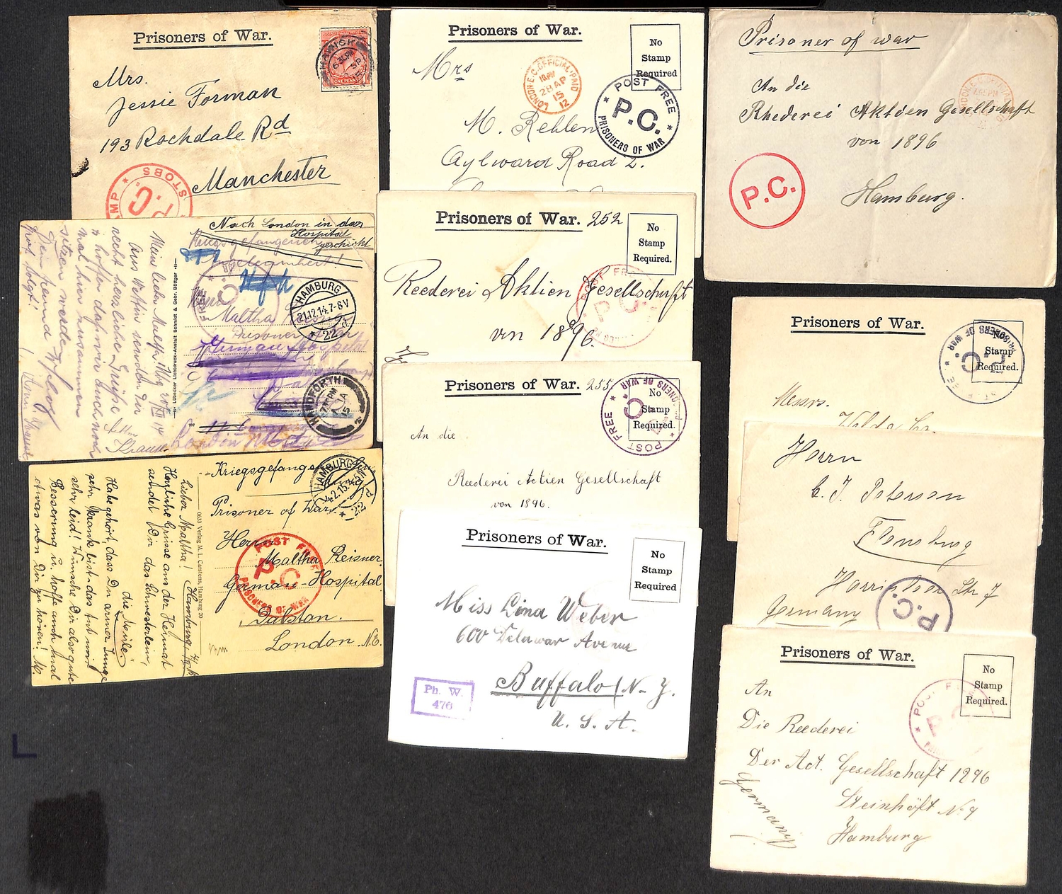 1914-c.1917 Covers and cards including 1914 (Sep 10) cover from Monmouth to London endorsed "not at Newbury" with London Official Paid c.d.s (Oct. 15, 35 days after posting) and Prisoners of War Information Bureau cachet, cards from Germany to the German Hospital at Dalston (2, one redirected from Handforth), covers from Oldcastle (2), Stobs Hospital, Douglas, Lancaster (2), Connaught Hospital Aldershot, etc. (17).