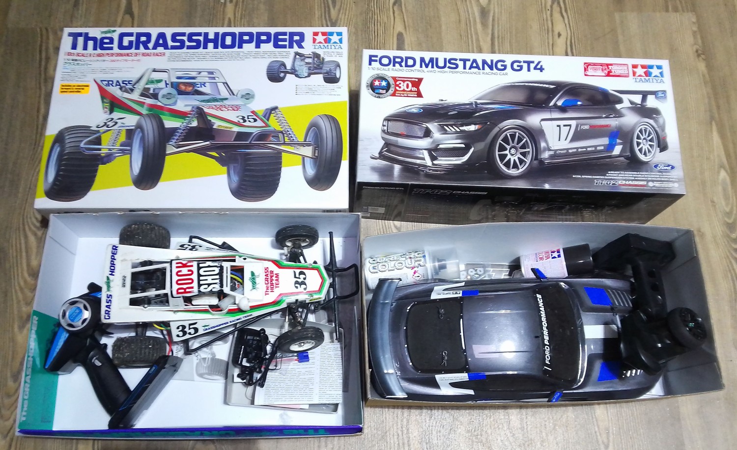 Two Tamiya RC model cars; Grasshopper and Ford Mustang GT4