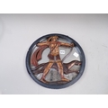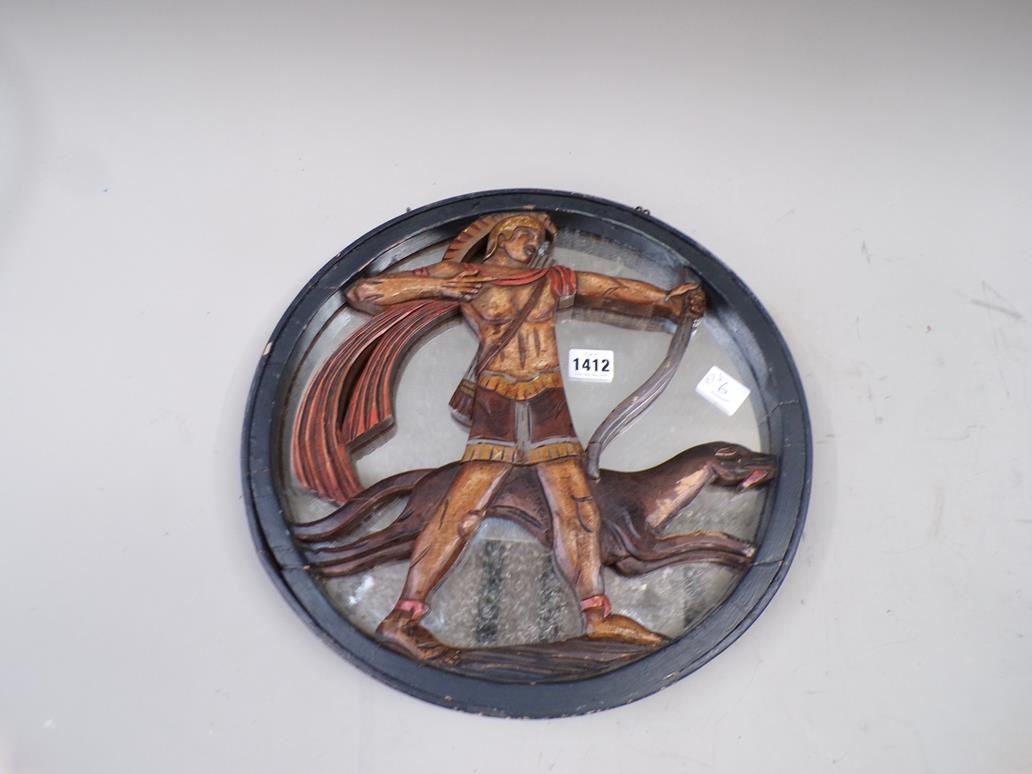 CARVED AND PAINTED WOODEN MIRROR BACK HERCULANEUM HUNTING SCENE 37cms DIA