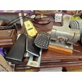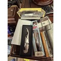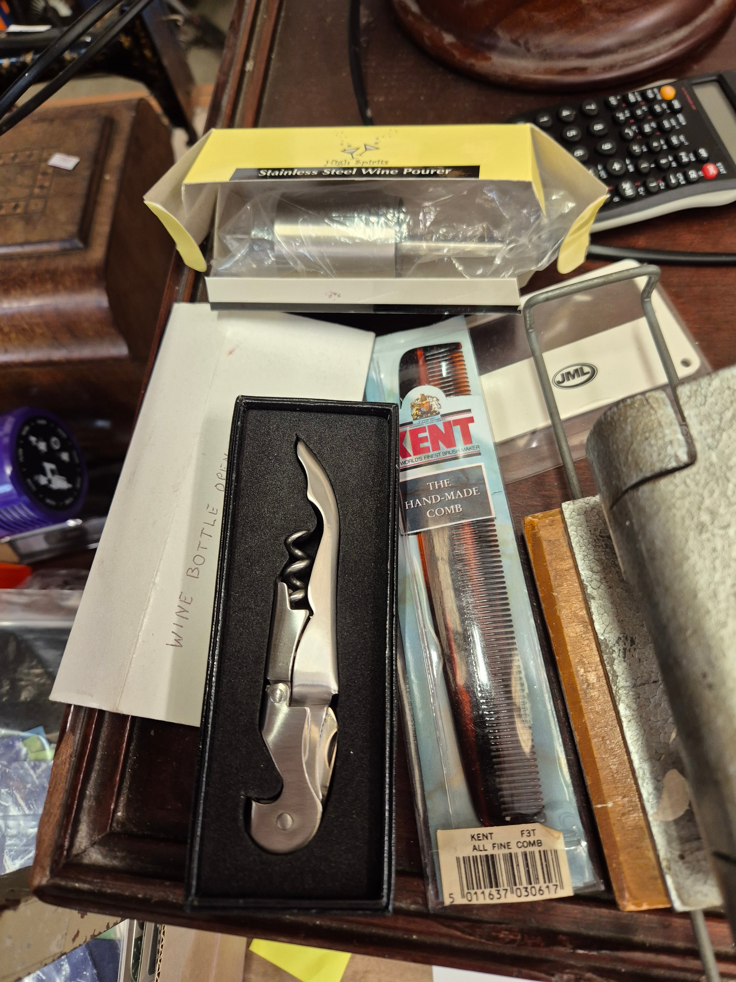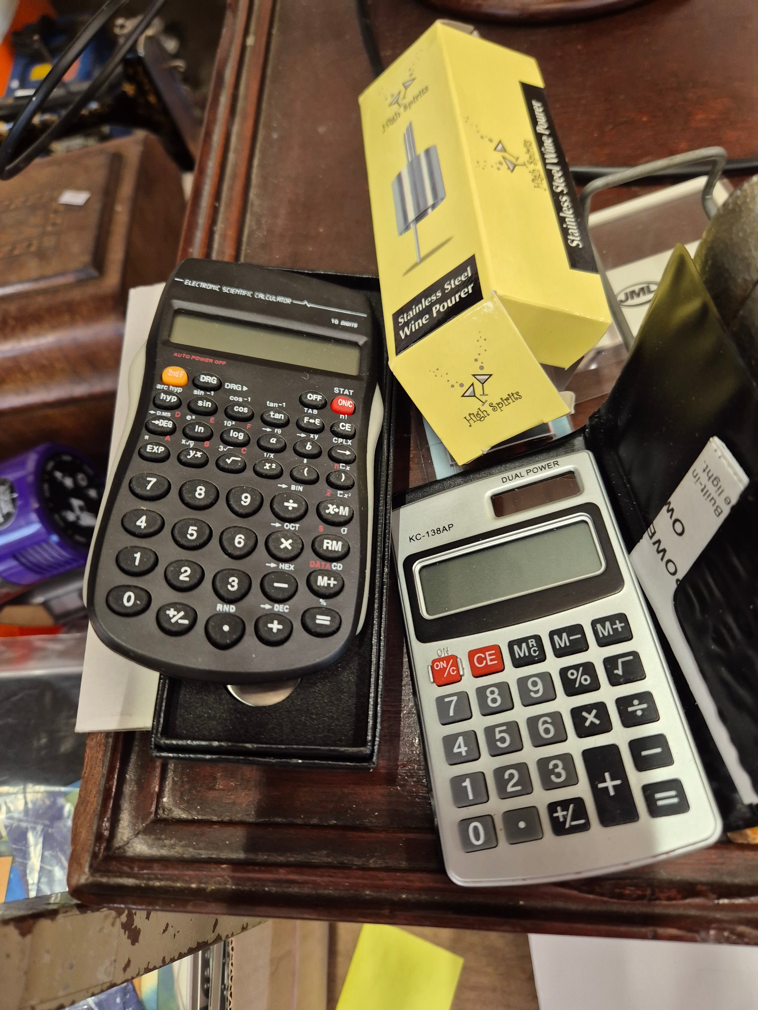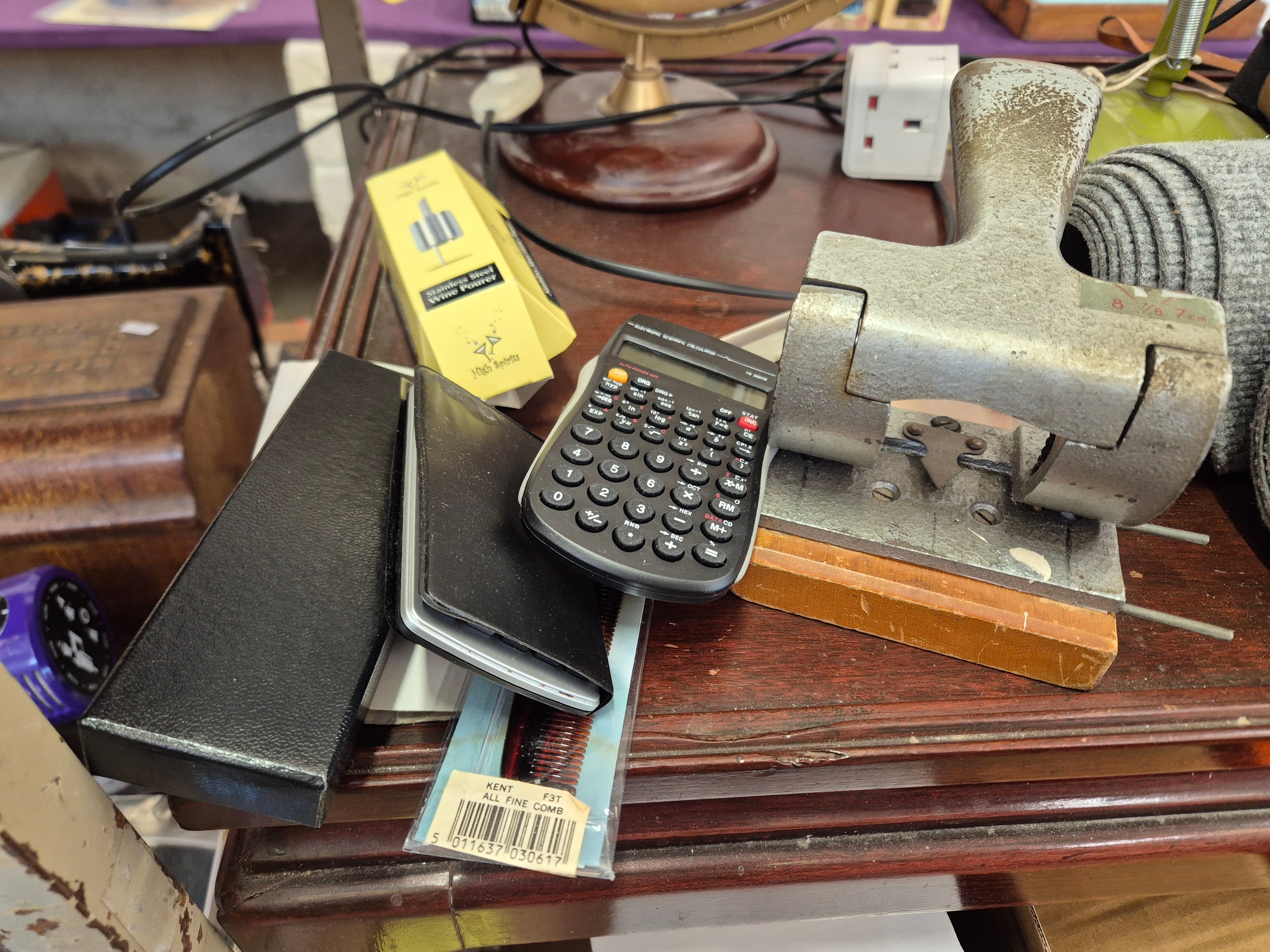 Collection of stationery to include a Vintage hole punch, scientific calculator and a dual power calculator plus wine opener and pourer and a comb