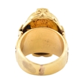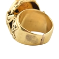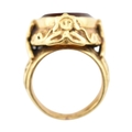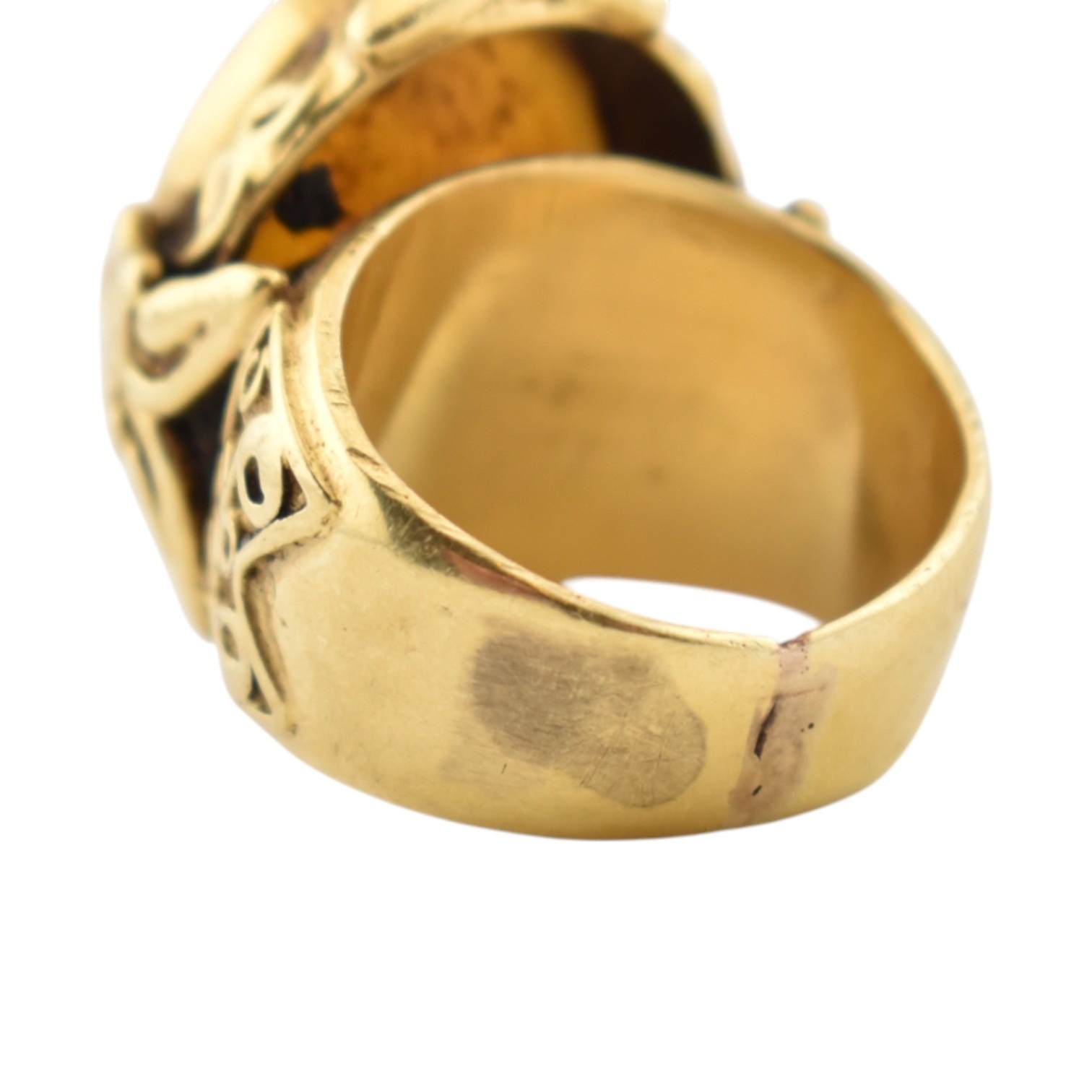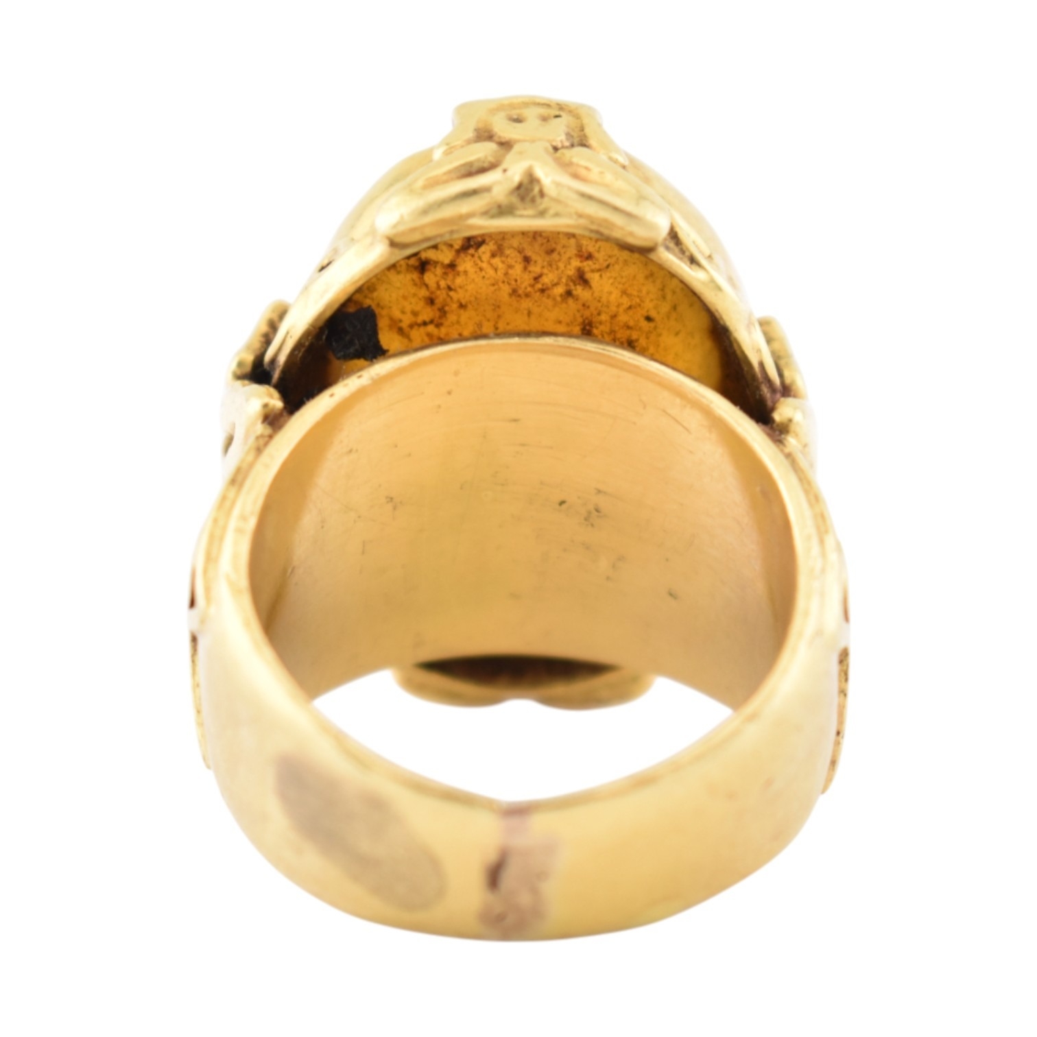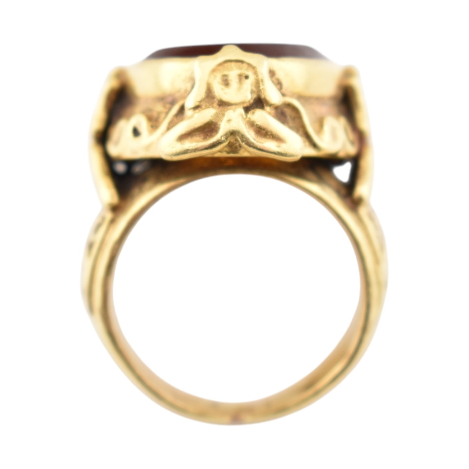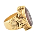 A gold intaglio ring. The ring with a central intaglio depicting a warrior set within an ornate mount embellished with figures of praying deities with scroll decoration. Unmarked tests indicate gold 18ct and 14ct within the area where the ring has been resized. Weight 18.9g. Size L.5