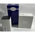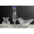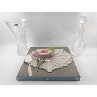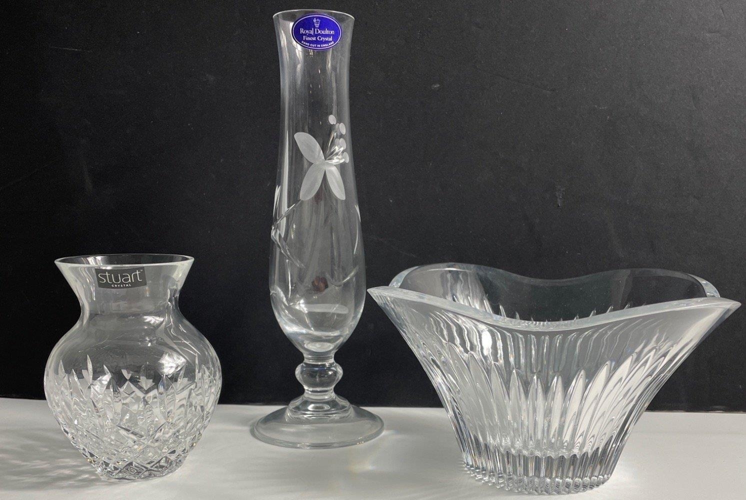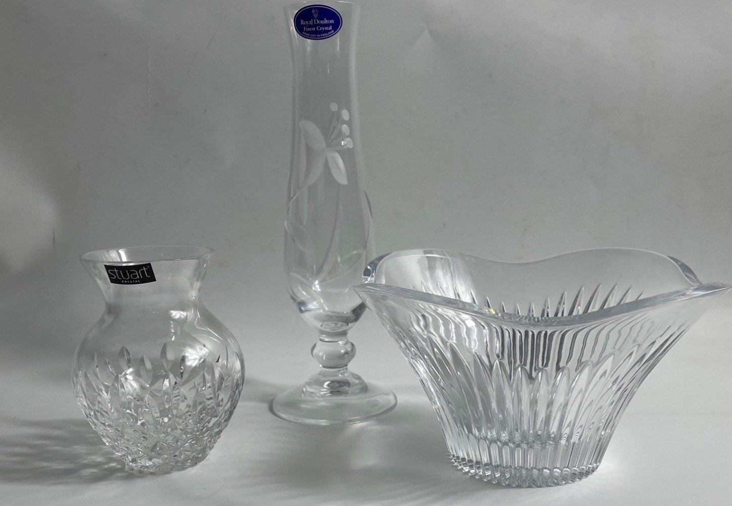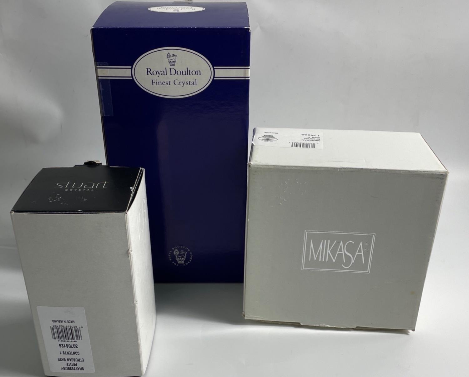 A STUARTS crystal vase boxed 10cm high with ROYAL DOULTON CRYSTAL stem vase still with its original box height 21cm with also a boxed as new MIKASA SLOVENIAN BOWL 17cm diameter