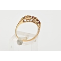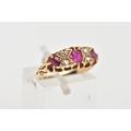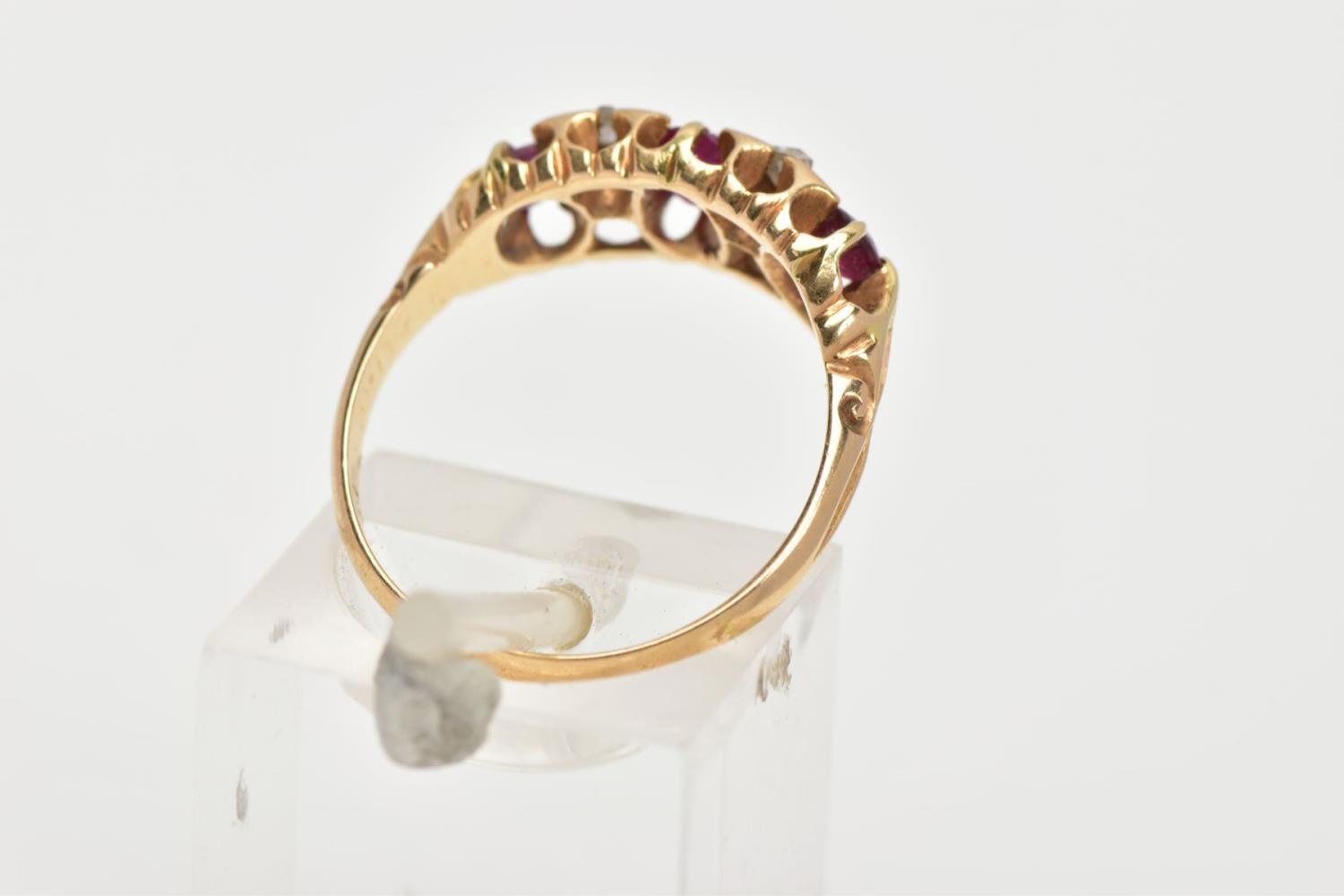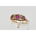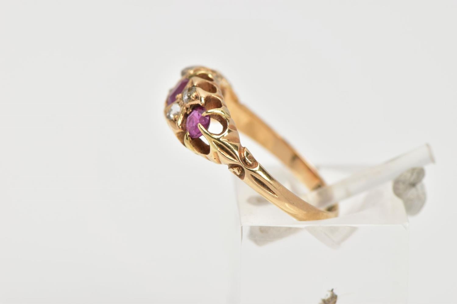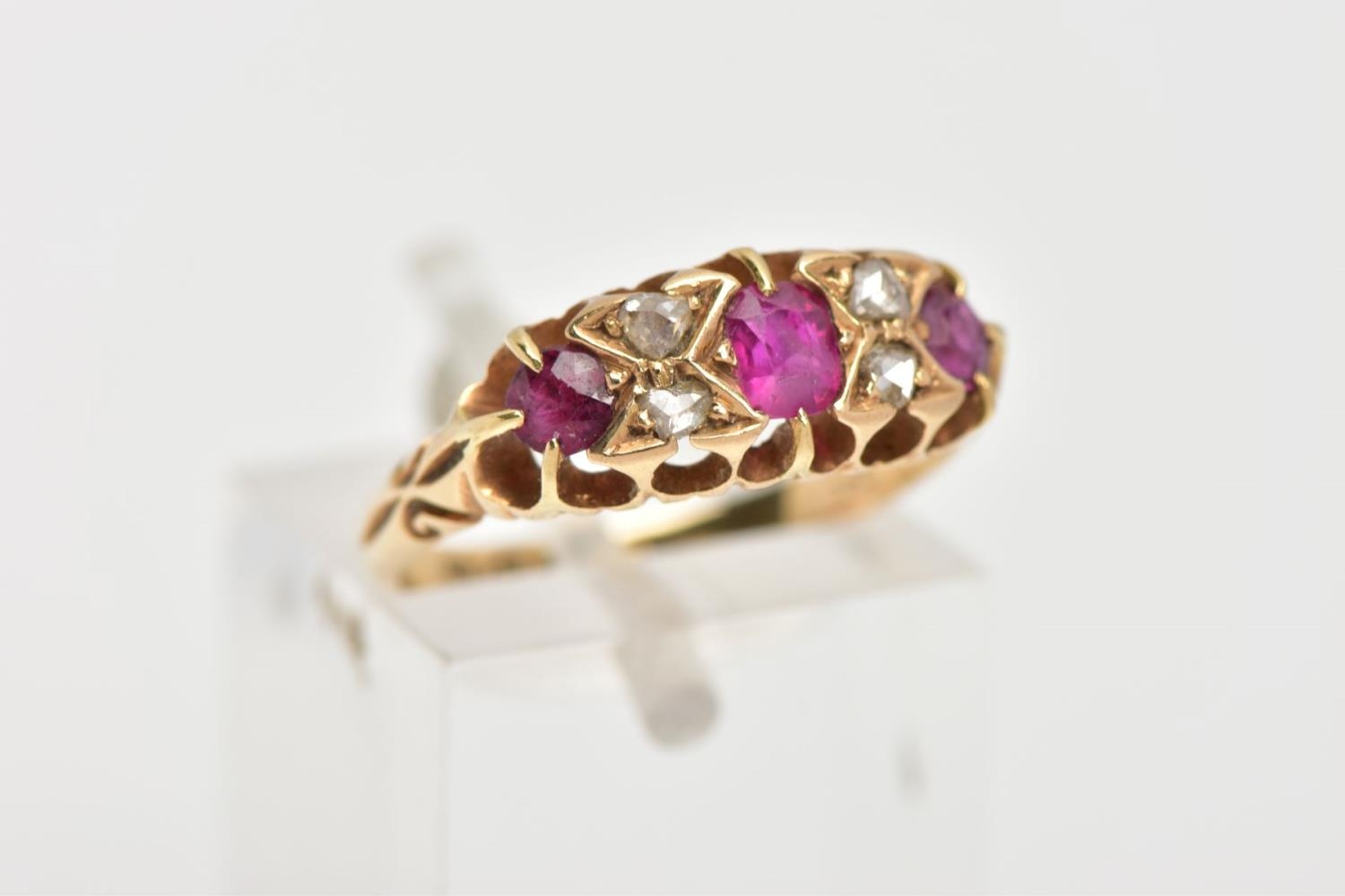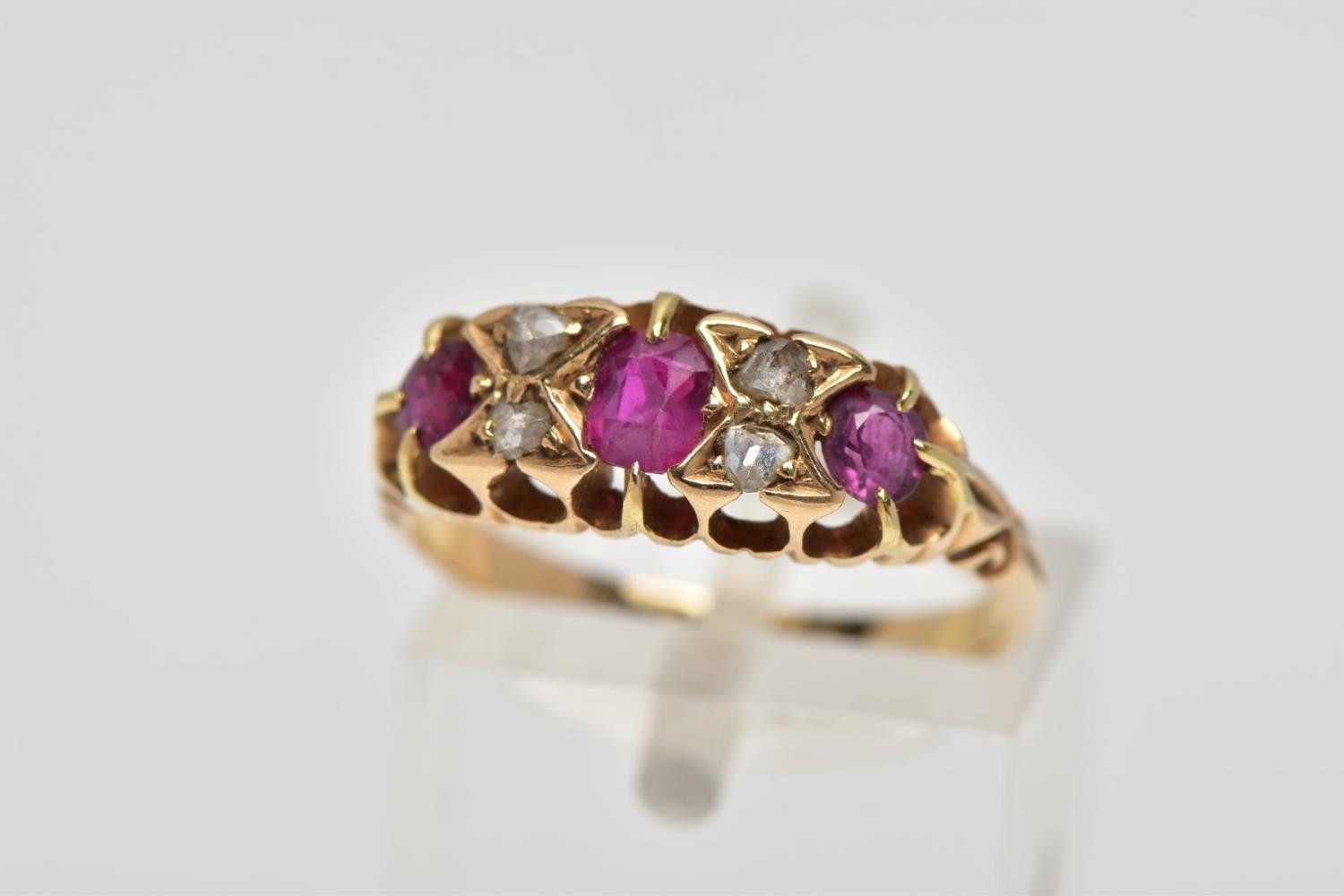 AN EARLY 20TH CENTURY RUBY AND DIAMOND RING, 18ct gold ring set with one cushion cut ruby and two circular cut rubies, also set with four rose cut diamonds, in a gypsy style setting with scrolling detail on a polished band, hallmarked 18ct gold Chester 1907, ring size M, approximate gross weight 3.1 grams, (condition report: general moderate wear, some abrasions on facet edges, signs of possible treatment on rubies, overall condition good)