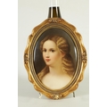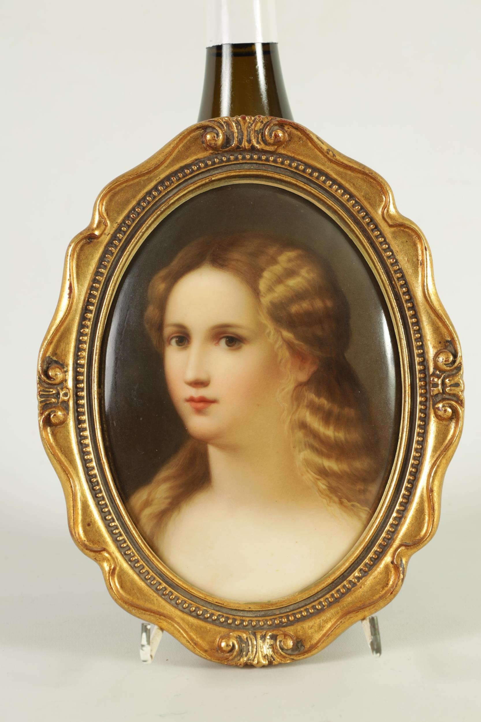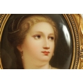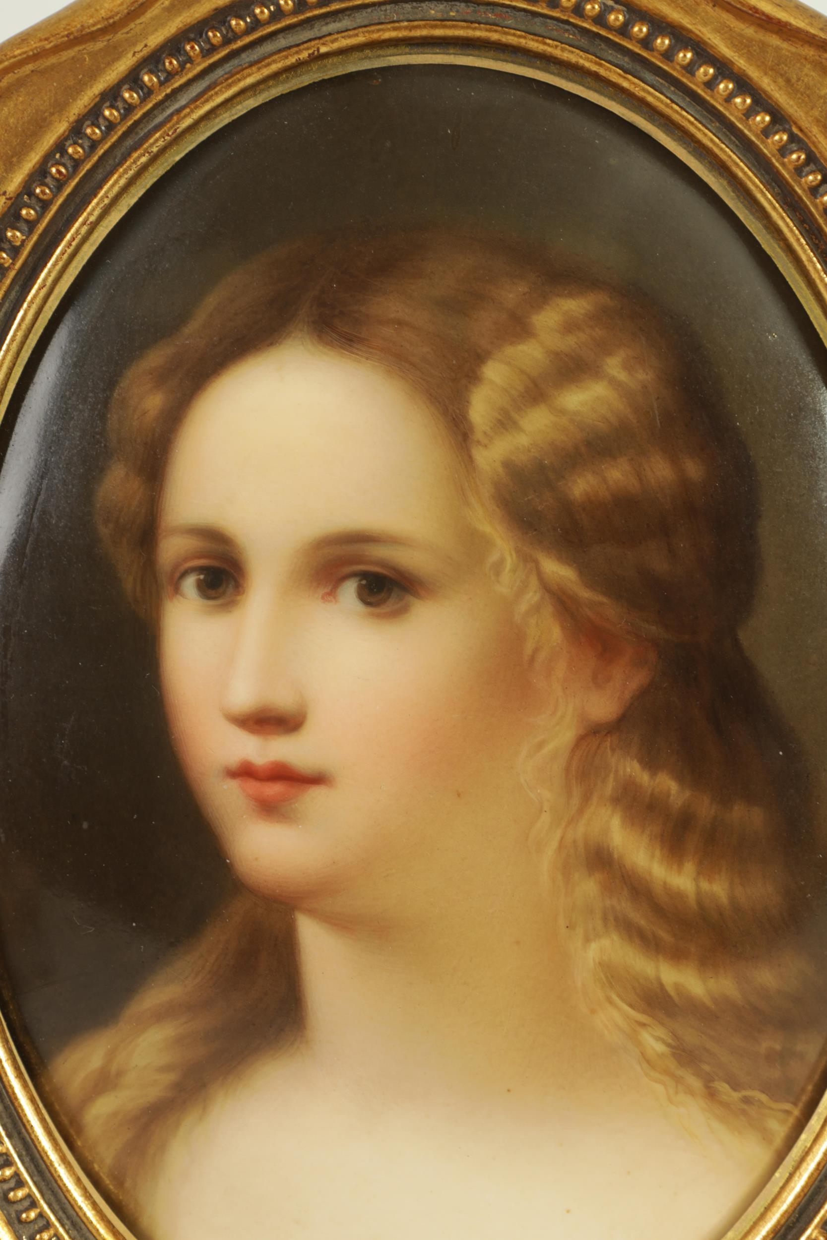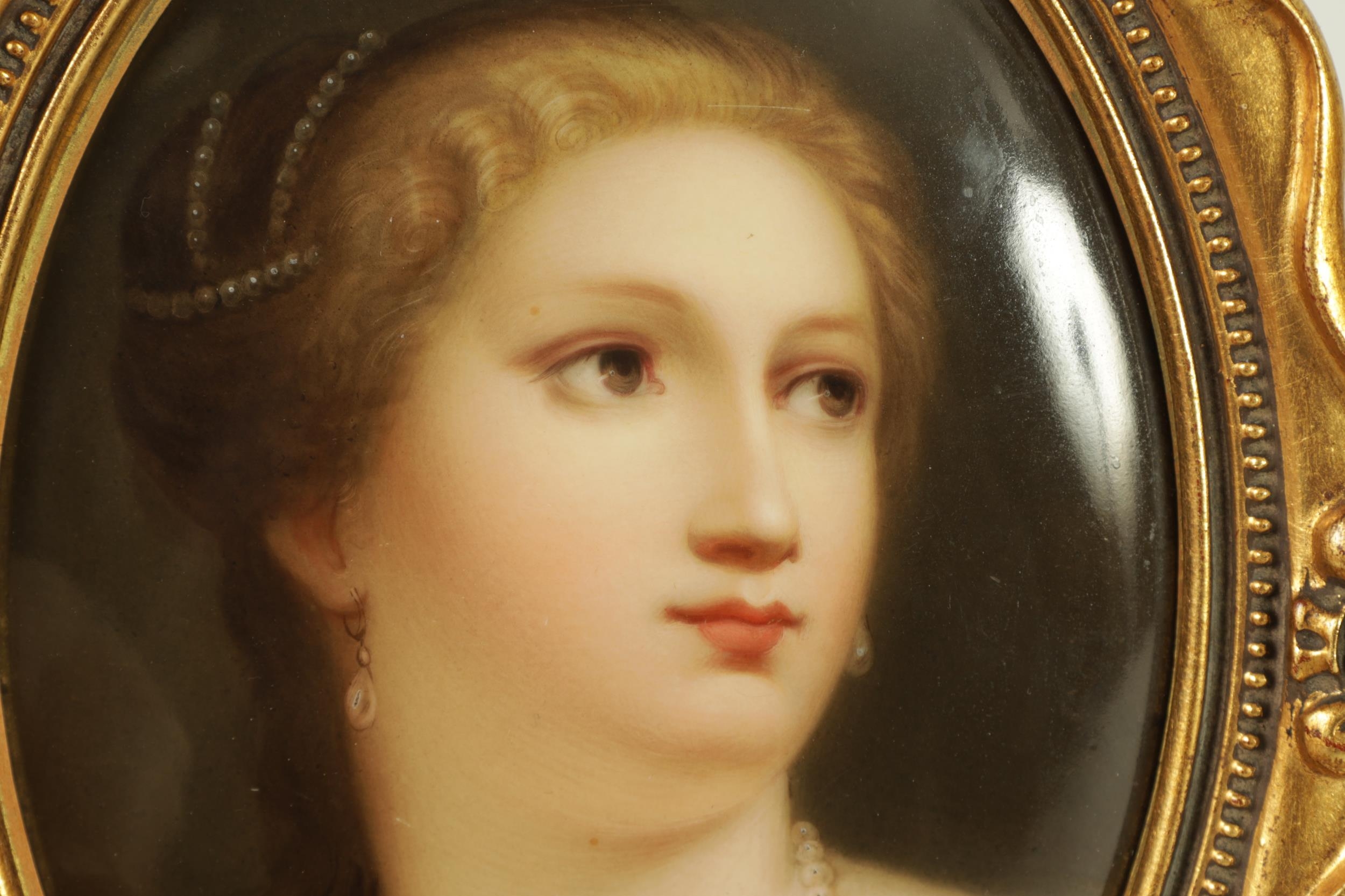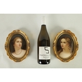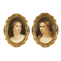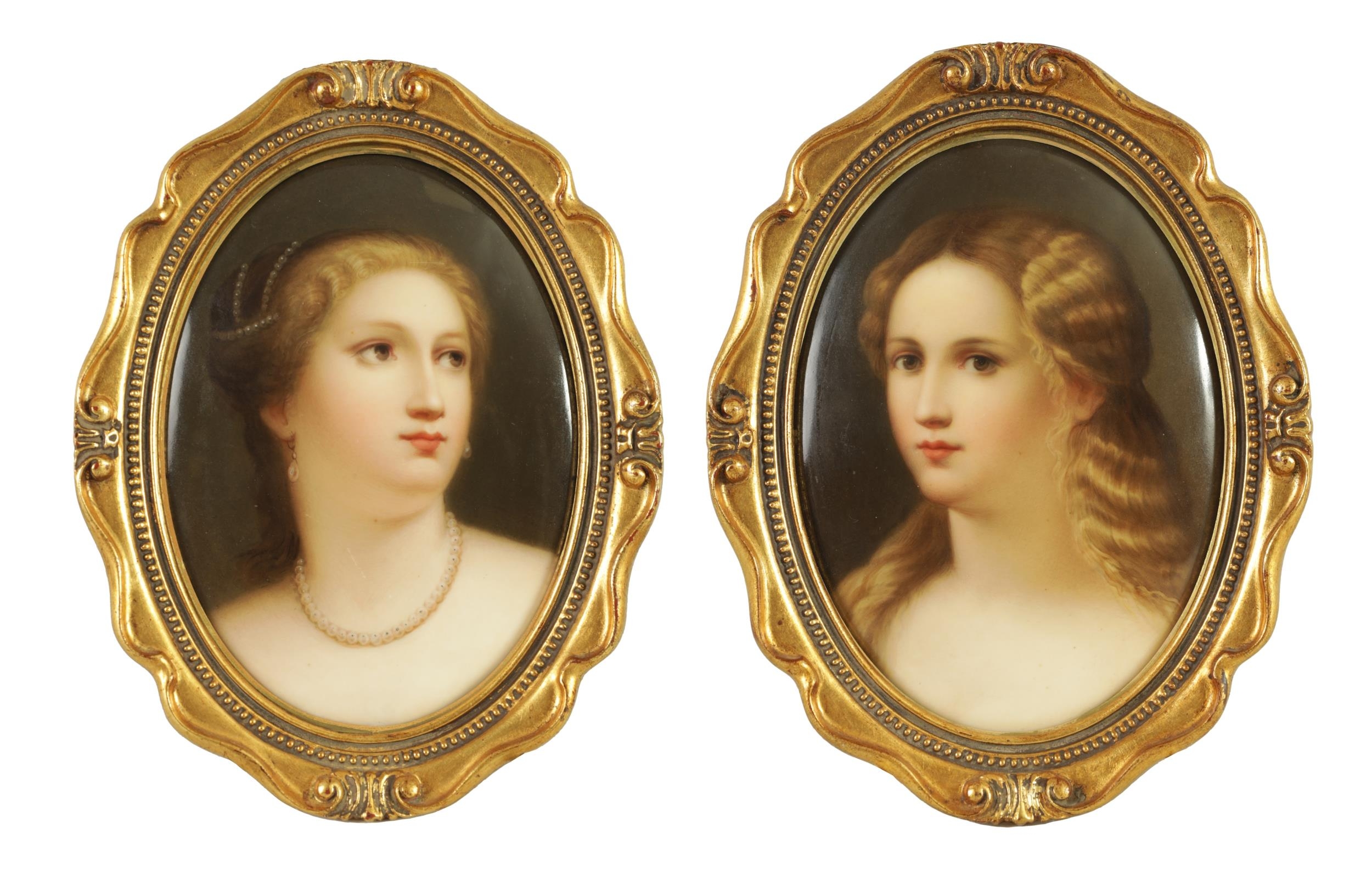 A PAIR OF LATE 19TH CENTURY VIENNA OVAL CONVEX HANGING PLAQUES each depicting bust portraits of young ladies, scroll-edged moulded gilt frames. (17cm high 12cm wide)