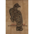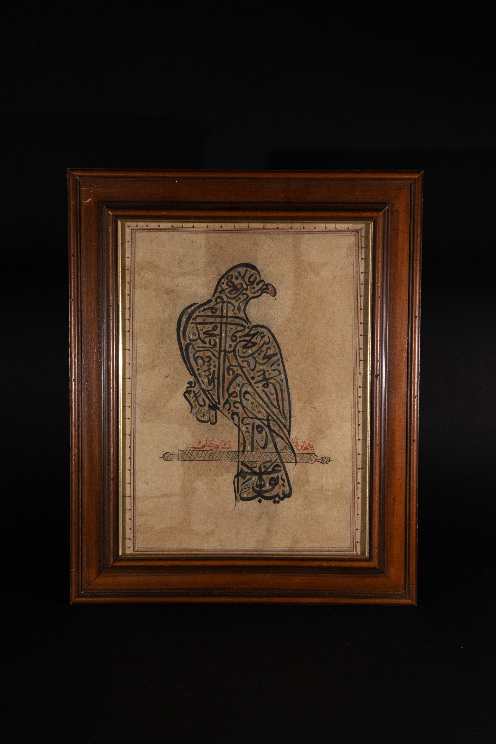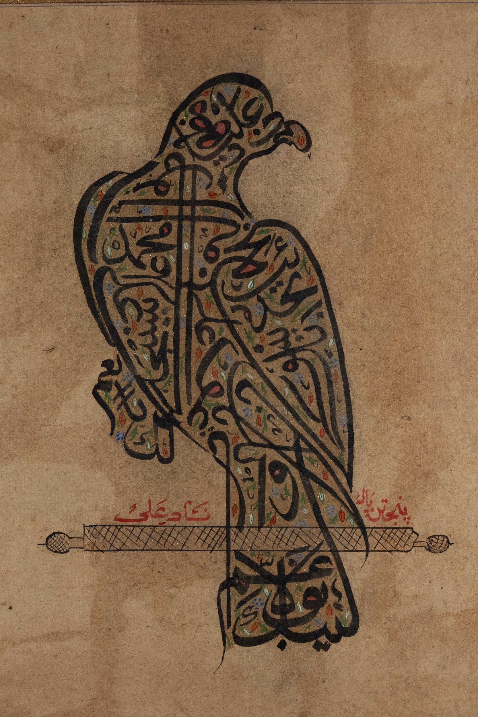 A Persian Calligraphic Falcon, Depicting the Nada 'Ali Quatrain, 19th Century - This Islamic zoomorphic calligraphic artwork depicts a large bird, likely a falcon or eagle, formed entirely from dense black Arabic script with interspersed small, multicolored floral or leaf motifs. The bird is perched upon a decorative horizontal bar. Executed in ink and pigment on aged, light brown paper. Below the bird, two distinct red Arabic inscriptions are visible: the left reads 'نَادِ عَلِيًّا' (Nād `Alīyan), translating to 'Call Ali, ' which is the beginning of the Nada 'Ali quatrain. The right inscription reads 'يا حسن' (Yā Hasan) above 'يا حسين' (Yā Husayn), translating to 'O Hasan' and 'O Husayn, ' significant Shi'a invocations.