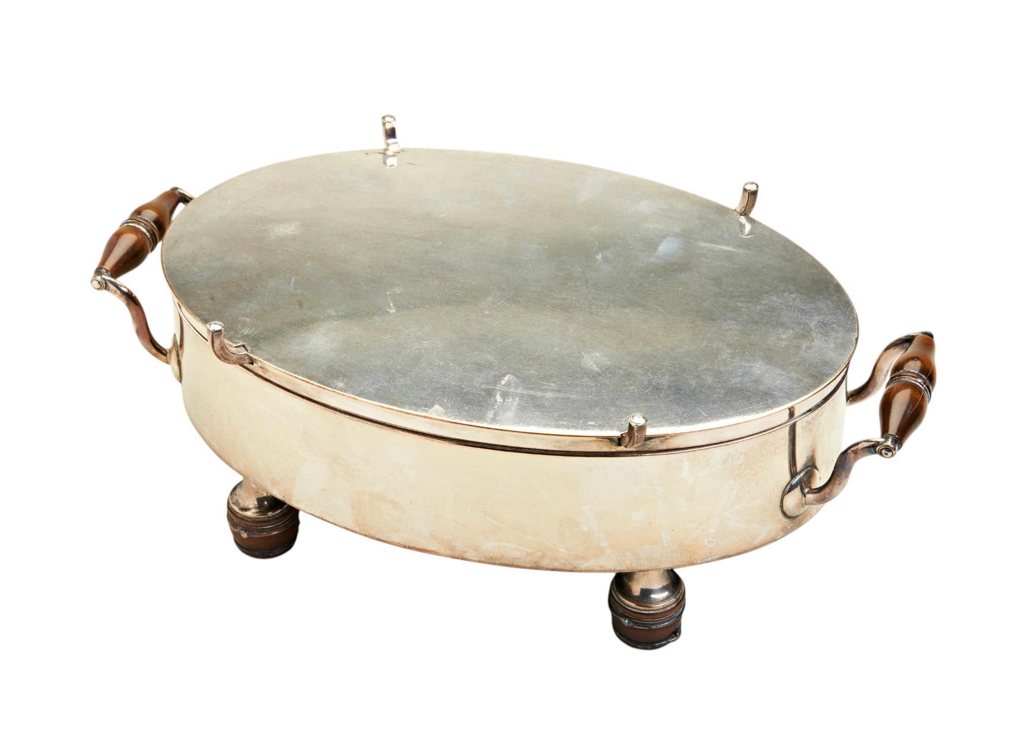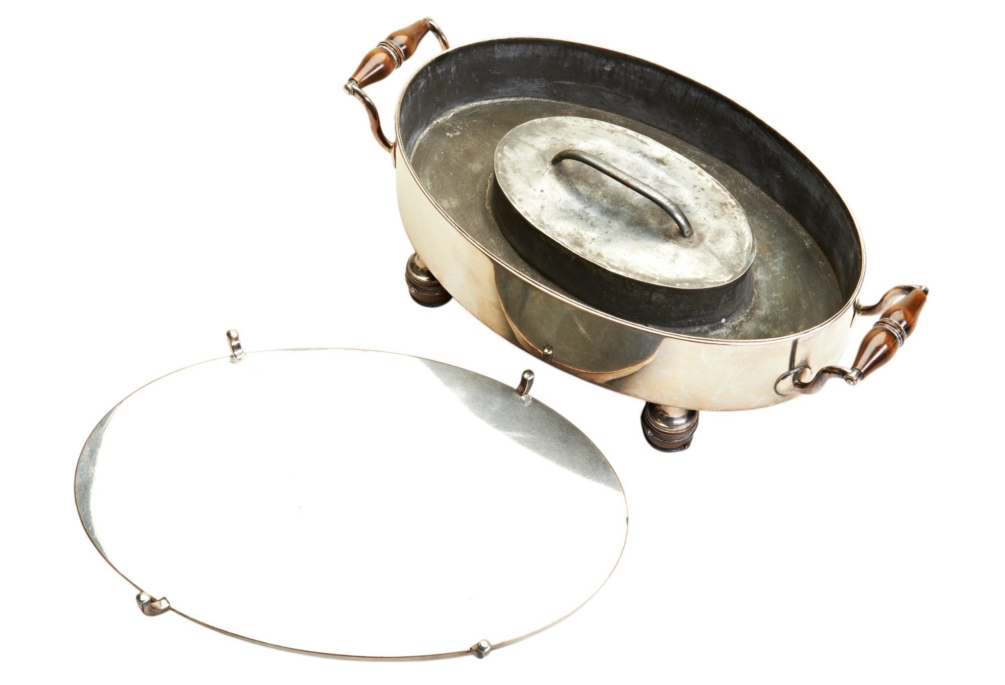 AN OLD SHEFFIELD PLATE WARMING STAND, C.1785. An unusual warming stand with turned wooden handles and feet. A very similar example appears in Fredrick Bradbury's History of Old Sheffield Plate on pp. 289. All appears to be complete and functional including the iron insert.