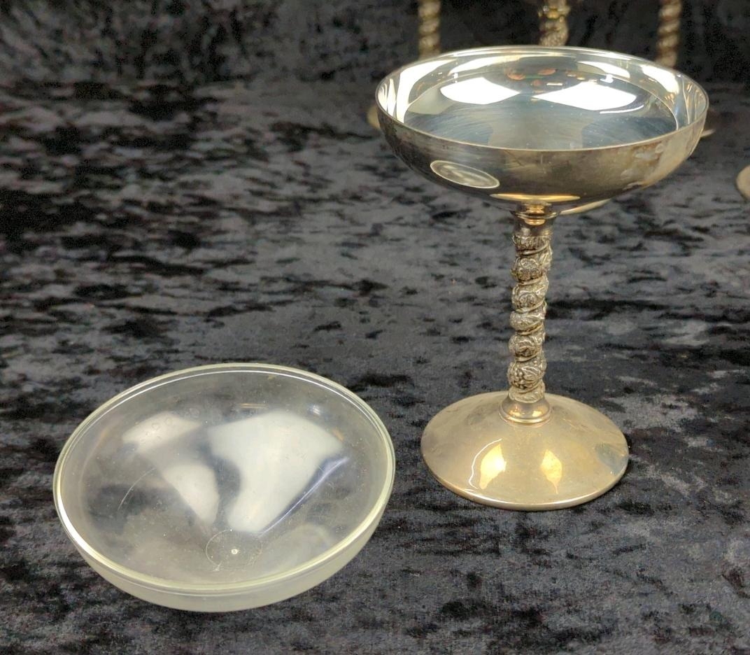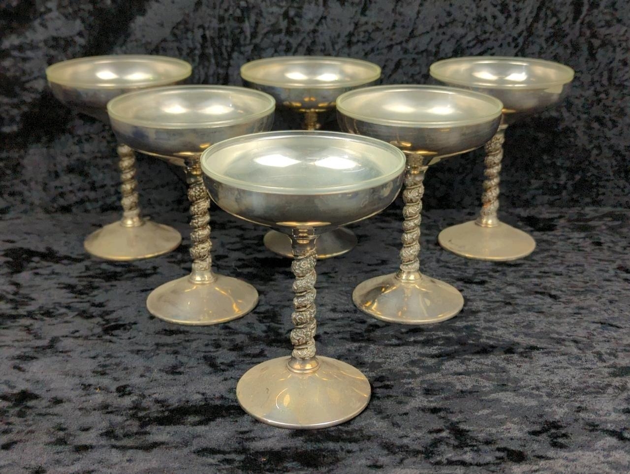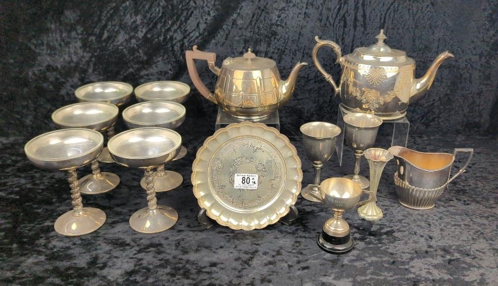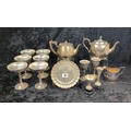Large collection of silver plate including teapots, and six coupes with plastic liners.