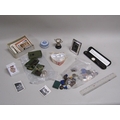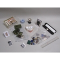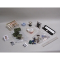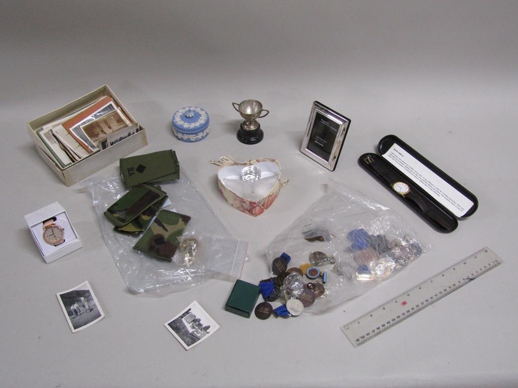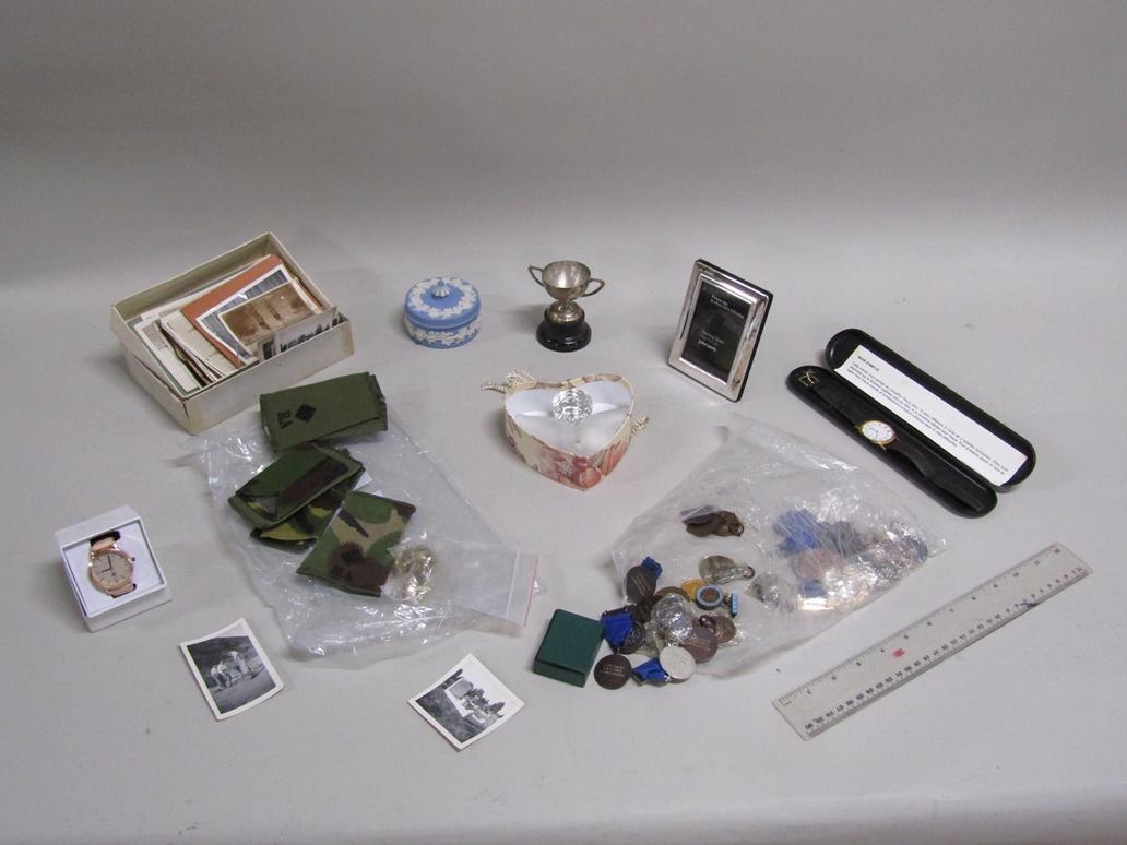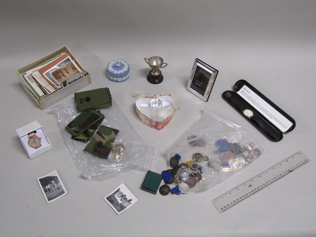 BADGES, COSTUME JEWELLERY, SILVER FRAMED PHOTOFRAME ETC