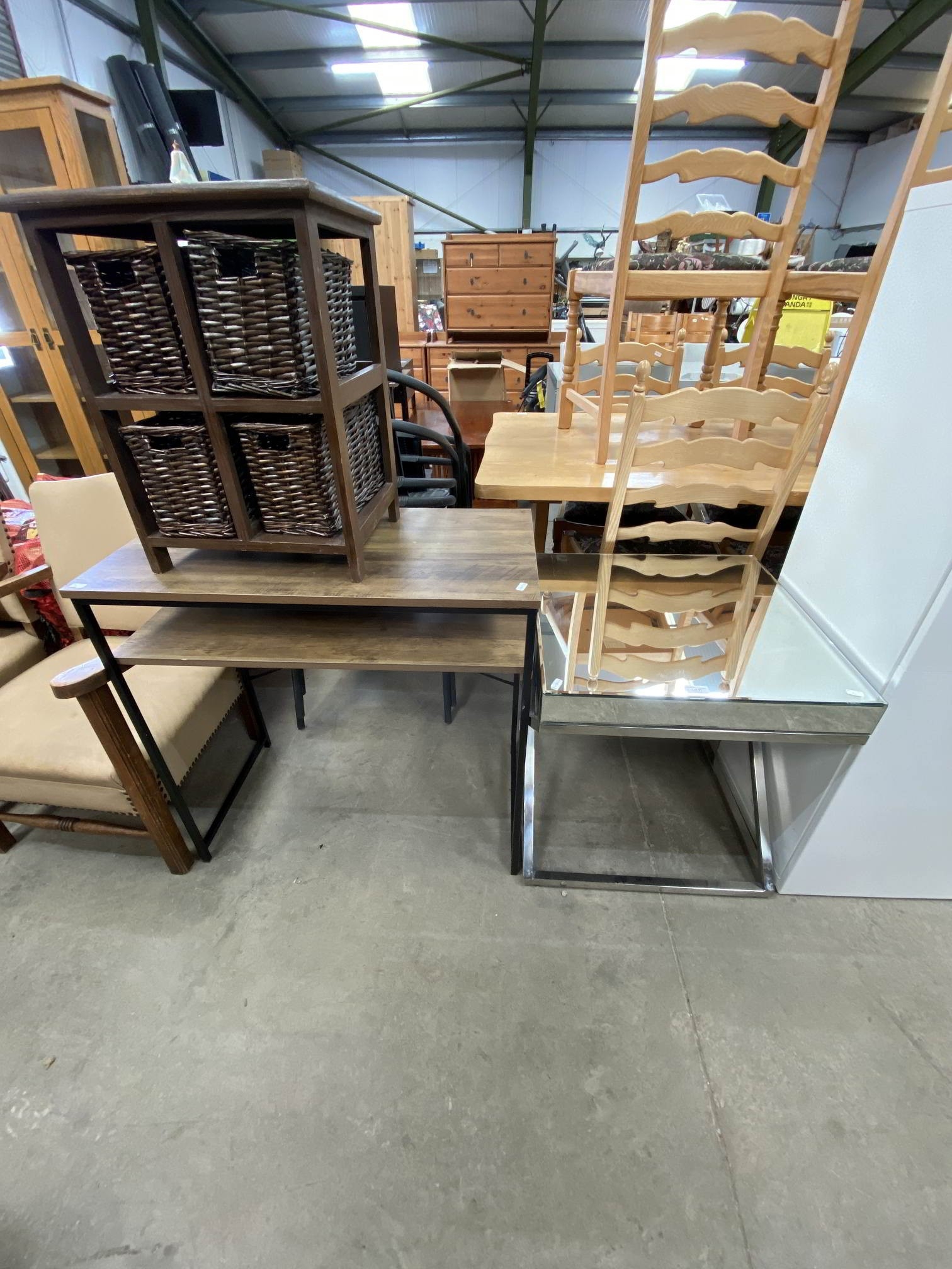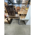 Contemporary chrome 'X' framed occasional table 51H 56W 56D, desk 75H 77W 40D & four drawer wicker unit 50H 38W 32D