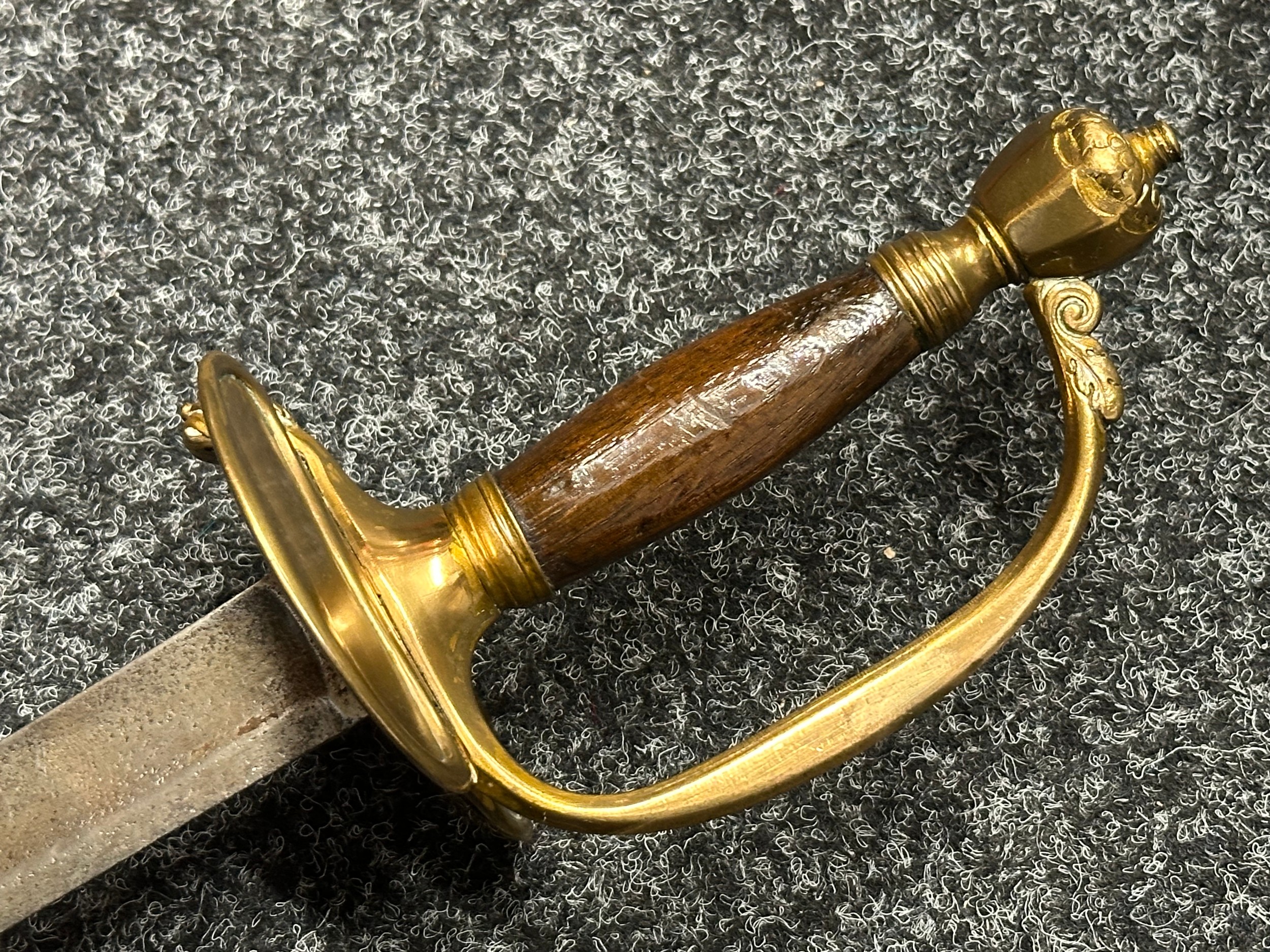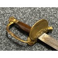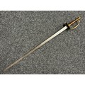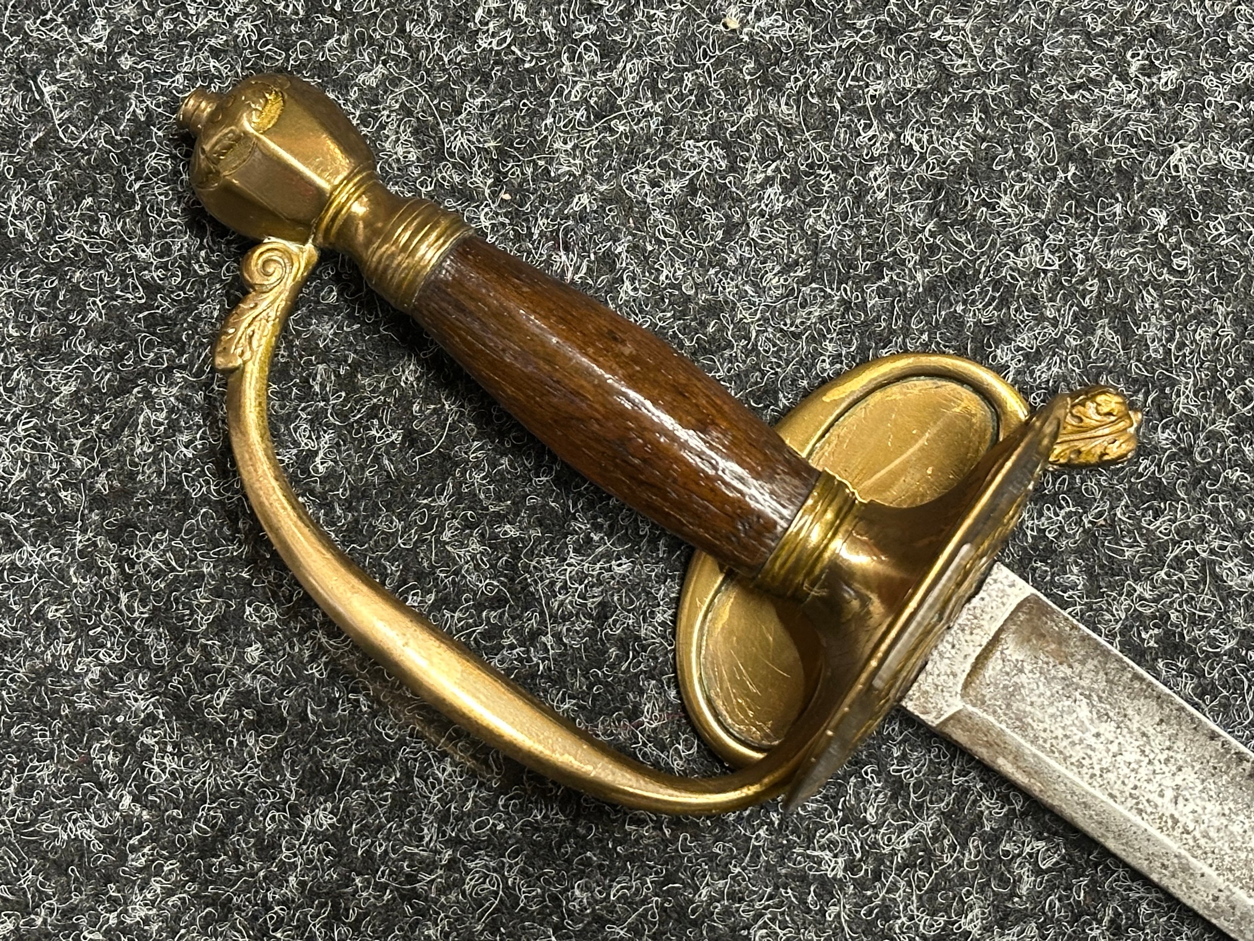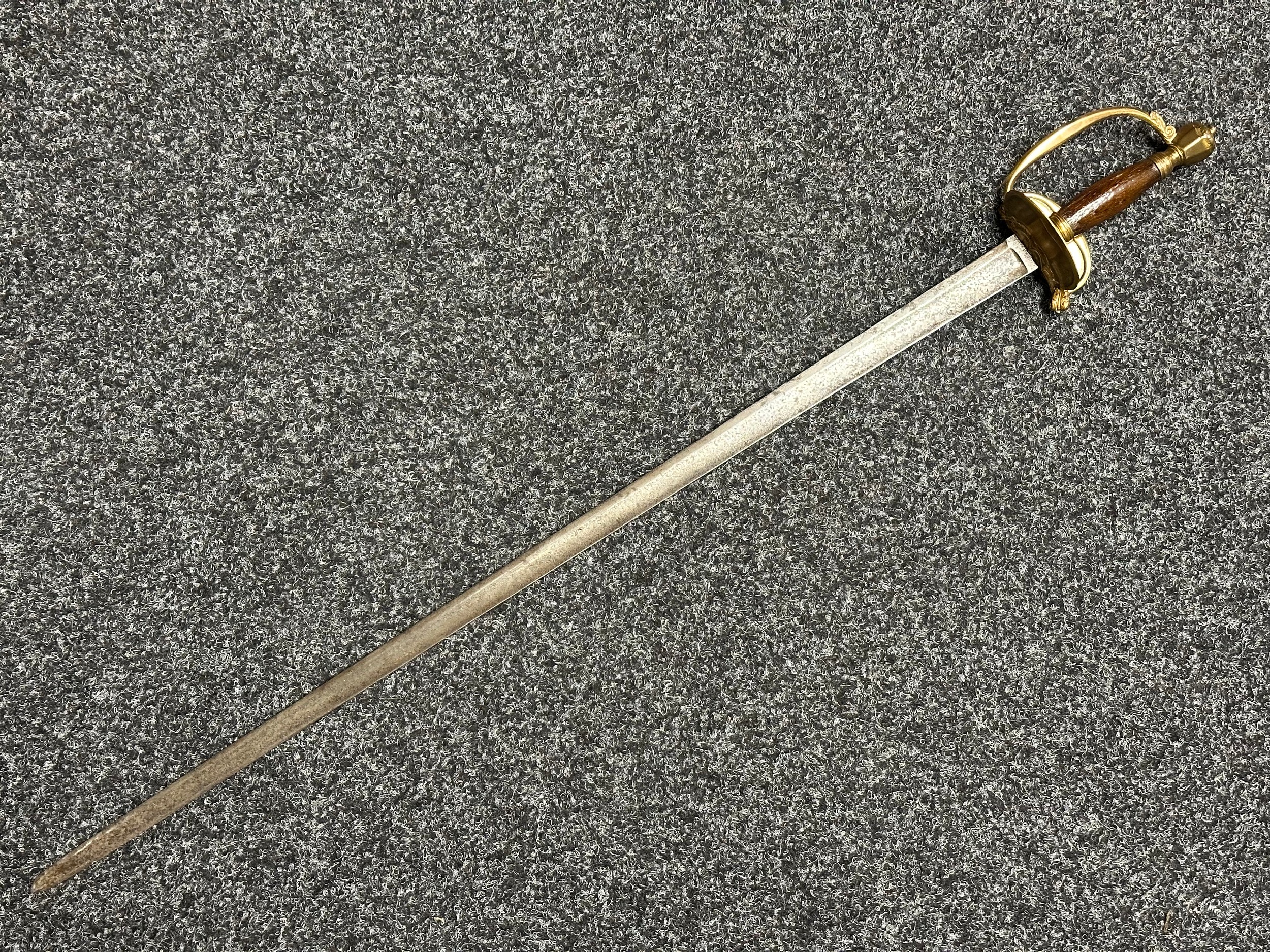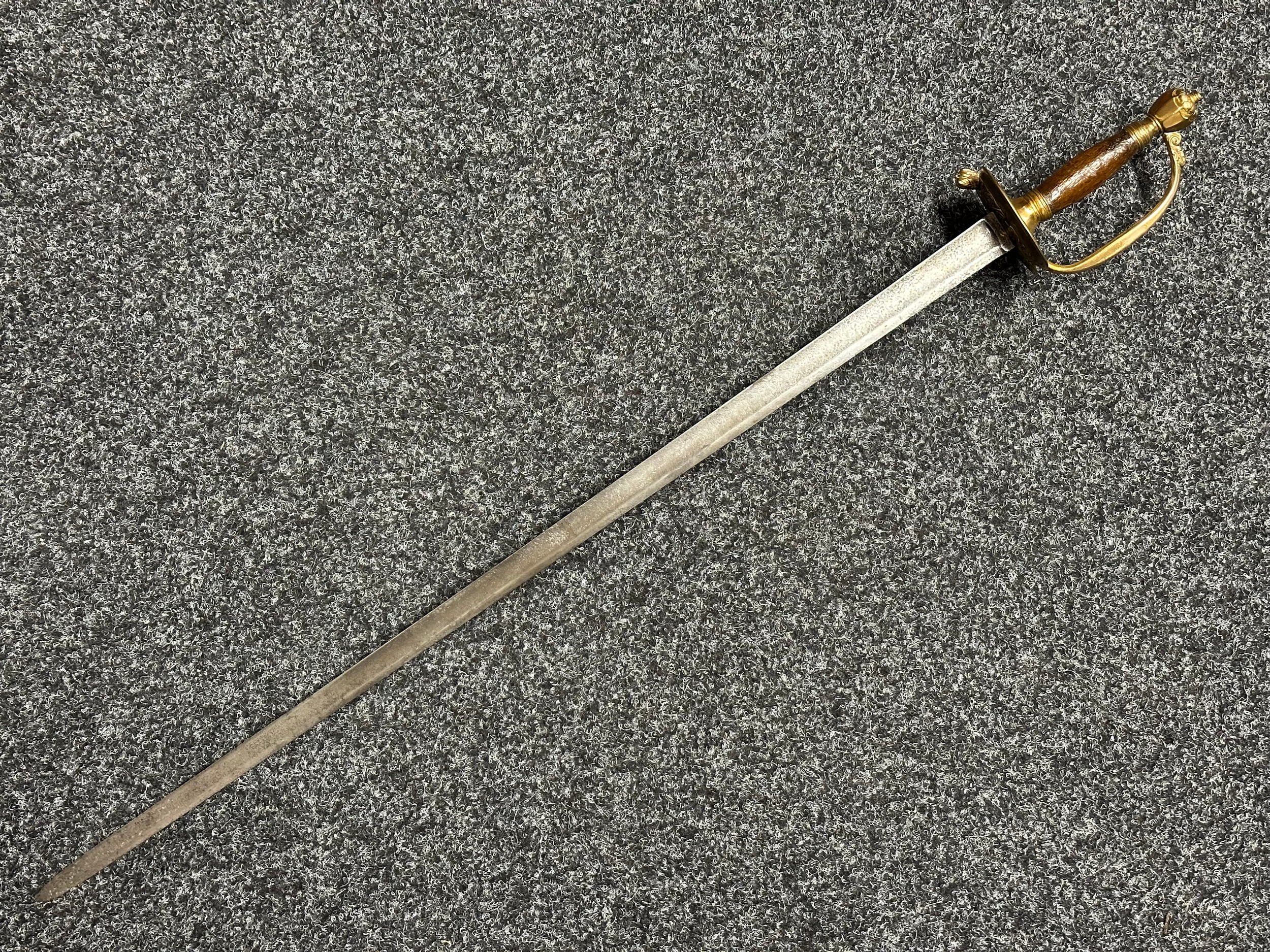 British 1796 Pattern Officers Sword with single edged fullered blade, unmarked, 800mm in length. Folding brass guard. Wooden grip. Overall length 960mm. No scabbard.