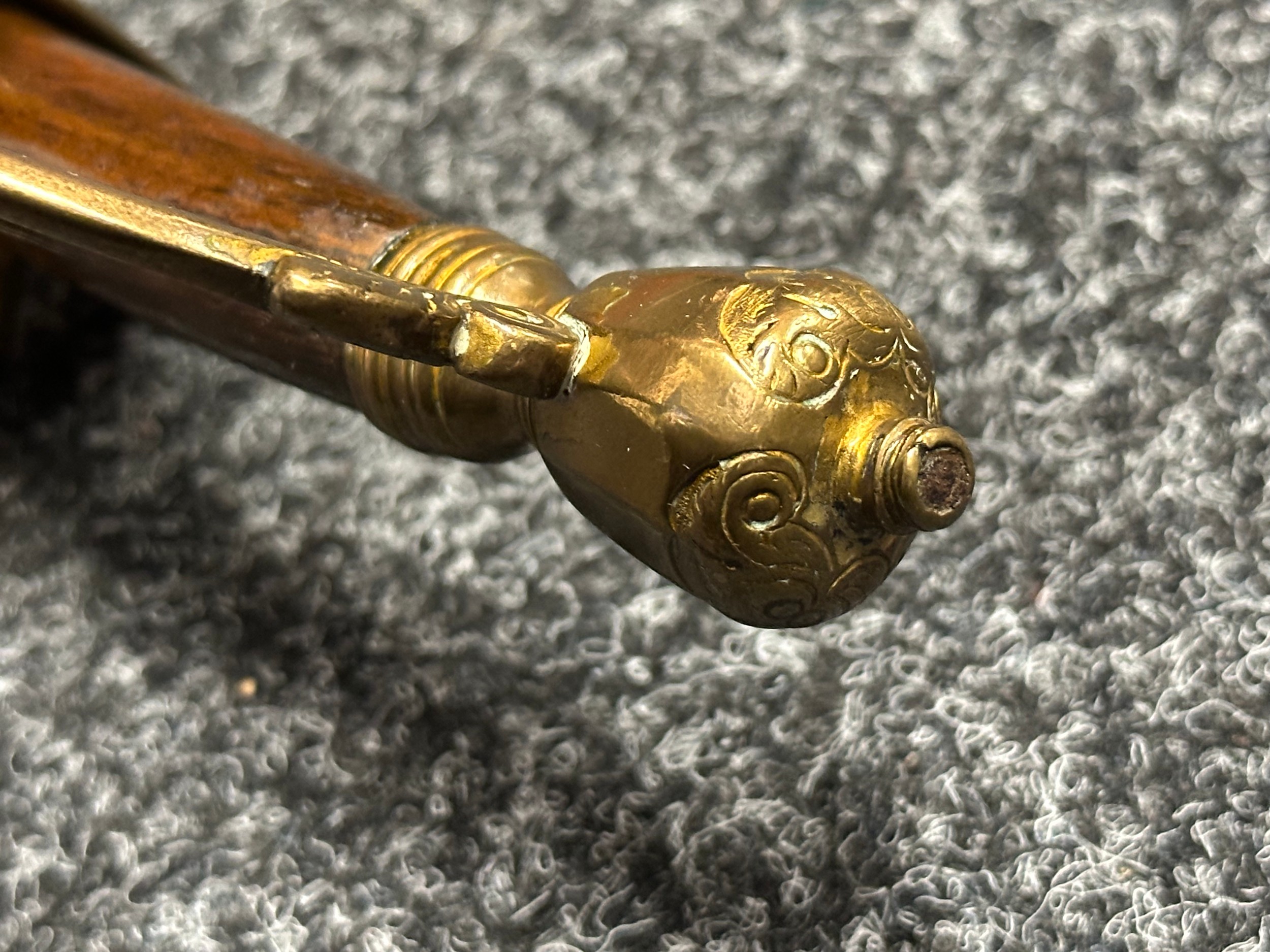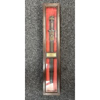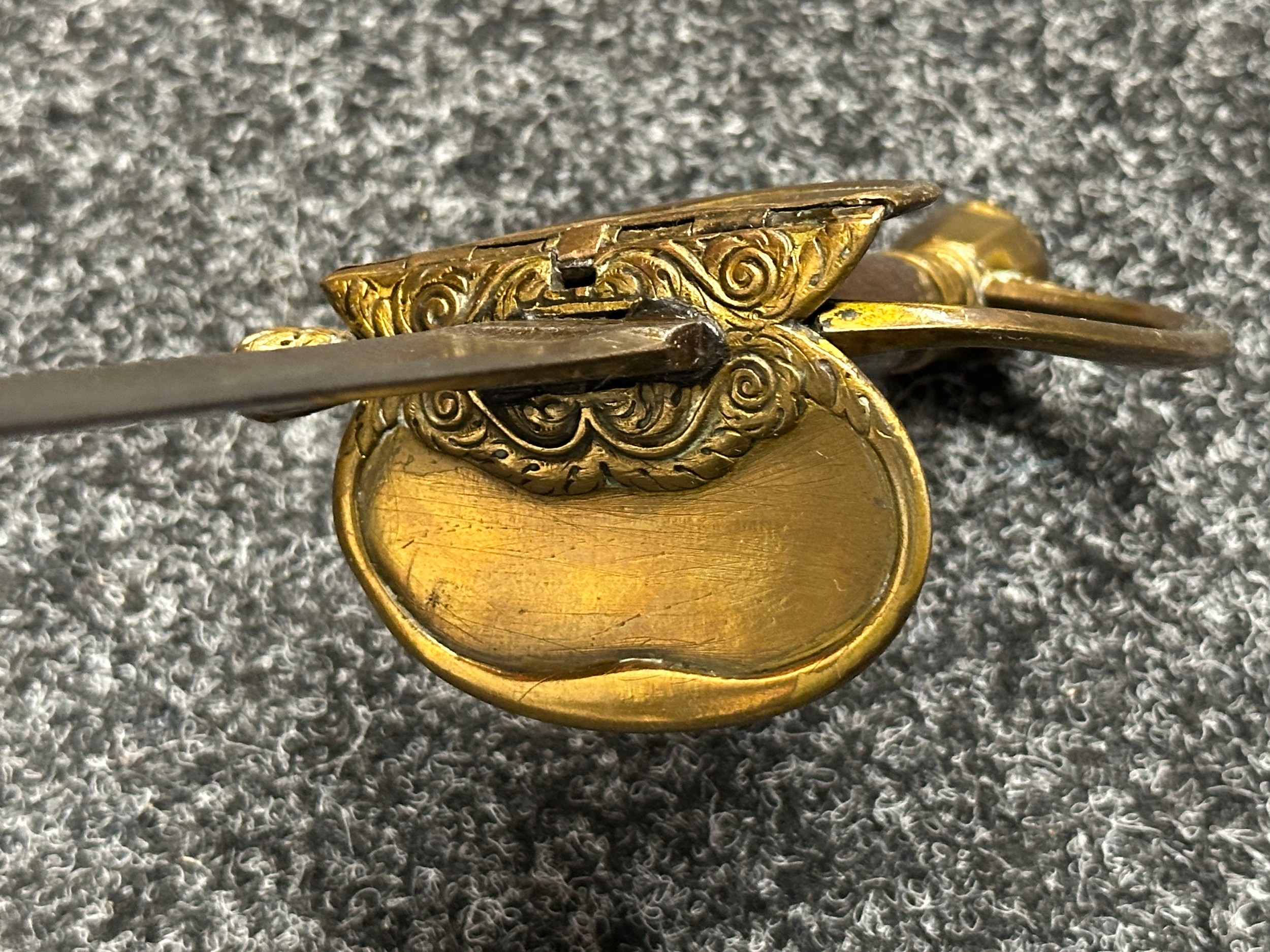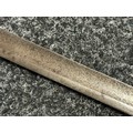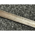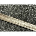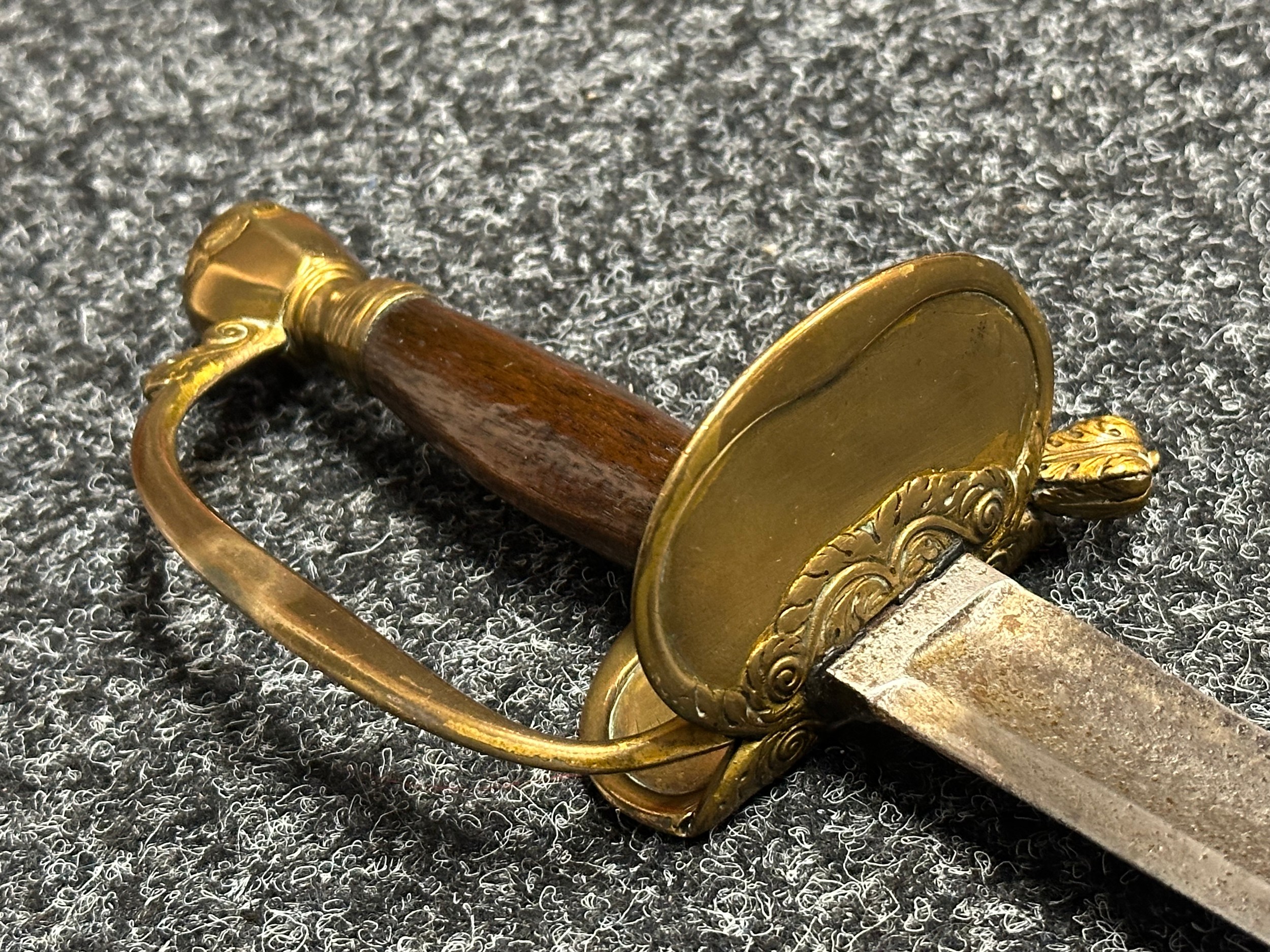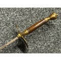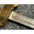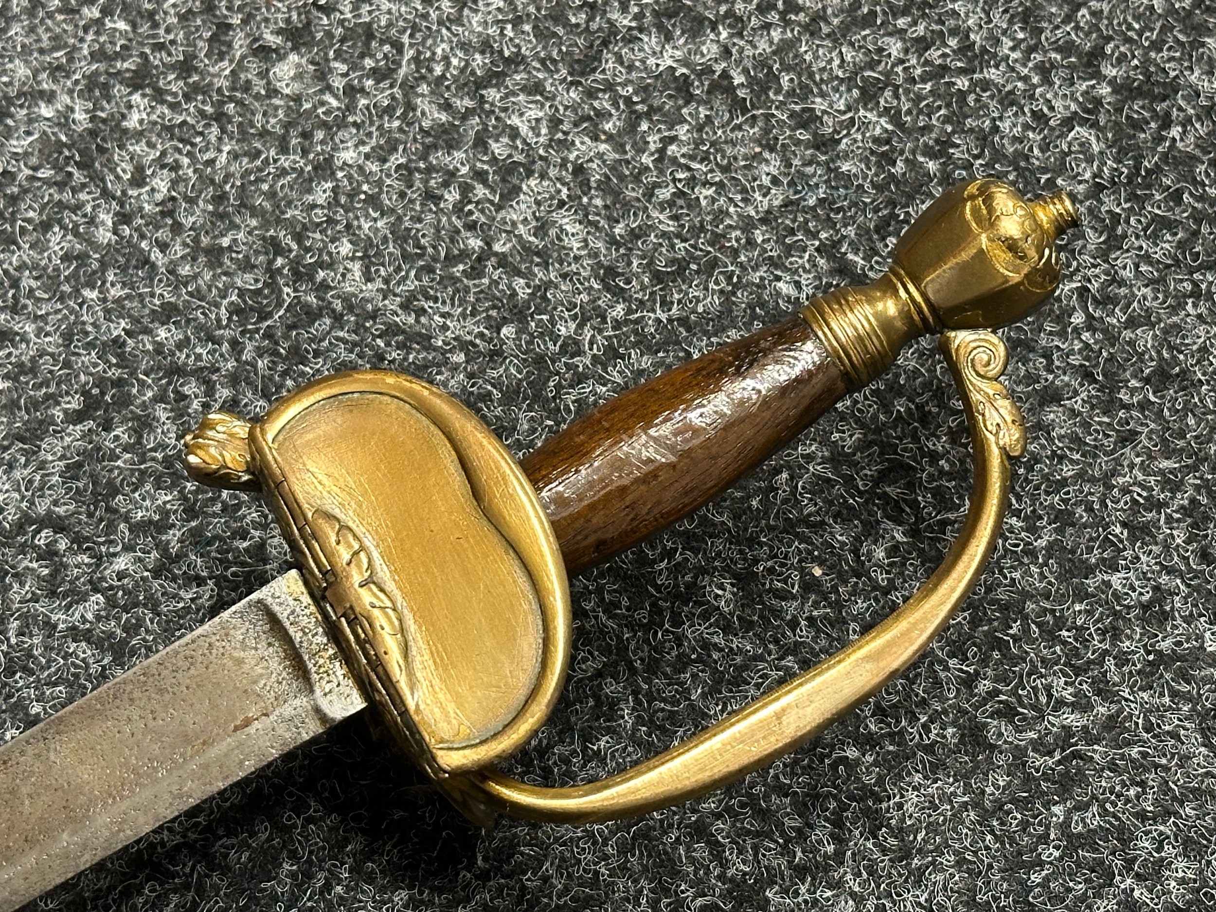 British 1796 Pattern Officers Sword with single edged fullered blade, unmarked, 800mm in length. Folding brass guard. Wooden grip. Overall length 960mm. No scabbard.