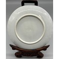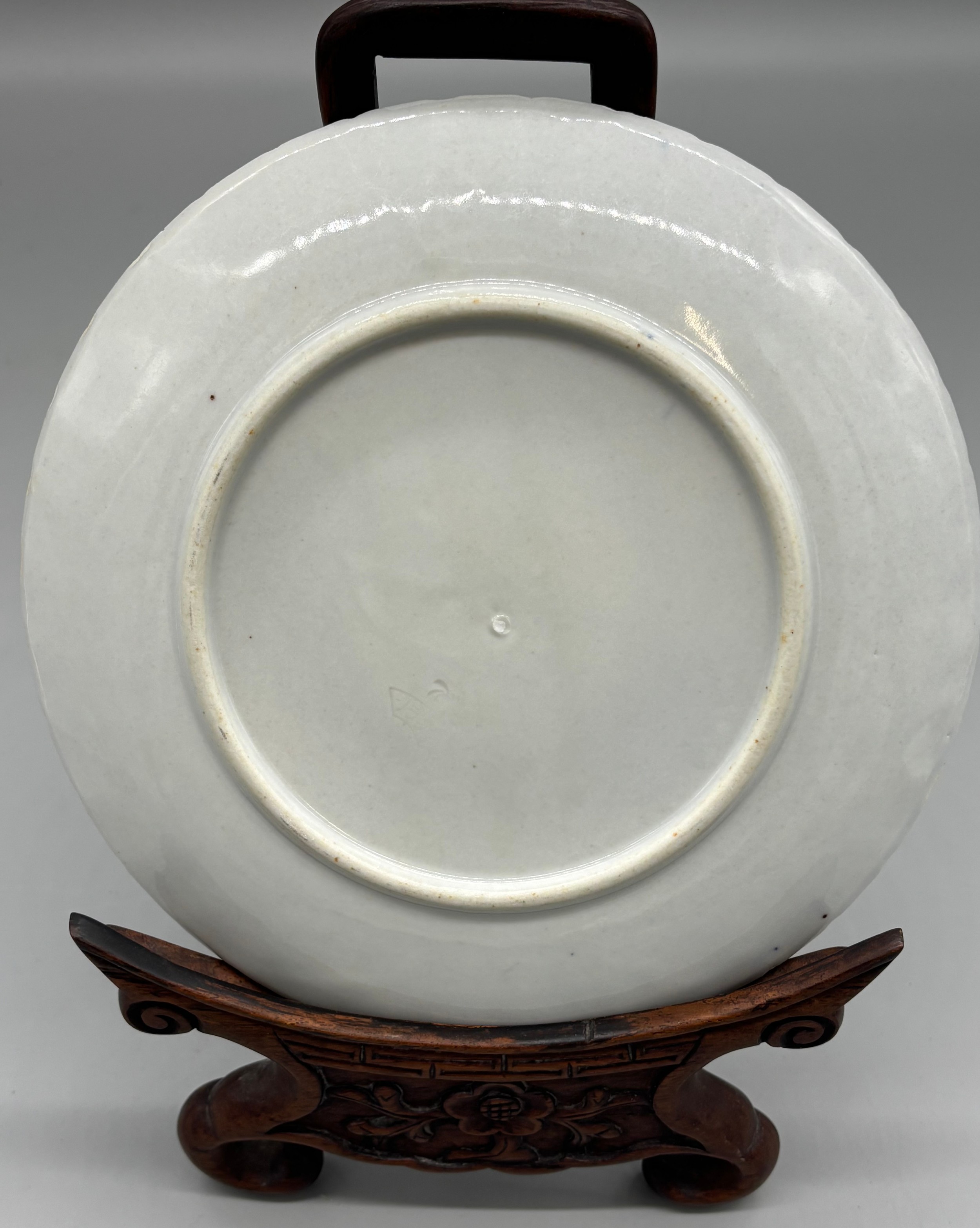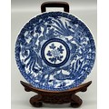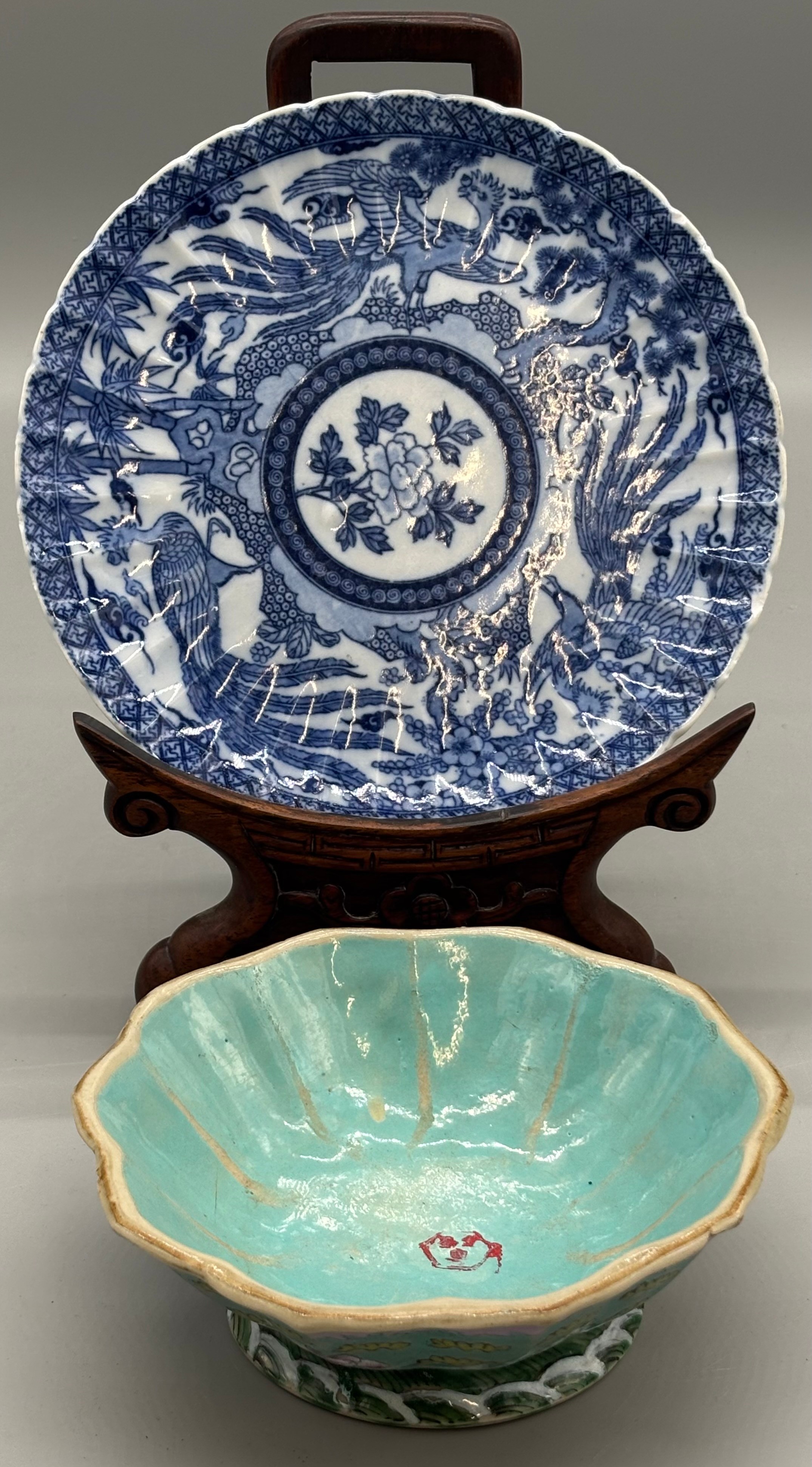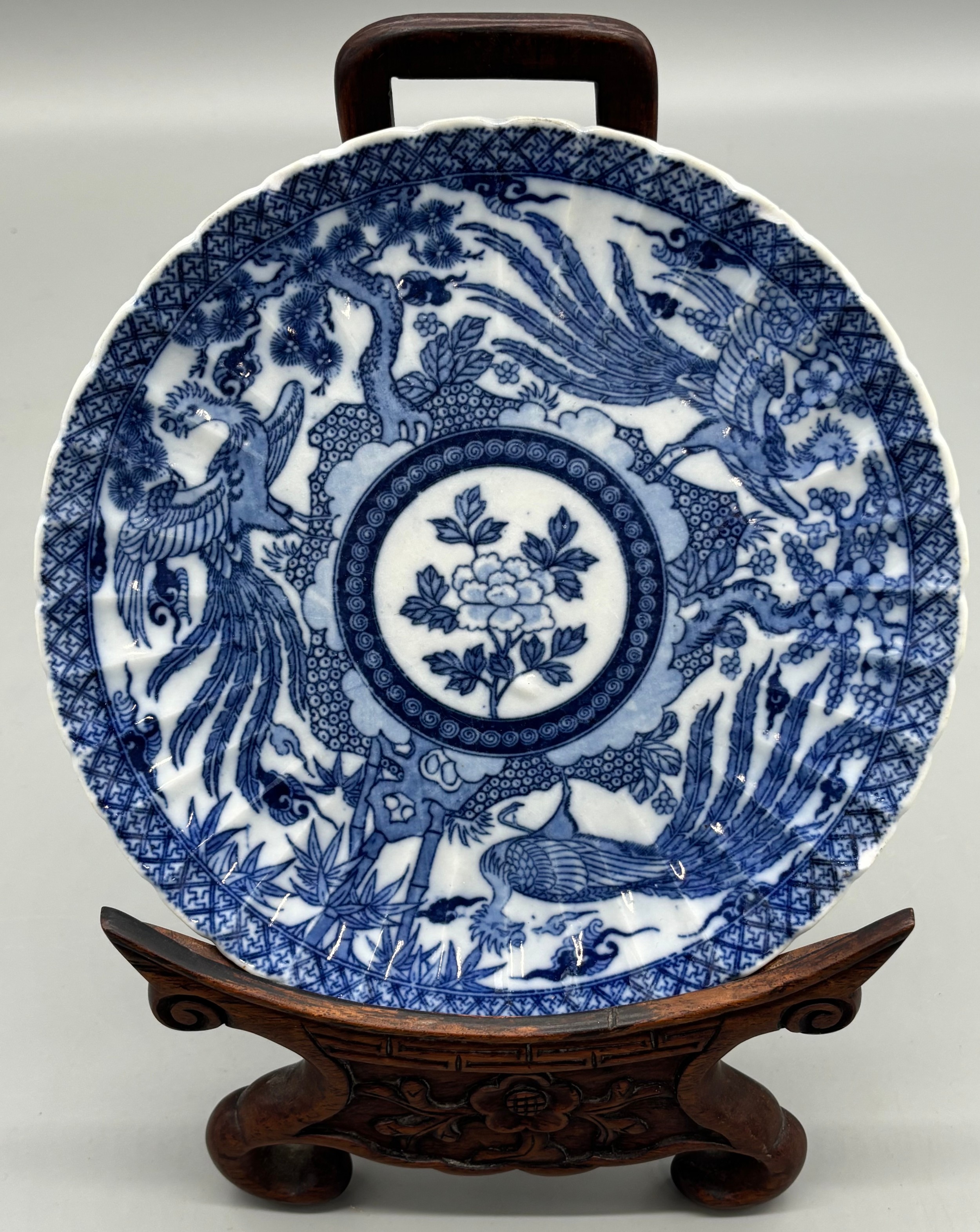 Chinese Qing Dynasty Scalloped Edged Bowl together with a Chinese Blue & White Scalloped Edged plate with phoenix design. Comes with a wooden stand.