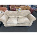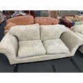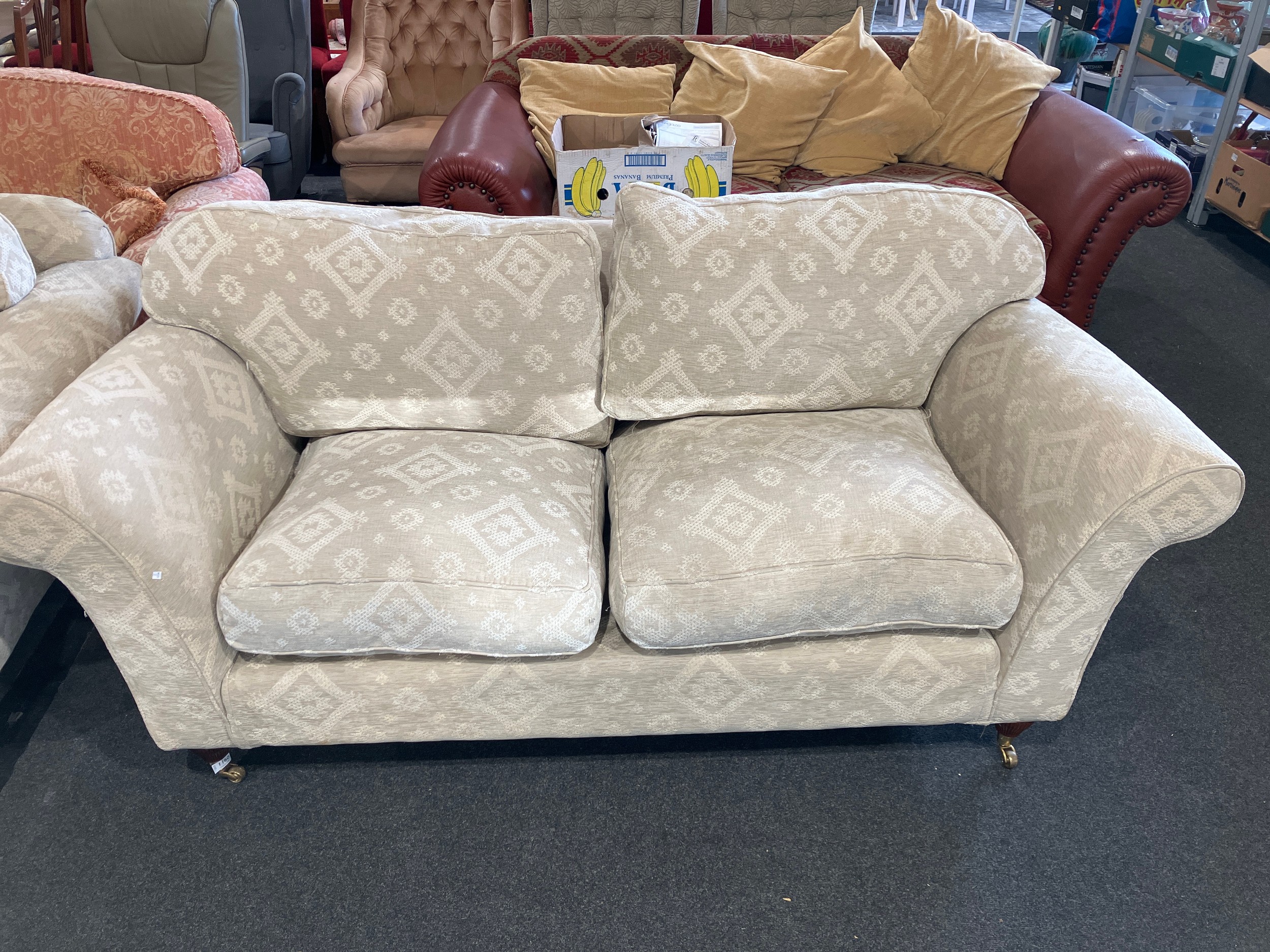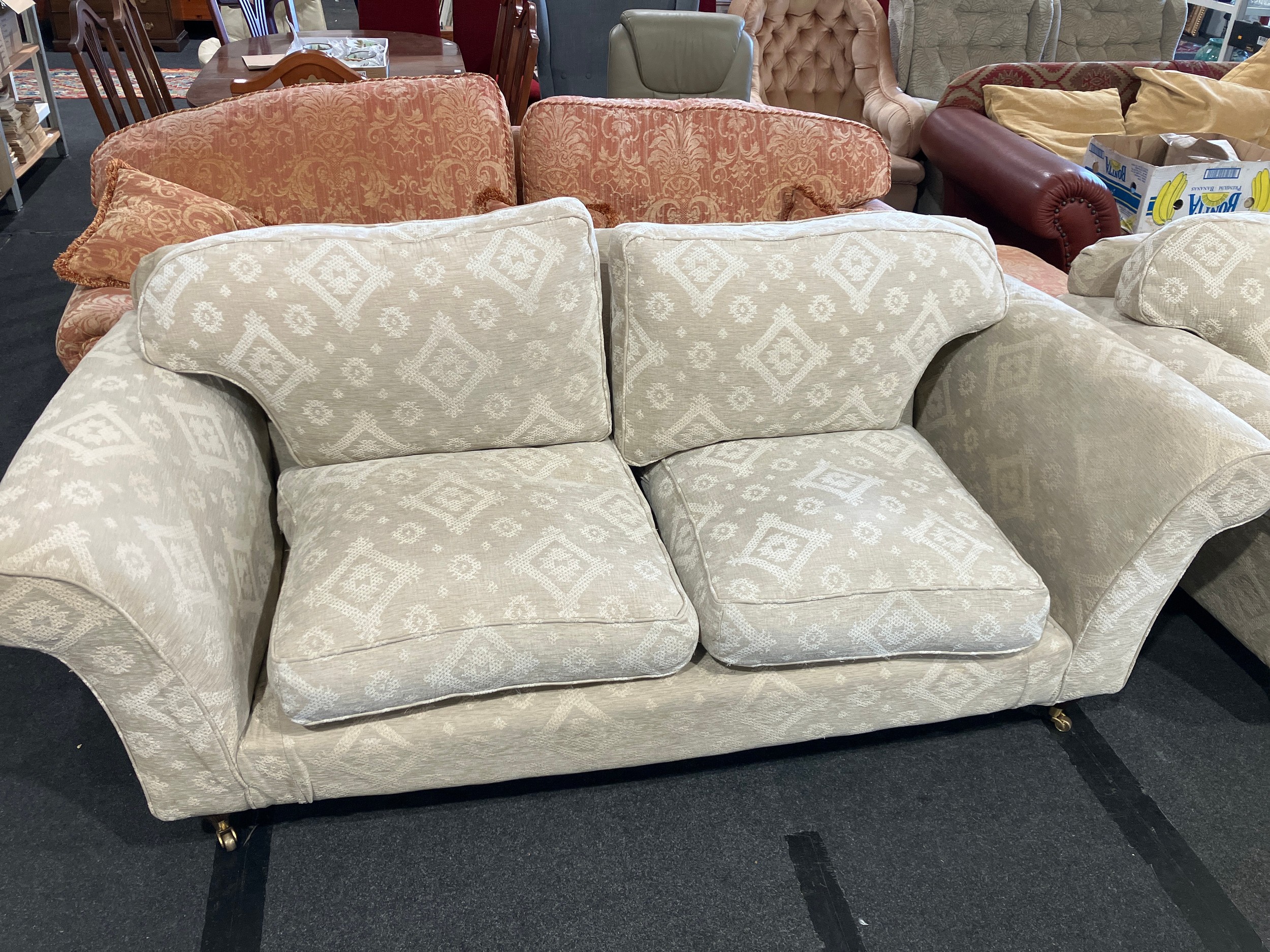 A pair of Multiyork modern two seater sofas with geometric upholstery on castors