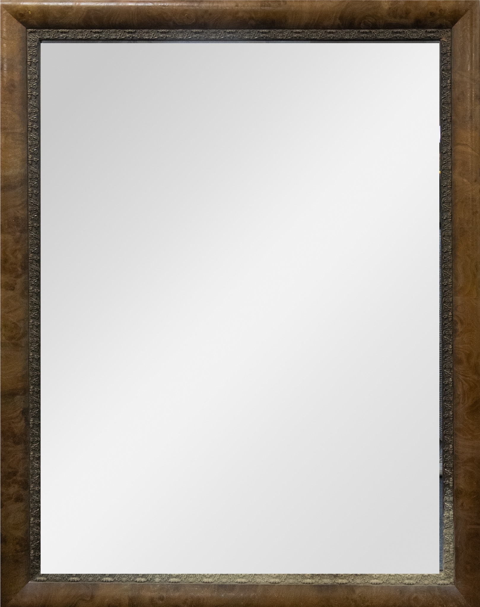MODERN FIGURED WALNUT LARGE WALL MIRROR, the bevel edged oblong plate in a cushion moulded frame with floral slip, 55” x 42 ½” (139.7cm x 108cm) overall