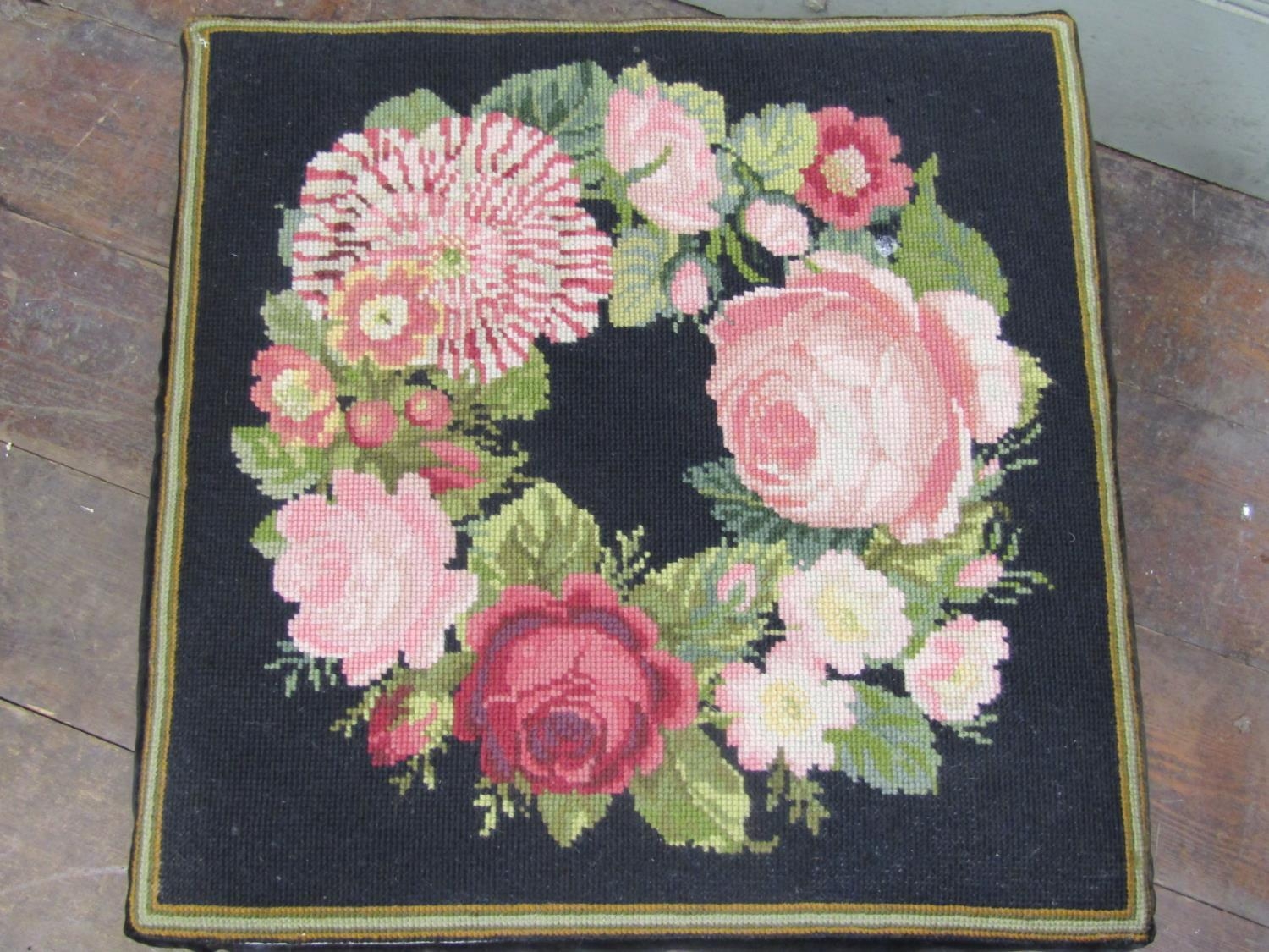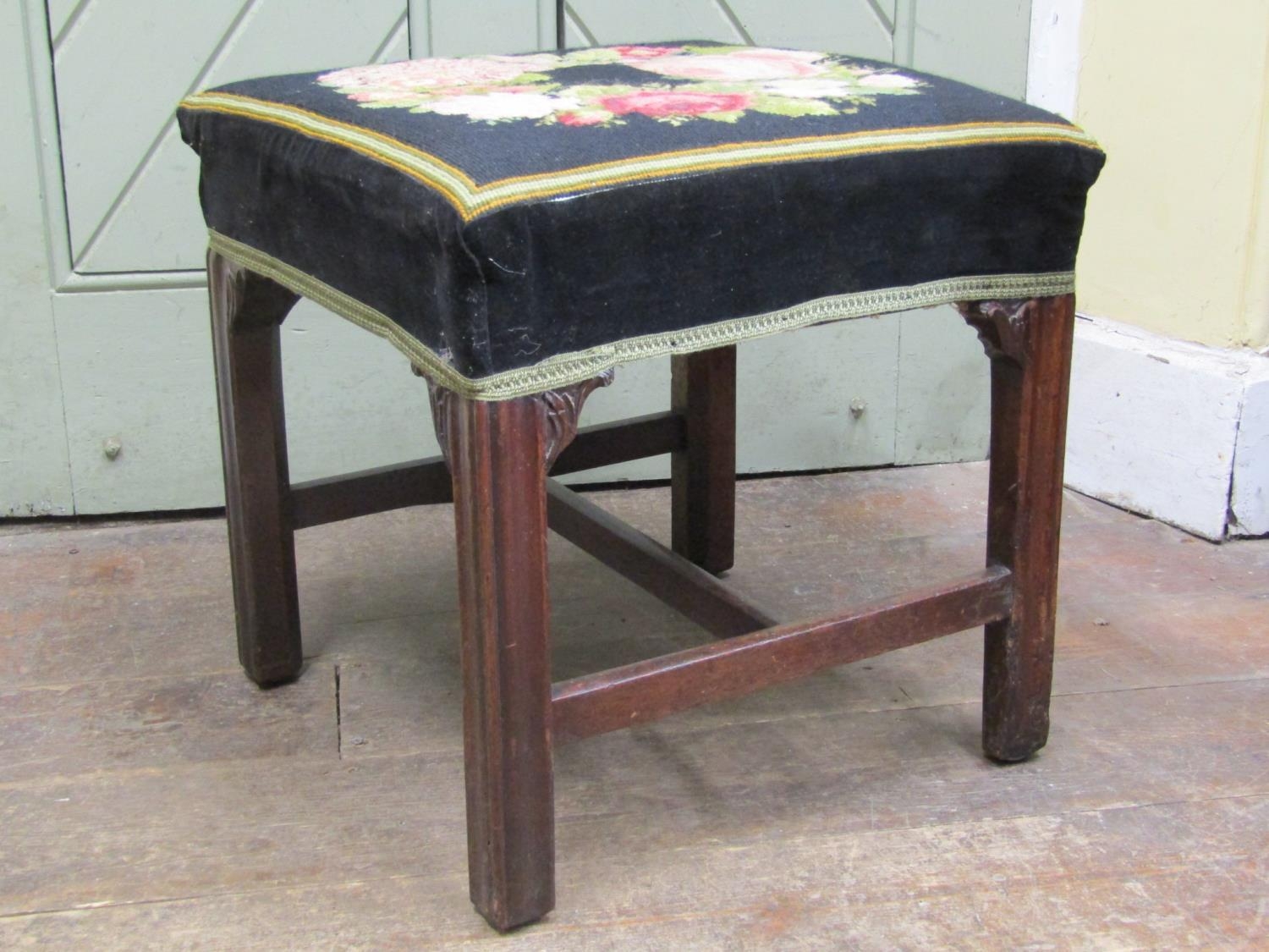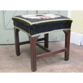 A Georgian mahogany centre stool of square cut form, with hand worked tapestry top, raised on four square moulded supports, 45cm square