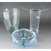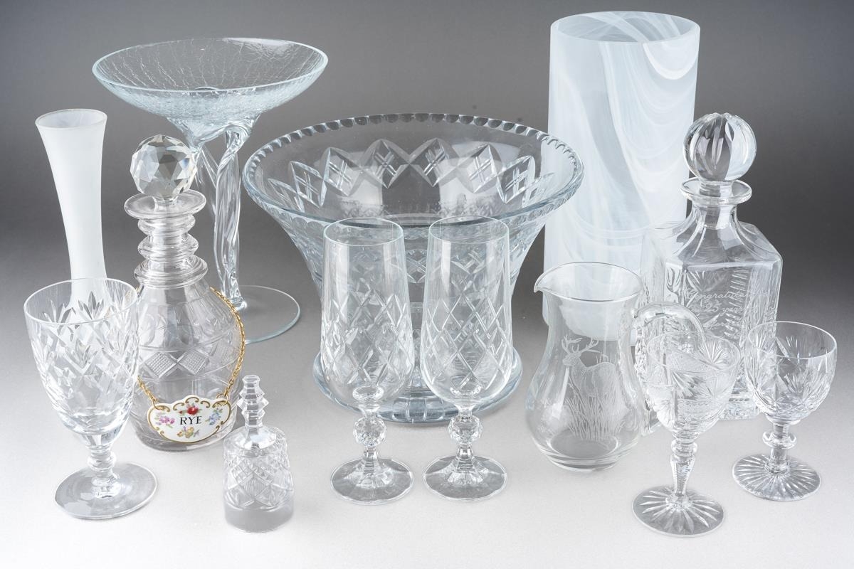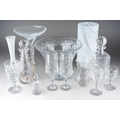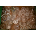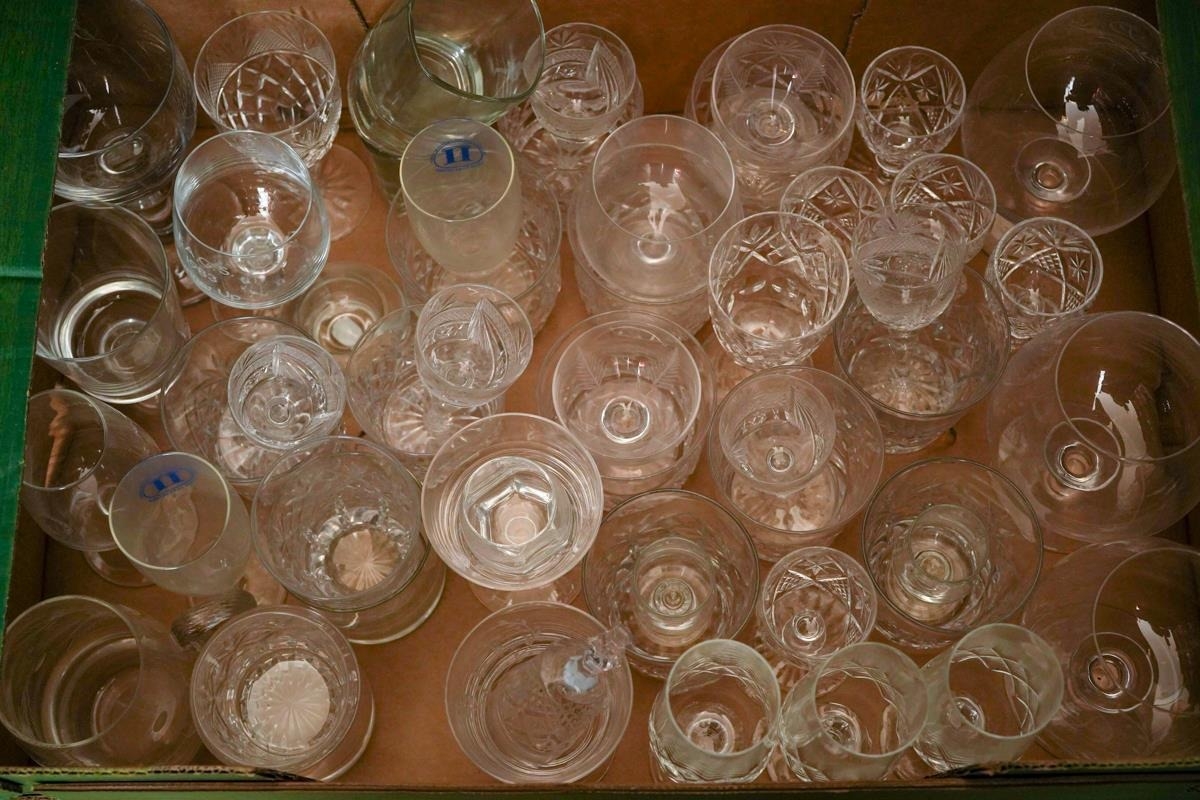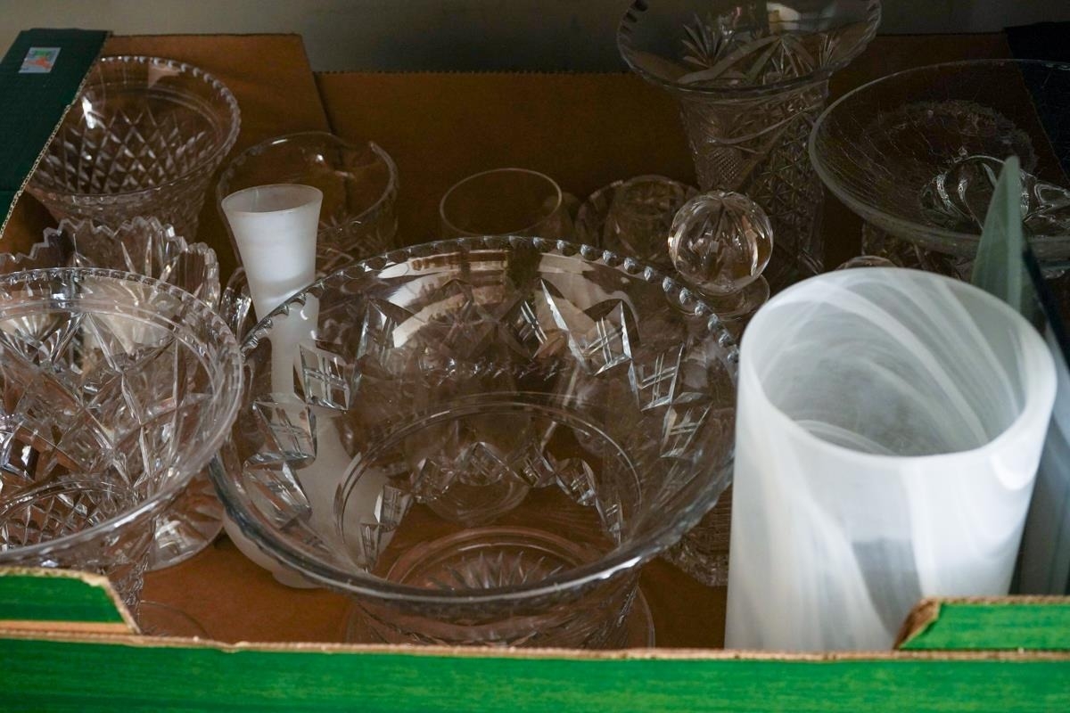Two boxes of assorted drinking glasses, vases, decanters, jugs, etc, including some cut glass (2 boxes)