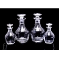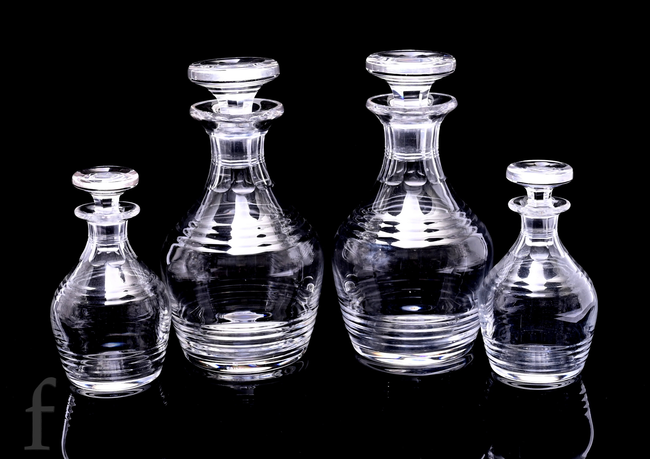 A set of four 20th Century Stuart & Sons decanters in the Stratford pattern, two large and two miniature, each with horizontal bands molded to the body below plain mushroom form stoppers, acid marked, tallest 22cm. (4)