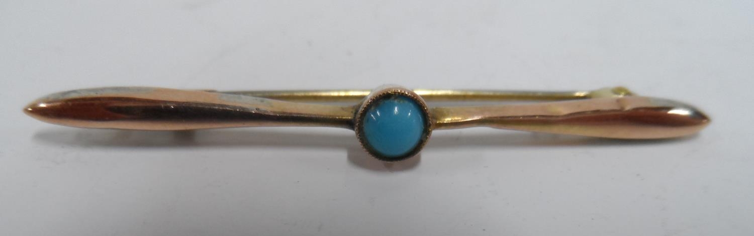 Edwardian 9ct Rose gold bar brooch with solitaire Turquoise