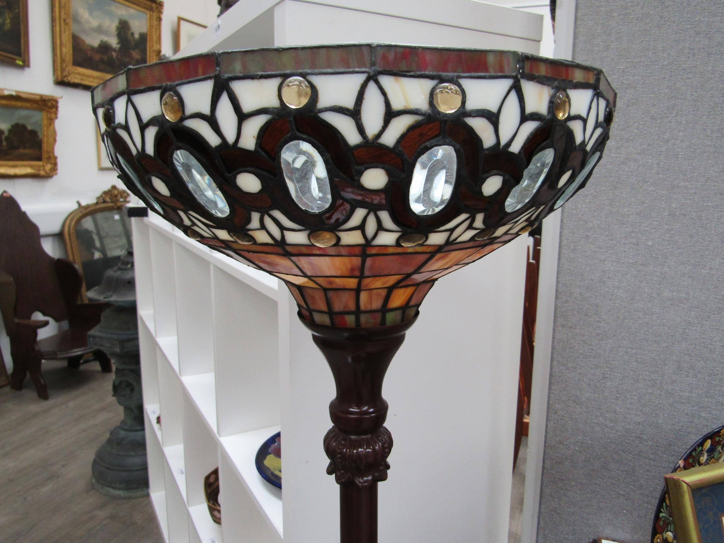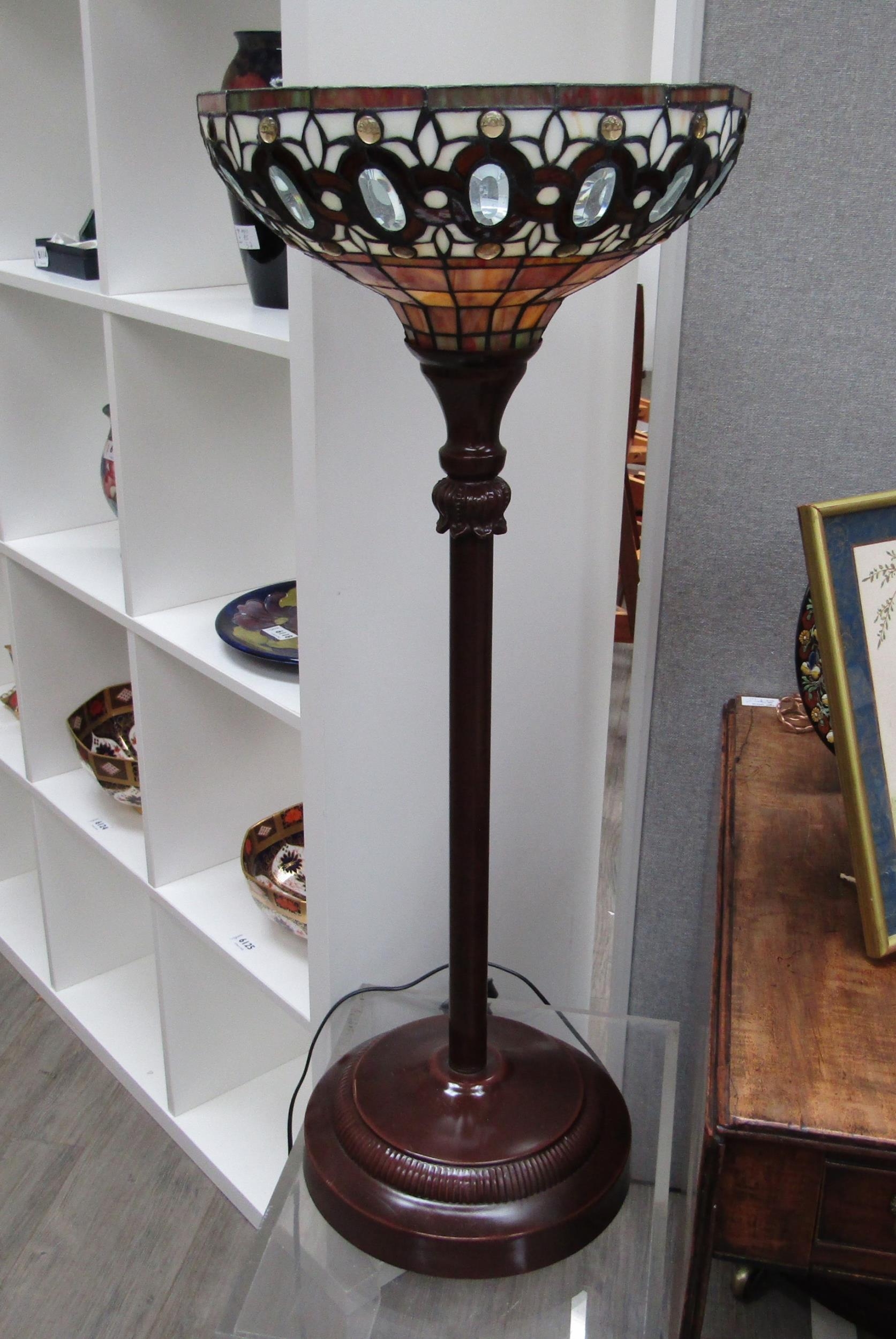 A Tiffany style leaded glass uplighter on short metal base. 85cm high. Collectors electrical