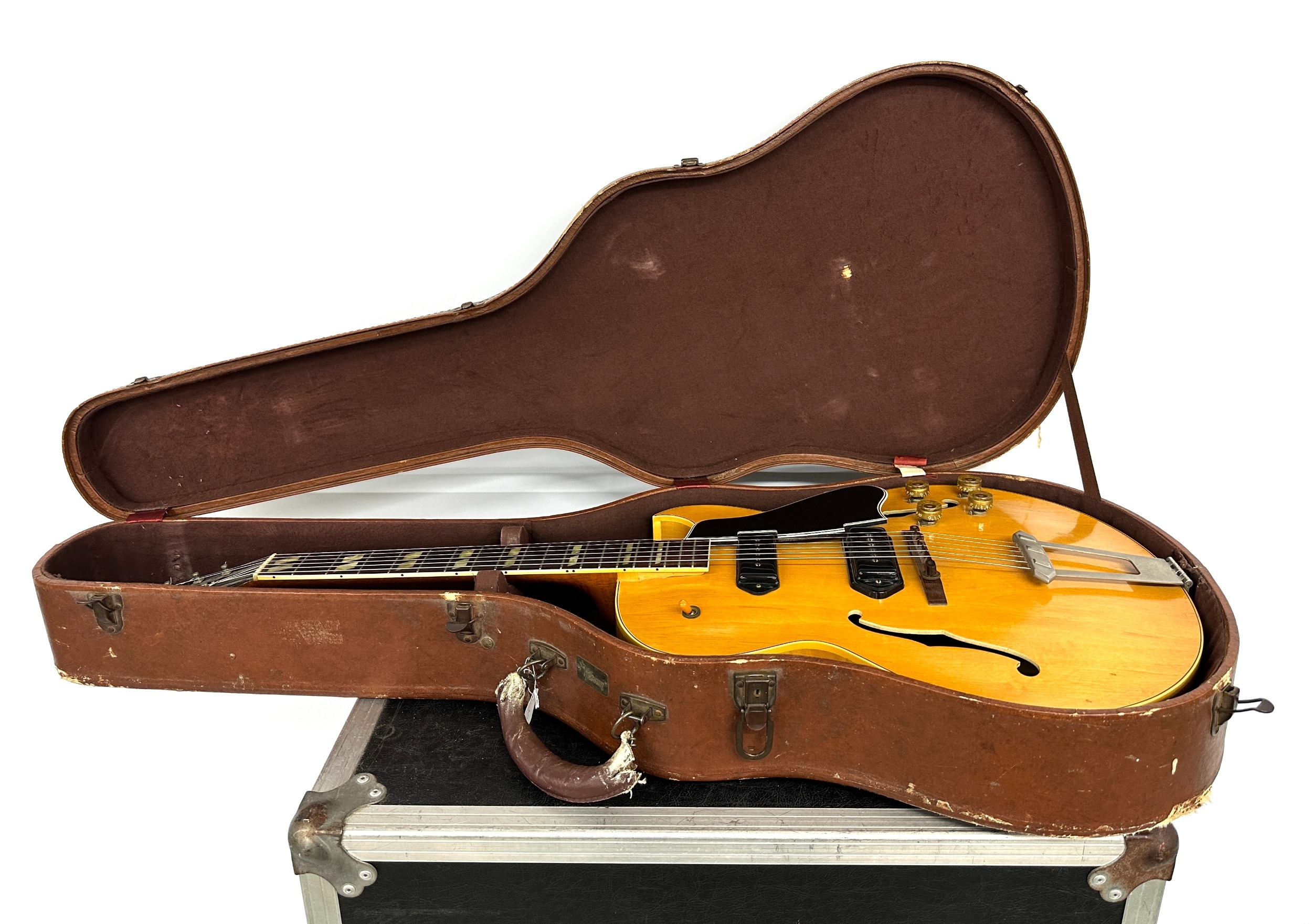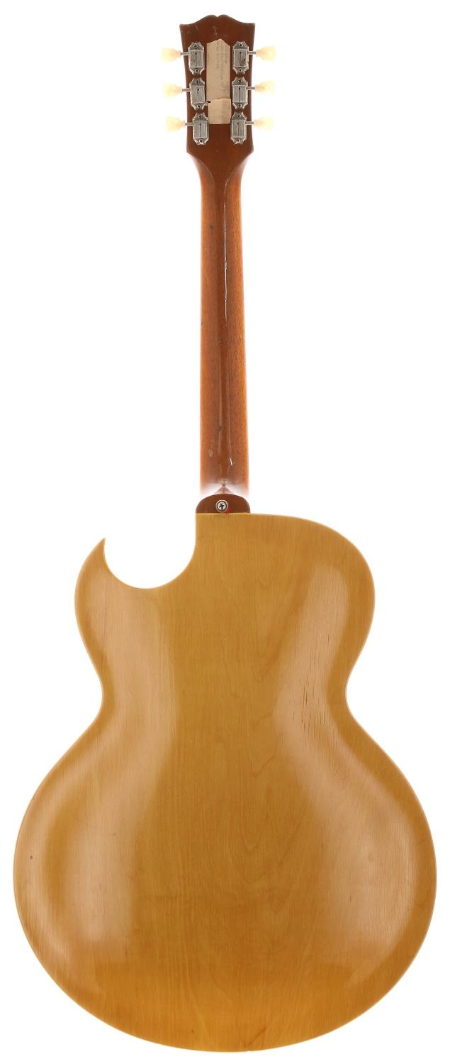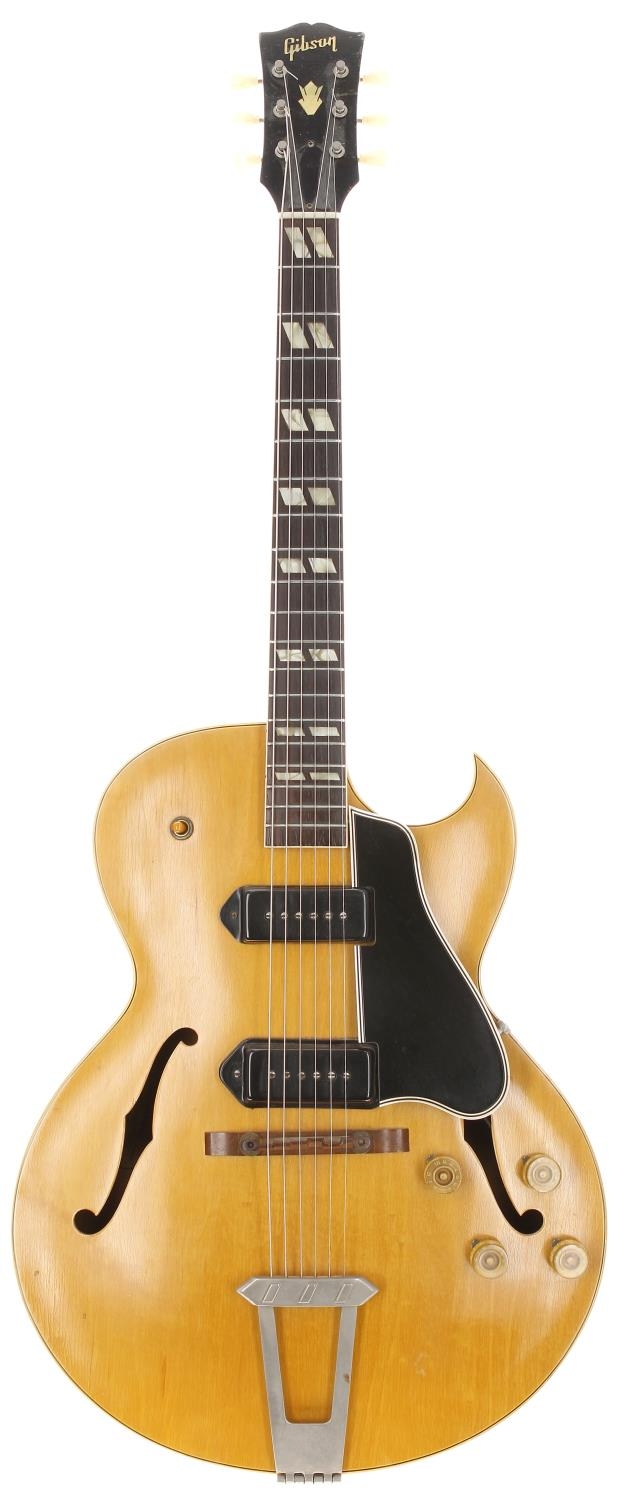 1954 Gibson ES-175 D hollow body electric guitar, made in USA; Body: natural finished maple, light checking throughout and various minor dings otherwise very good for age; Neck: mahogany, light checking, various minor dings; Fretboard: rosewood with pearl split position markers; Frets: light wear; Electrics: working; Hardware: generally good, later strap buttons; Case: original hard case (replacement handle); Weight: 2.73kg; Overall condition: very good