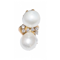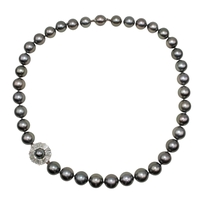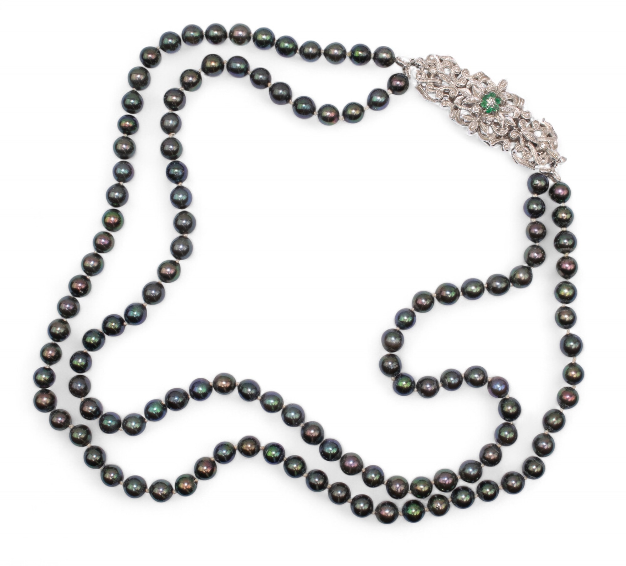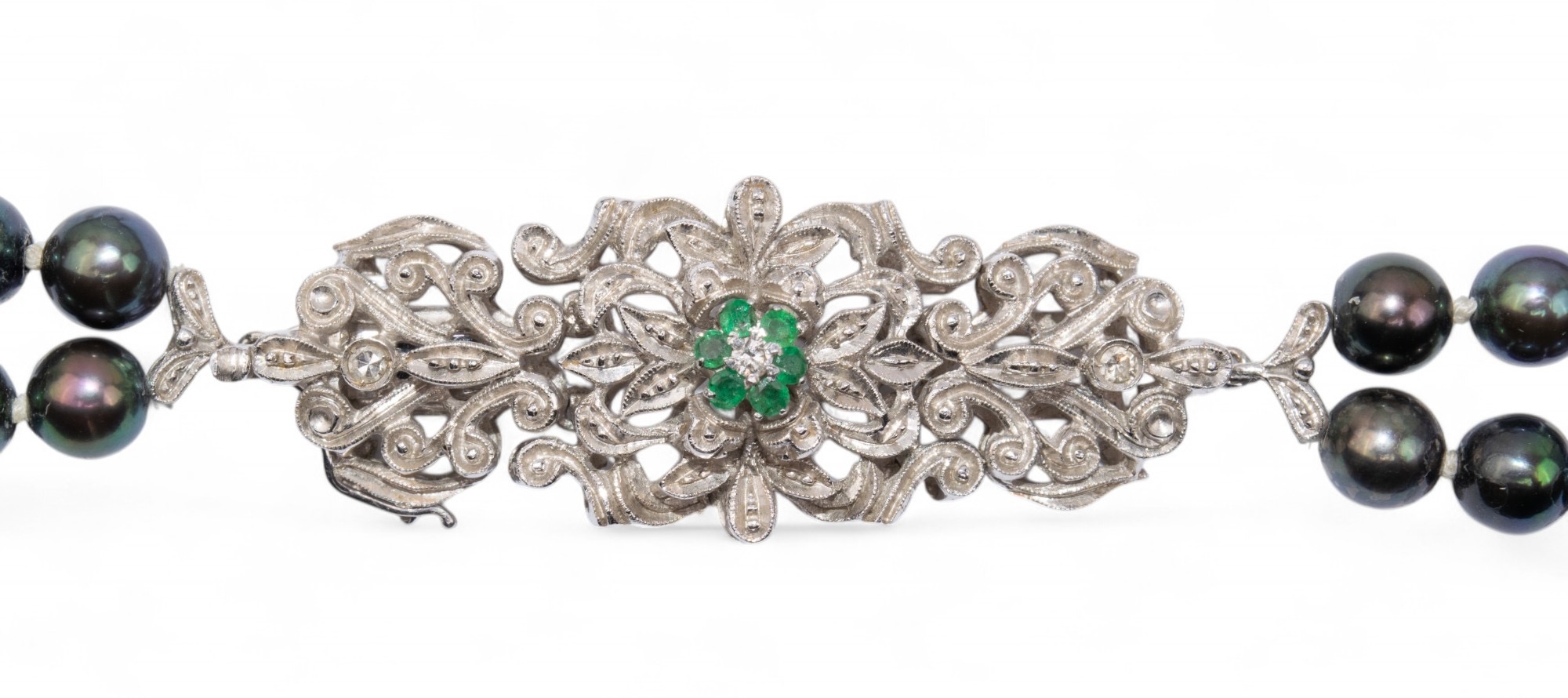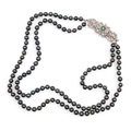 A two-row black coloured cultured pearl necklace. The pearls measuring 2.68mm. With a white gold, diamond and emerald set cluster clasp