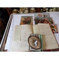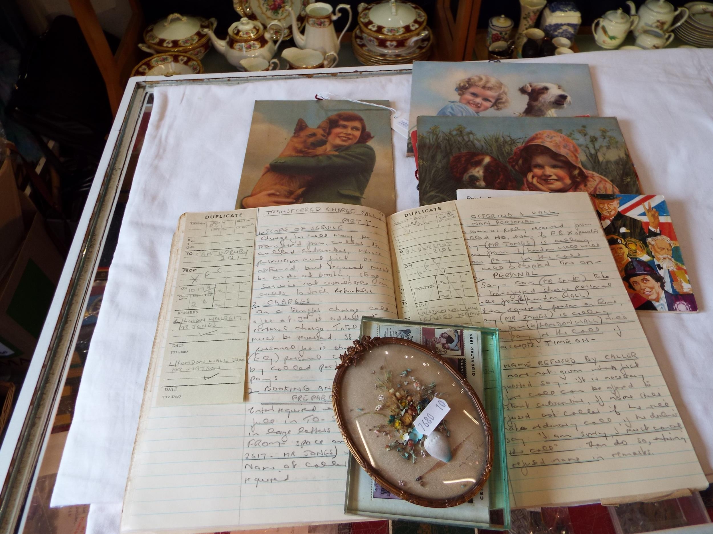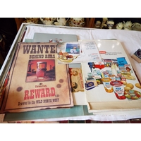 Five vintage pictures on board, Centenary of Cinema stamp paperweight, cigarette cards and ephemera