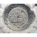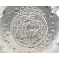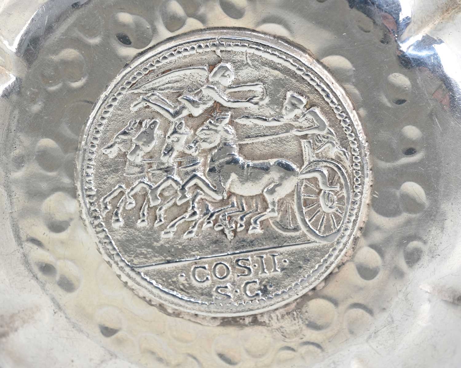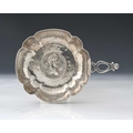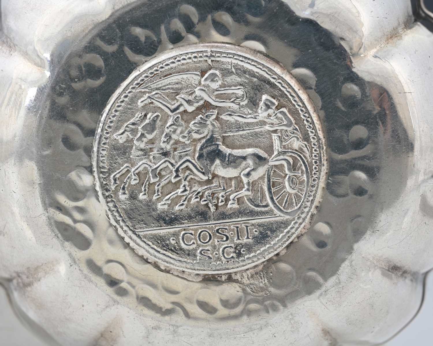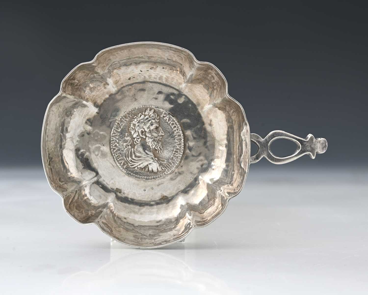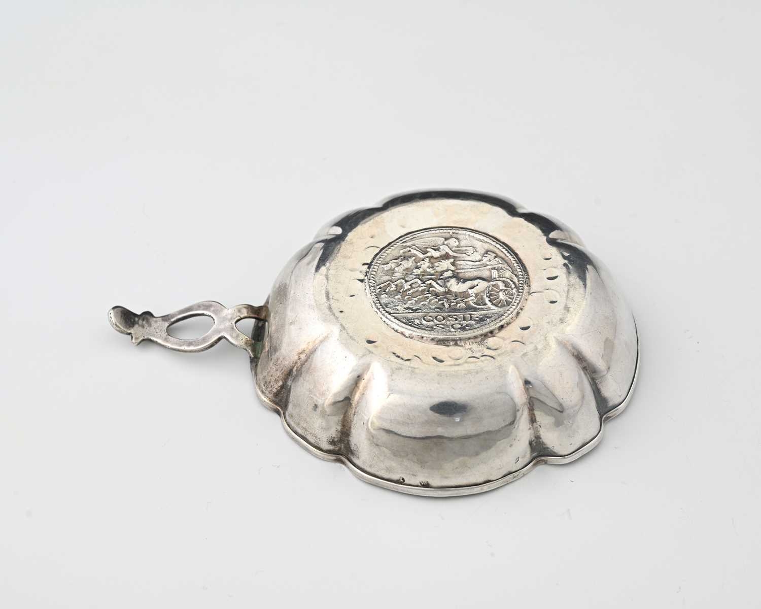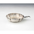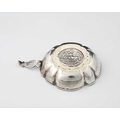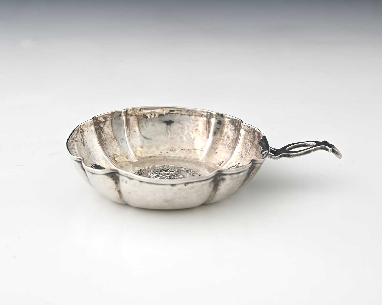 Spain, a twentieth-century Spanish wine taster, of panelled oval form, the base inset with a coin, the rim struck with the five-pointed star post-1934 mark for 0.915 silver fineness, diameter 10.2cm, weight 79g/2.53ozt approx