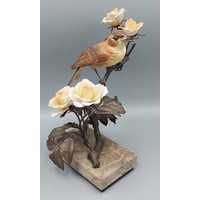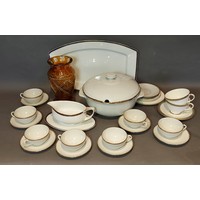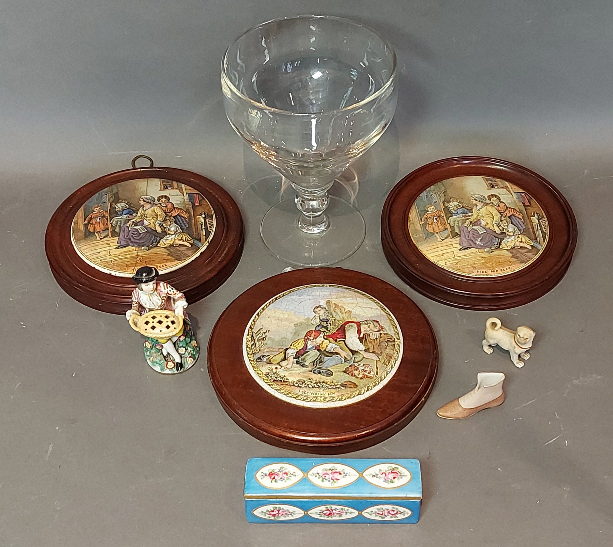 Three framed Pratware pot lids together with a glass rummer, a Continental figure and three other ceramic items