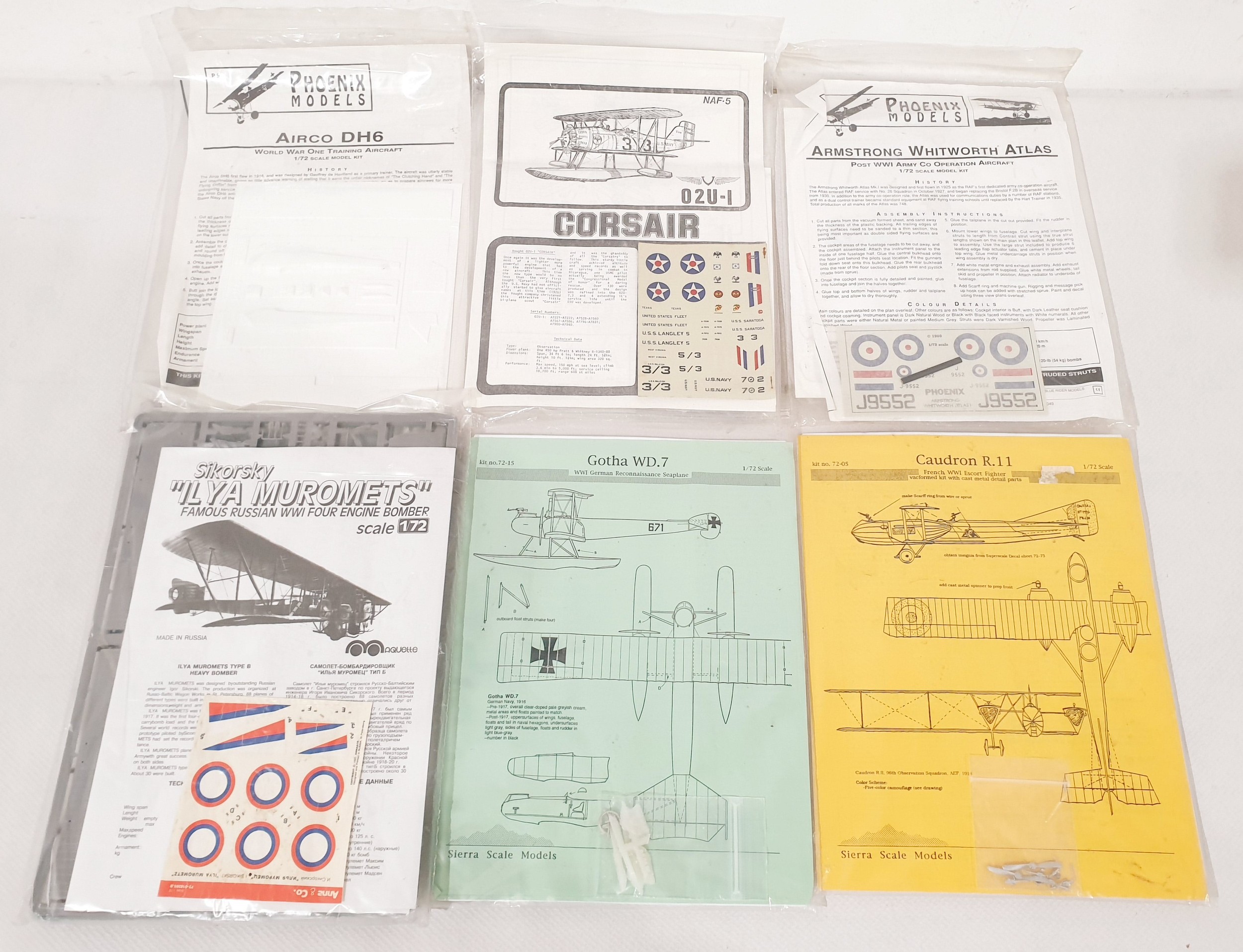 Six 1:72 scale model plane kits 'Sikorsky, Il Ya Moromets', 'Gotha WD.7', Caudron R.11' 'Airco DH6', 'Corsair' & 'Armstrong Whitworth Atlas'.