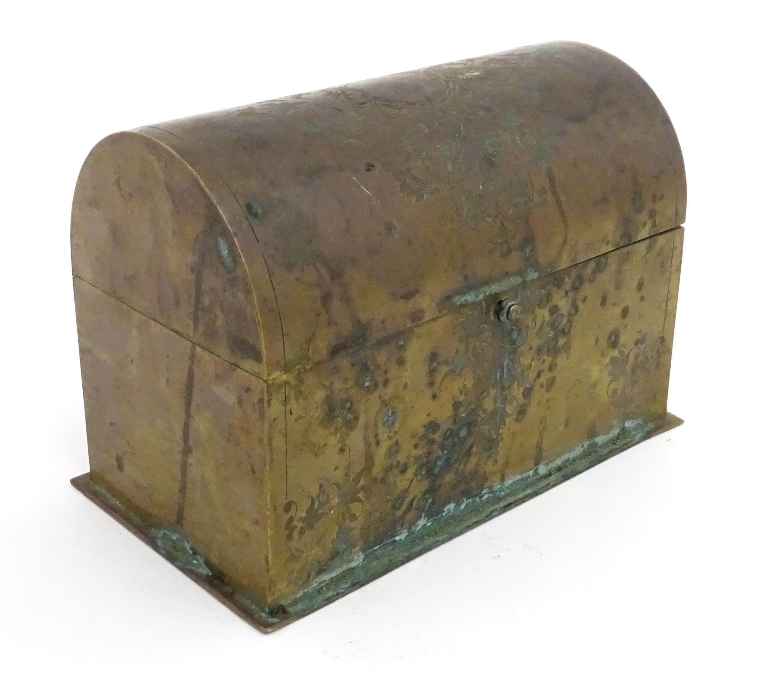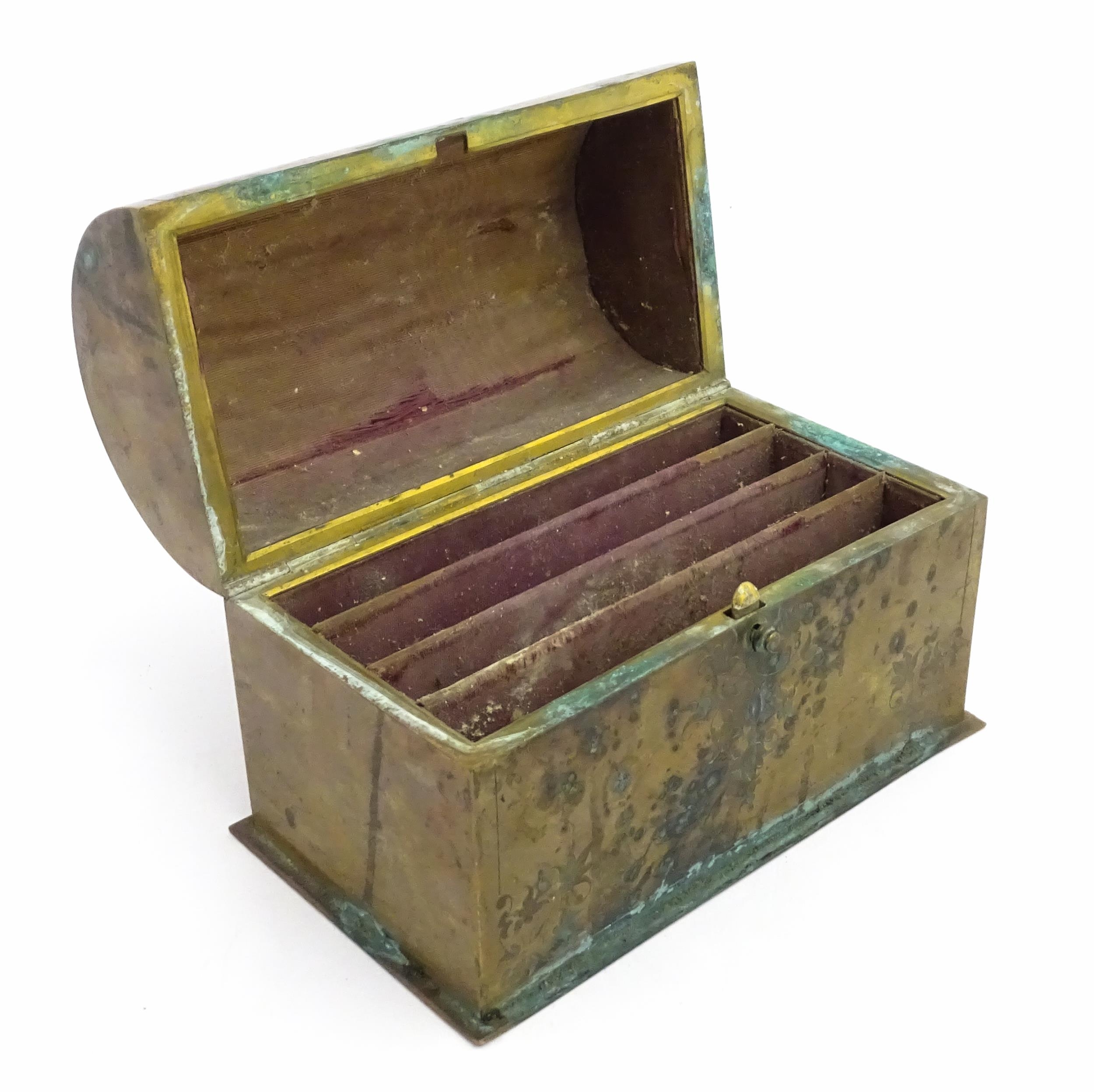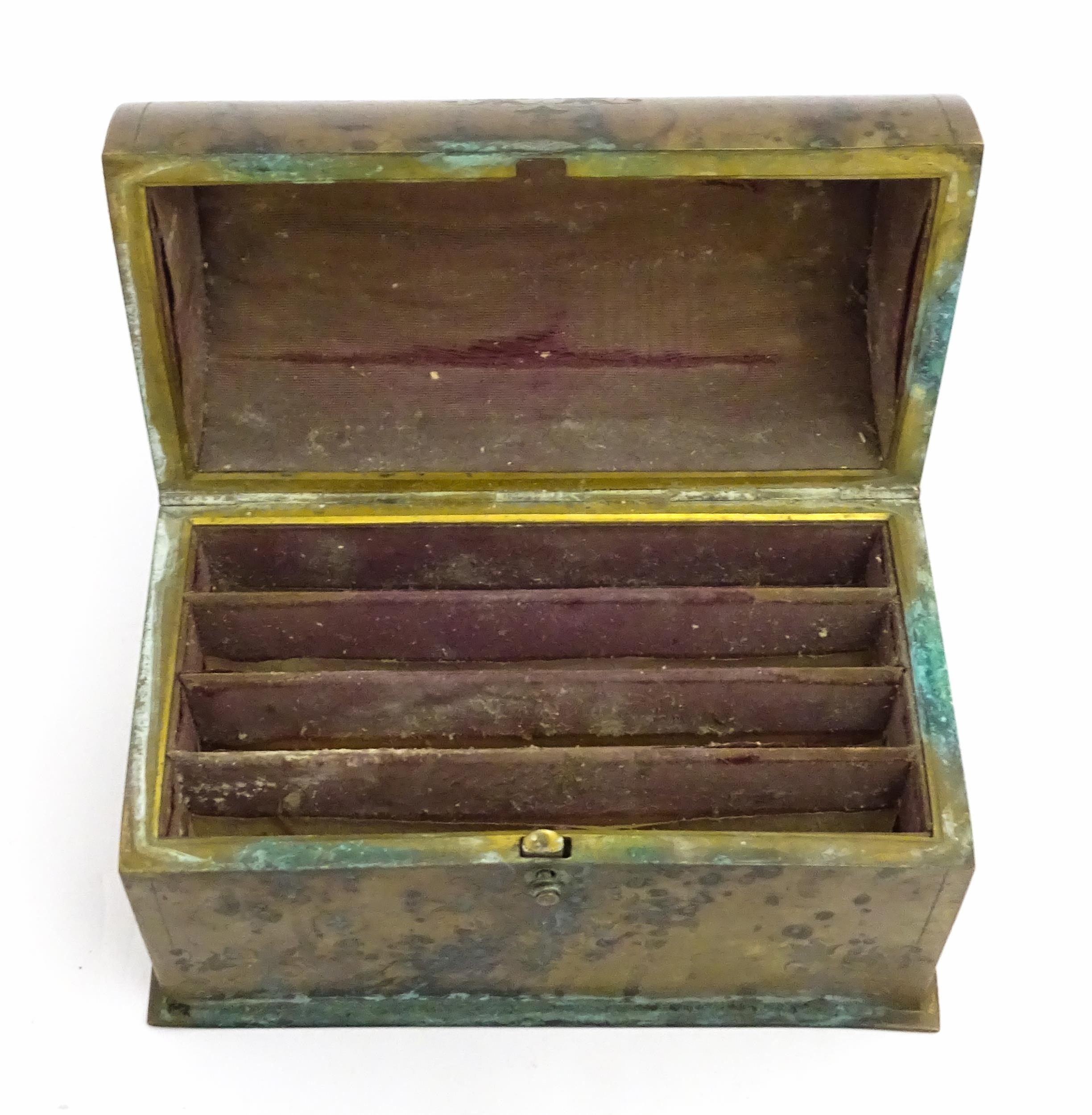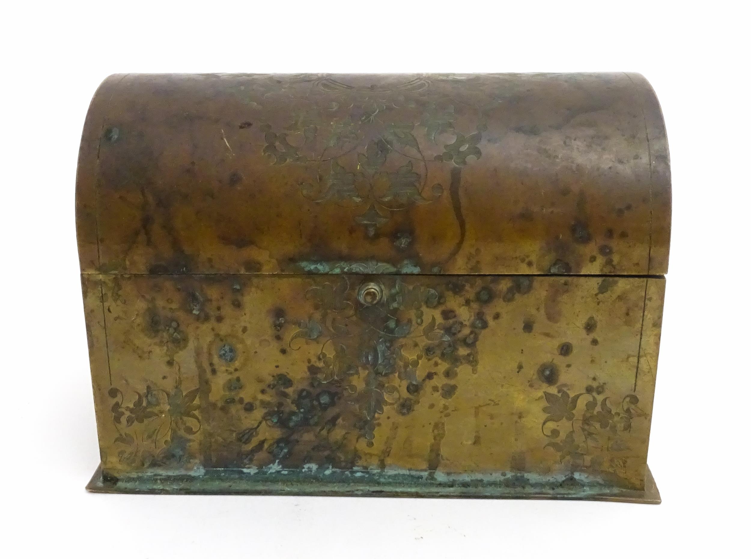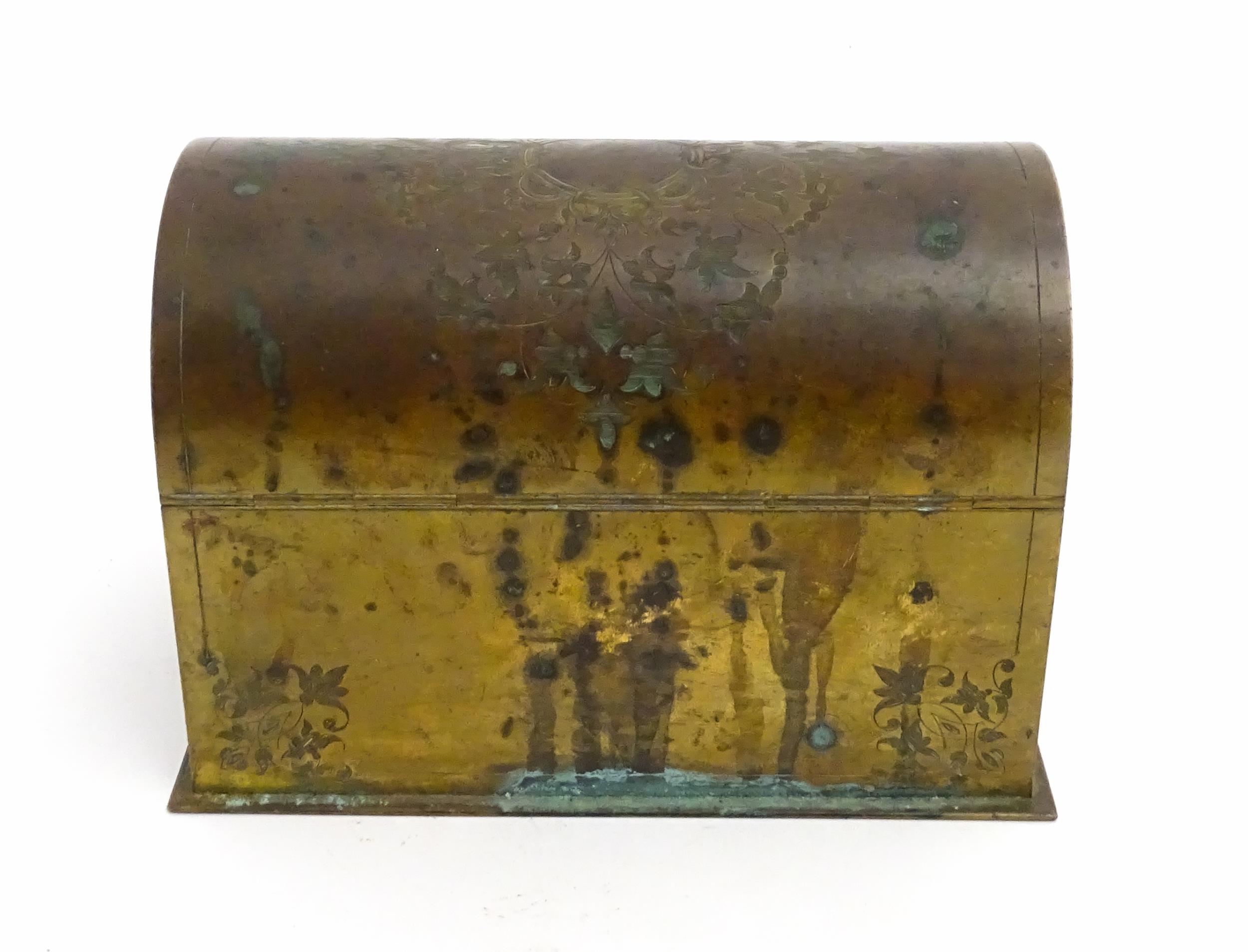 A 19thC brass covered dome top correspondence box with engraved scrolling foliate decoration, opening to reveal four divisions within. Approx. 5" high x 7 1/4" wide