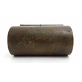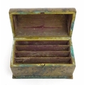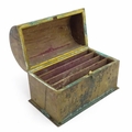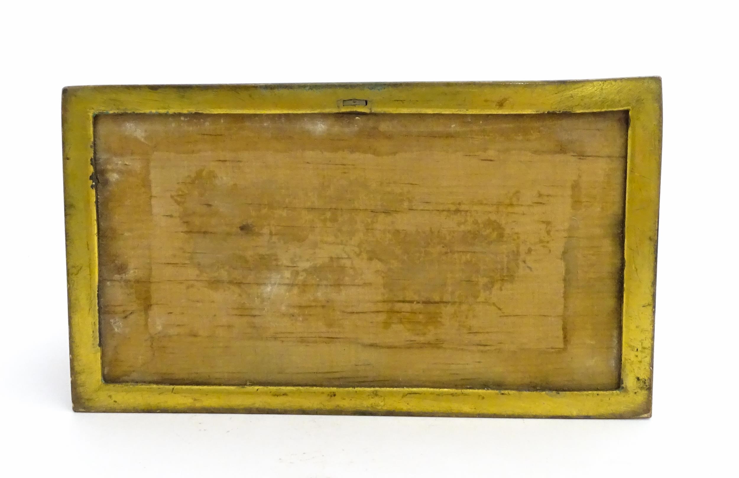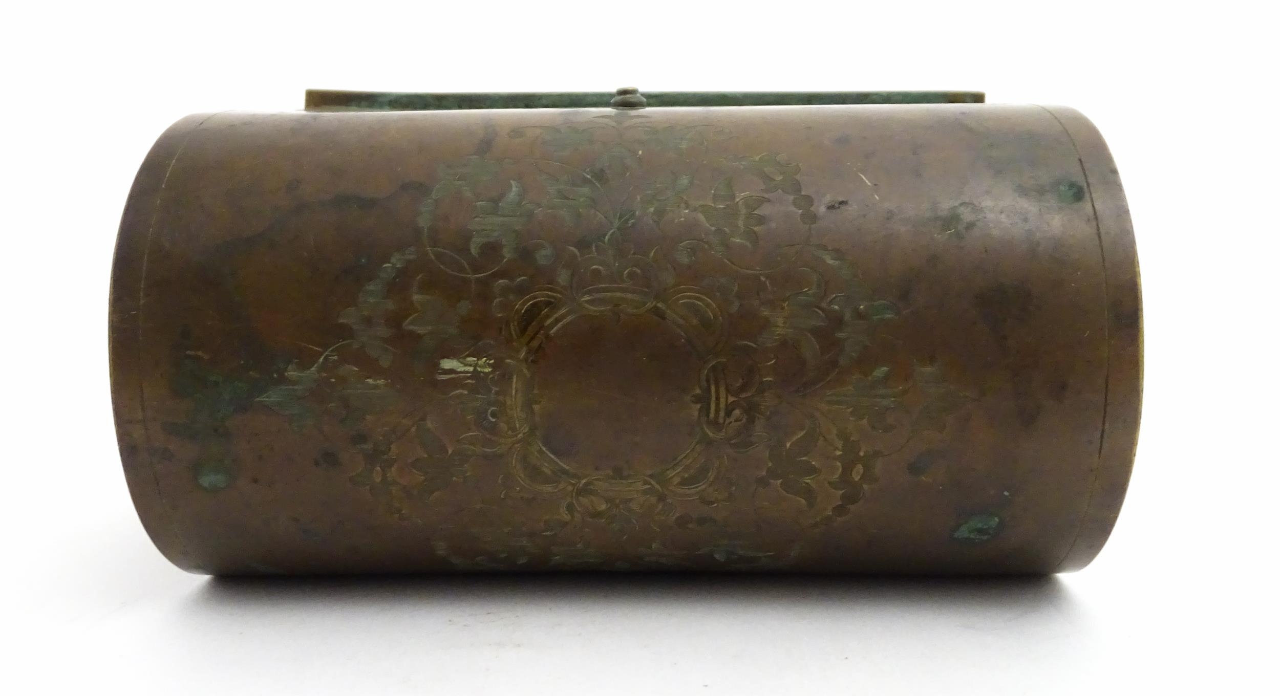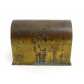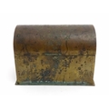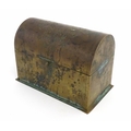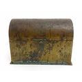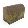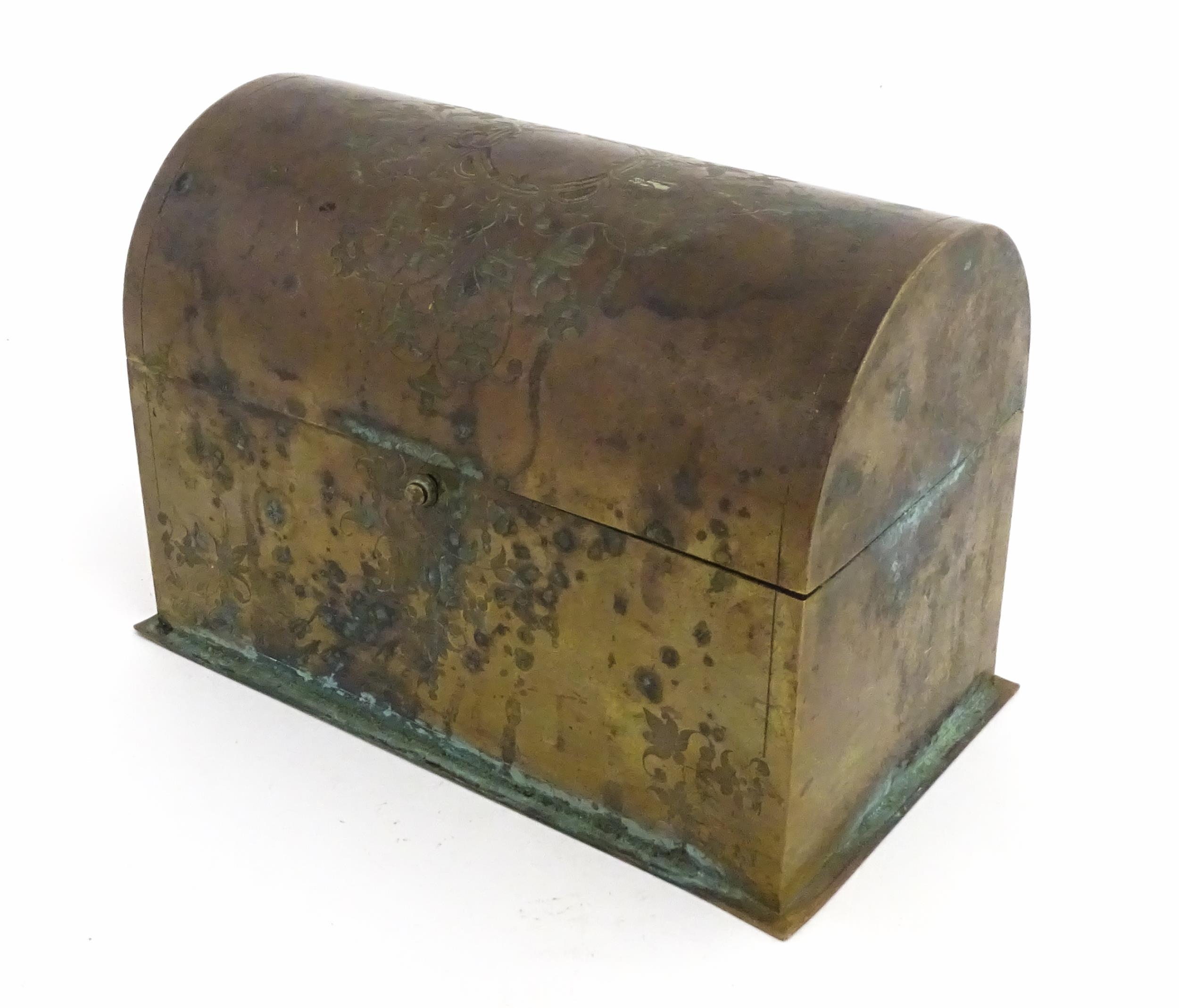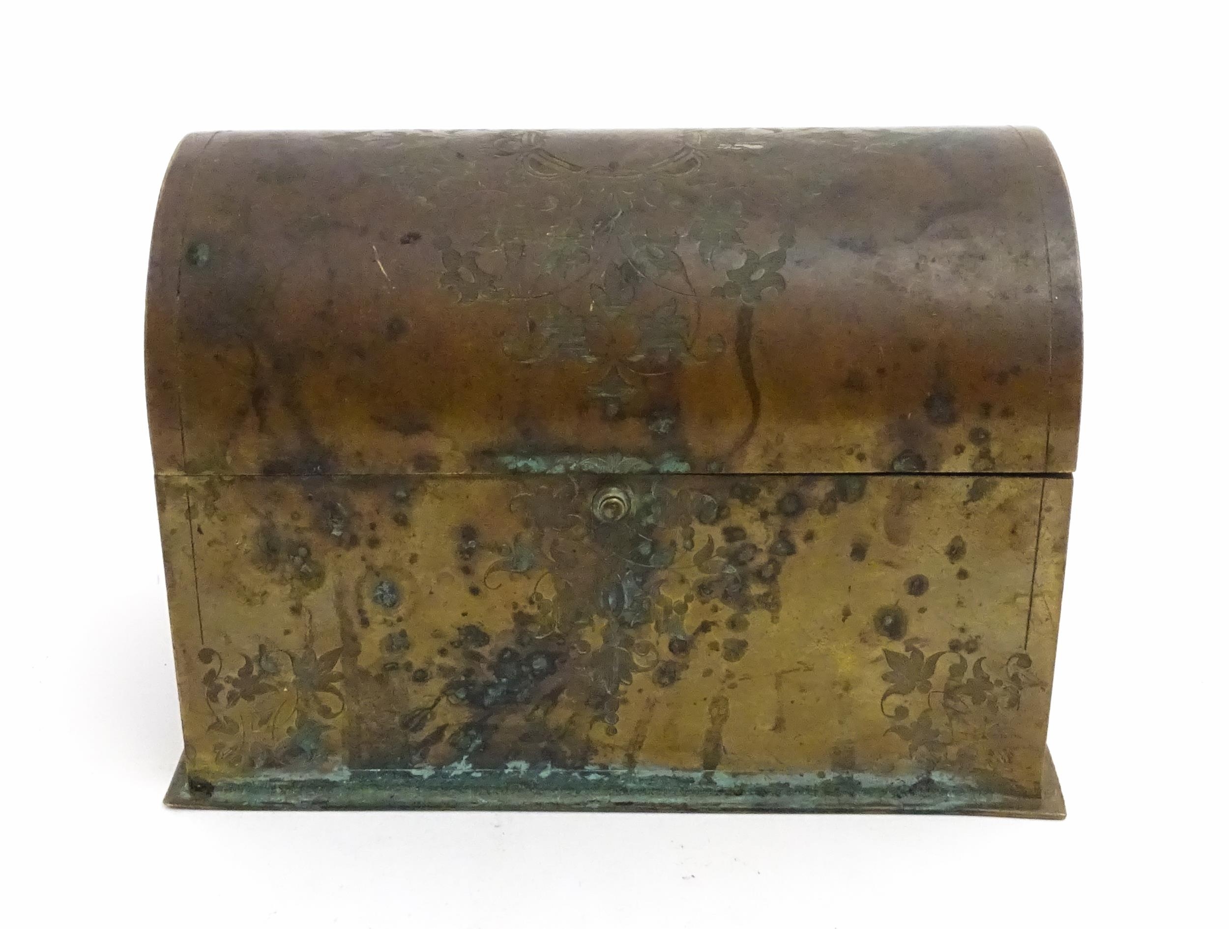 A 19thC brass covered dome top correspondence box with engraved scrolling foliate decoration, opening to reveal four divisions within. Approx. 5" high x 7 1/4" wide