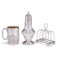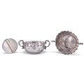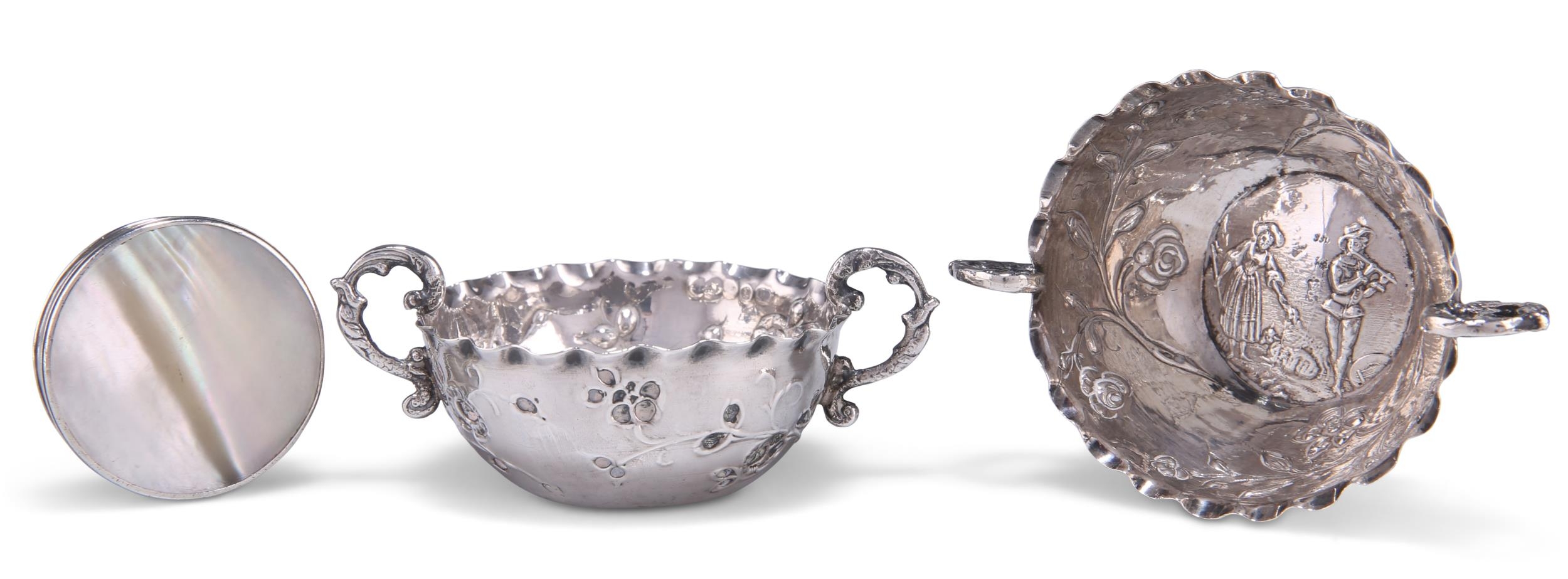 A PAIR OF SMALL SILVER TWO-HANDLED BOWLS,Êimport marks Samuel Boyce (or Boaz) Landeck, Sheffield 1896, each chased to the well with figures in 18th Century dress, the sides with sprigs of foliage; together with AÊMOTHER-OF-PEARL SNUFF BOX, with white metal mounts. (2)ÊBowls 8.5cm across handles, 1.6 troy ounces