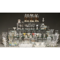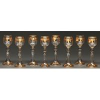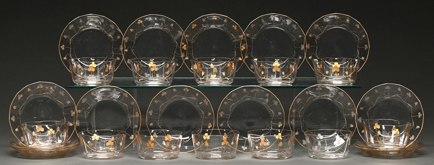 A set of twelve Bohemian octagonal gilt glass finger bowls and sixteen saucers, c1910, with alternate stylised plants on sinuous stems, saucer 16cm diam