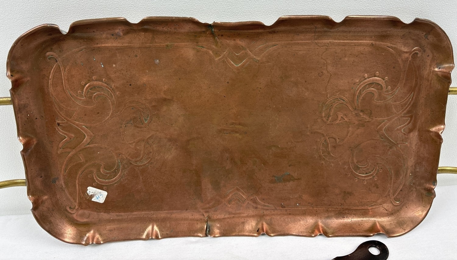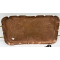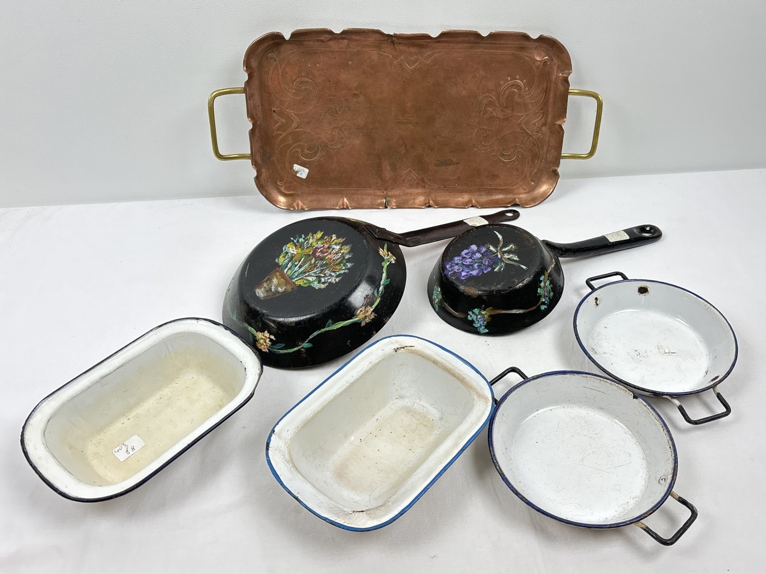 An Art Nouveau copper and brass tray with sinuous line design. Together with 2 small frying pans with floral barge painted decoration and 4 small enamel pie dishes. Art Nouveau tray has a small split to each.