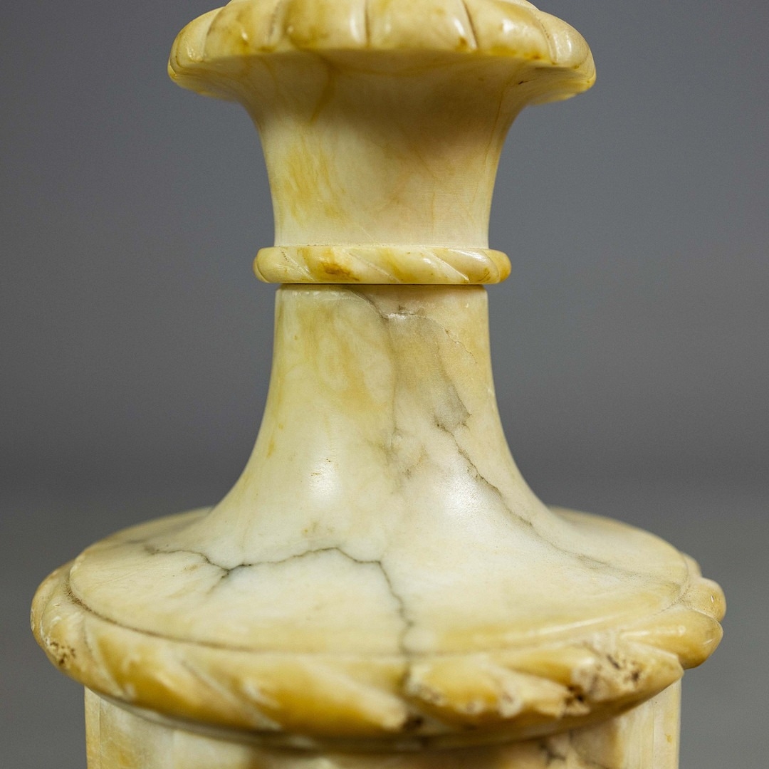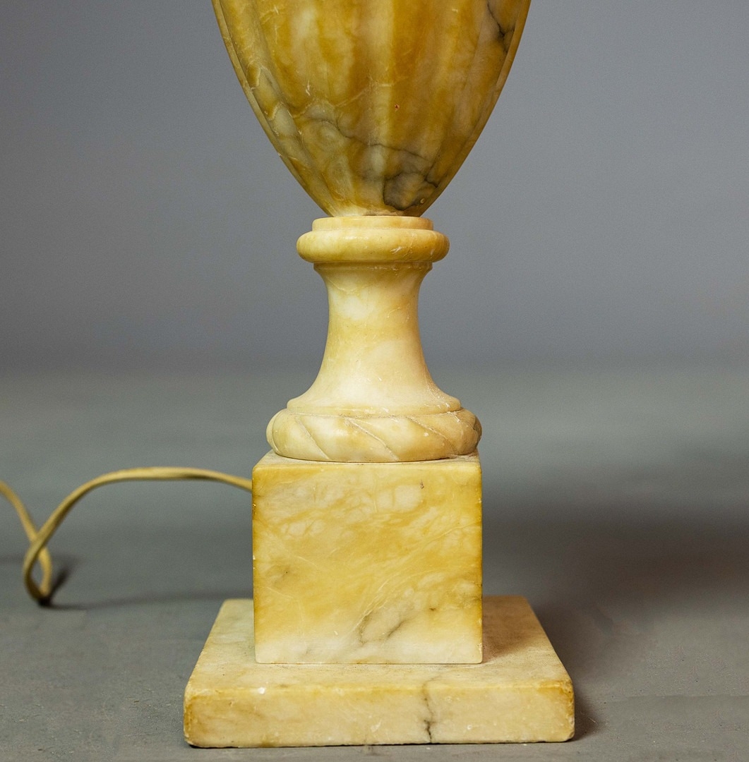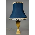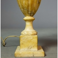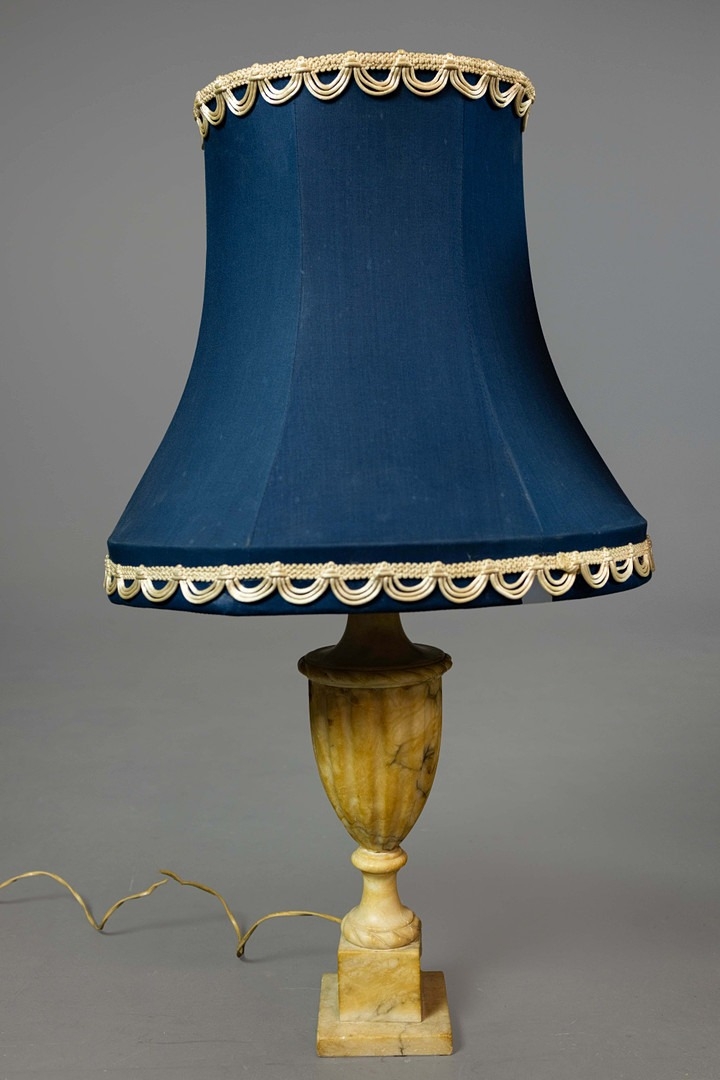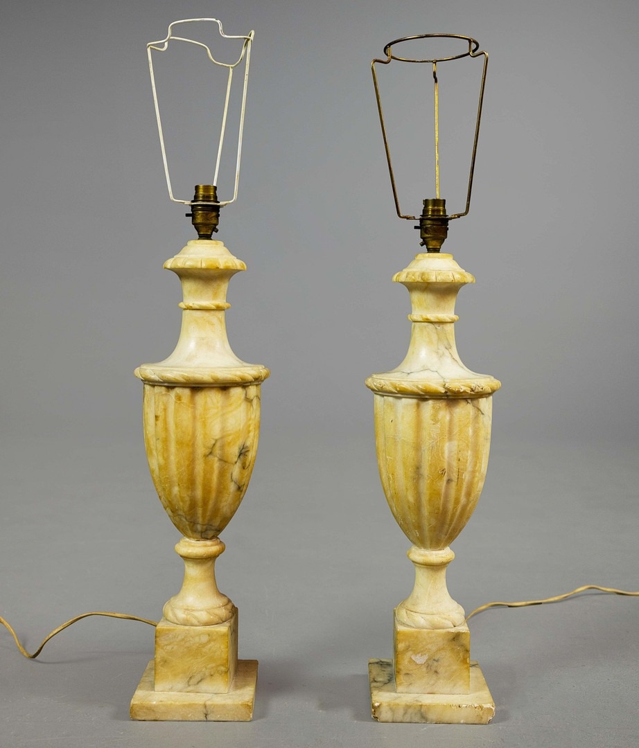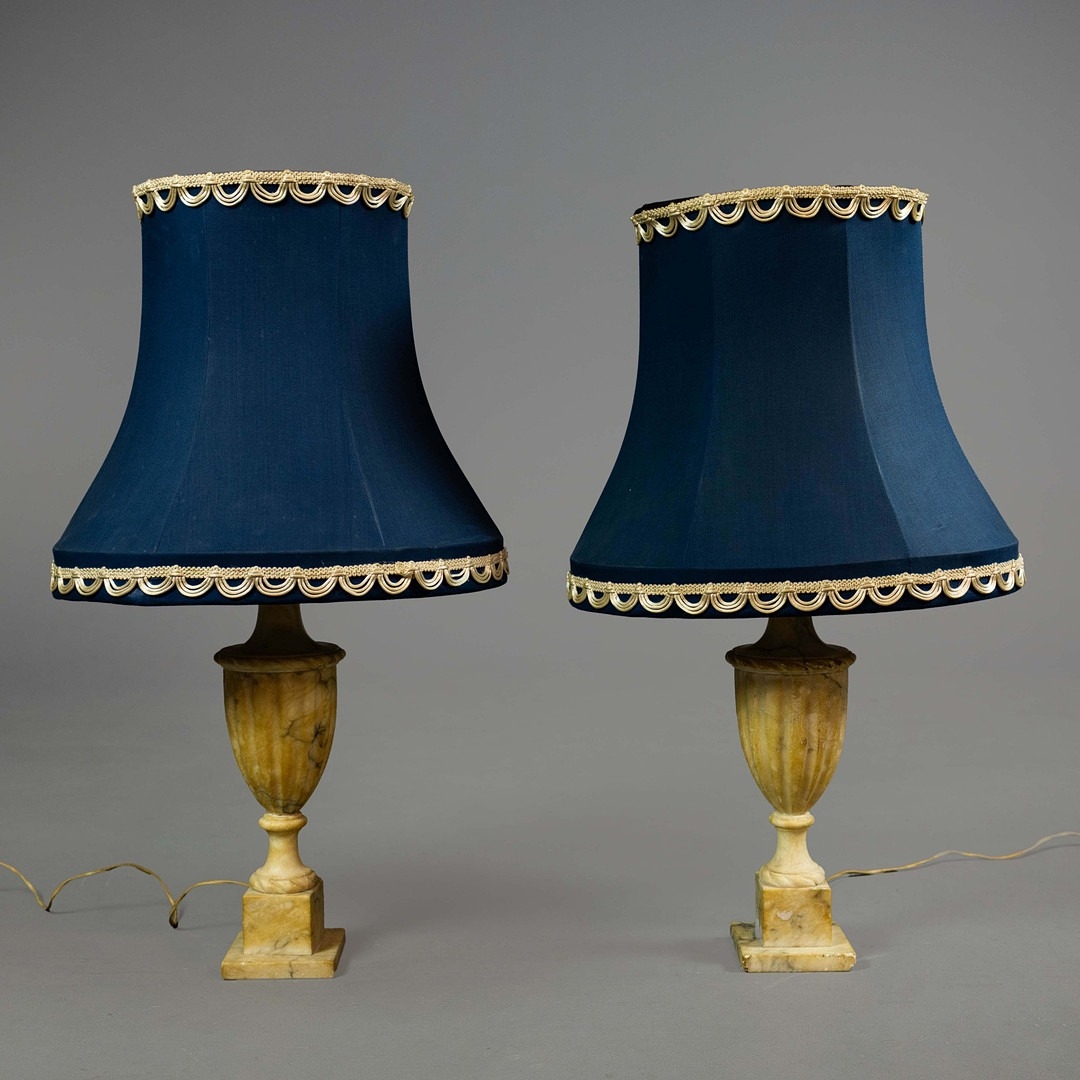 A PAIR OF NEO-CLASSICAL ITALIAN MARBLE 'GRAND TOUR' URN TABLE LAMPS. (2). in variegated white marble with dark inclusions and dark blue shades. 90cm H with shades.