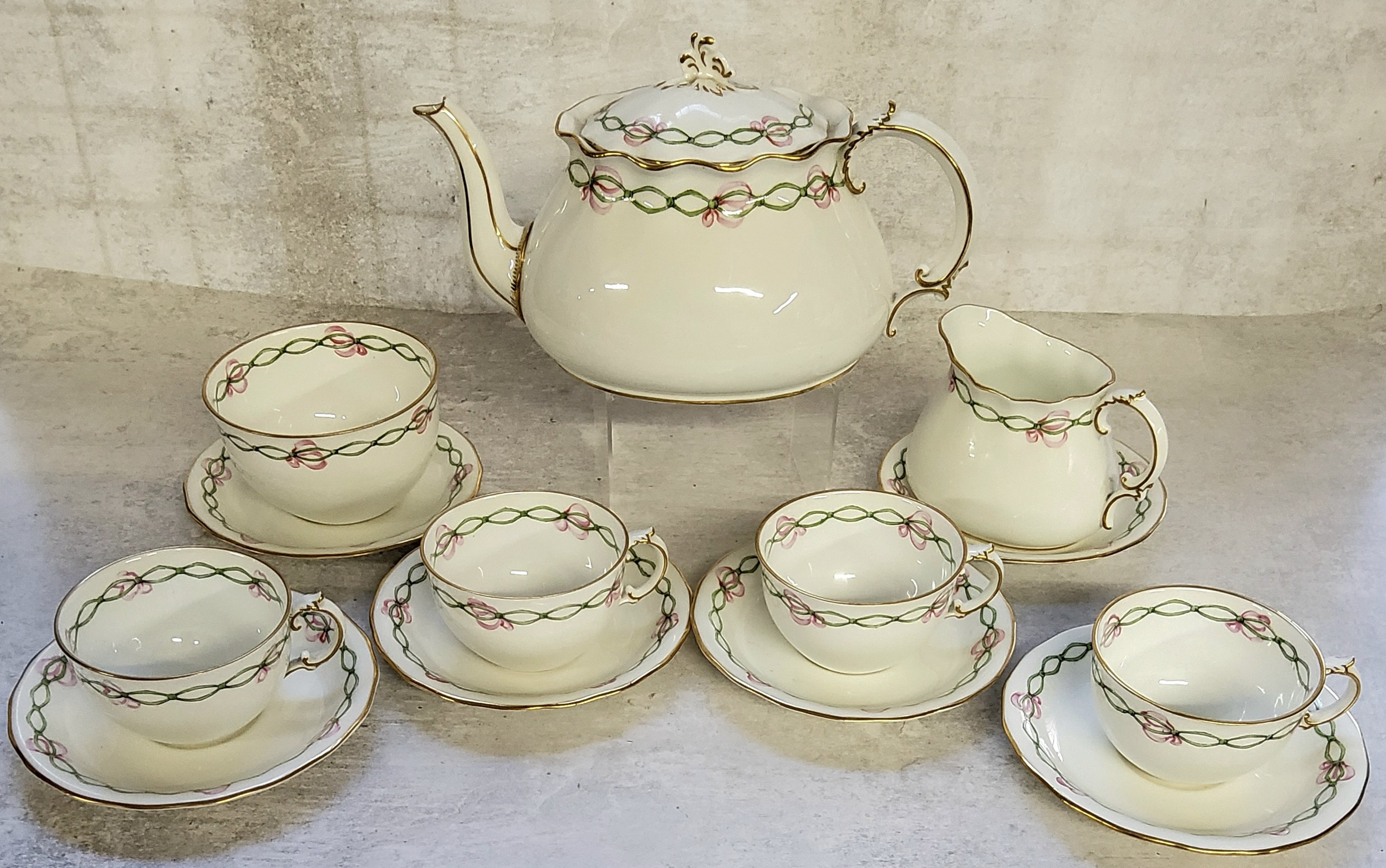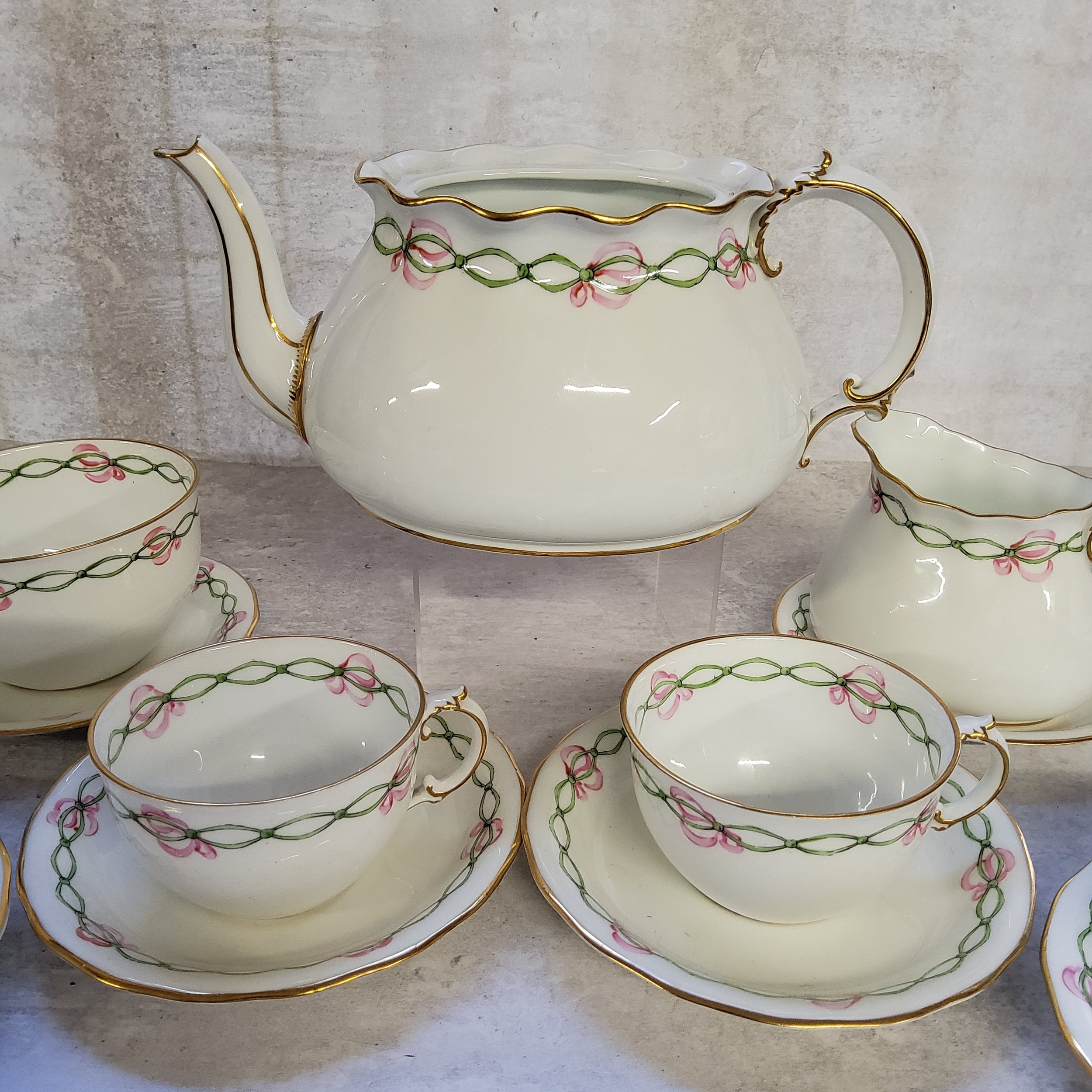 A 1920's Royal Crown Derby part tea service for four, handpainted with a green ribbon & pink bow borders, pattern no. 6918 comprising teapot, milk jug, sugar bowl, four teacups & saucers, two saucers, date mark 1923
