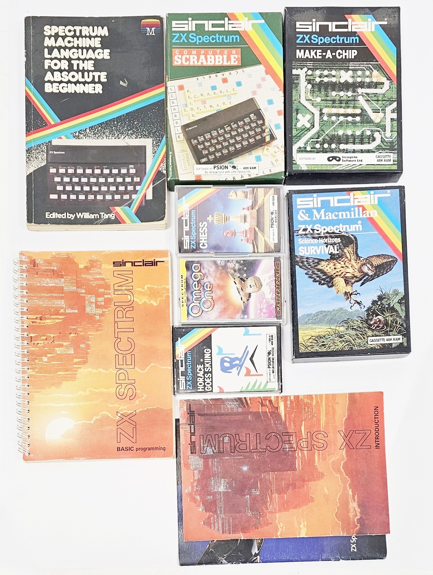 Five boxed Sinclair ZX Spectrum cassette games including Make-a-Chip, Computer Scrabble, Science Horizons Survival, Chess and Horace Goes Skiing plus Spectrum cased Omega One cassette game and three Spectrum ZX programming books (please note VAT will be payable on the hammer)