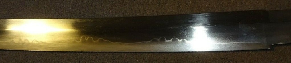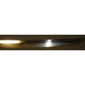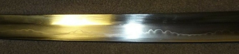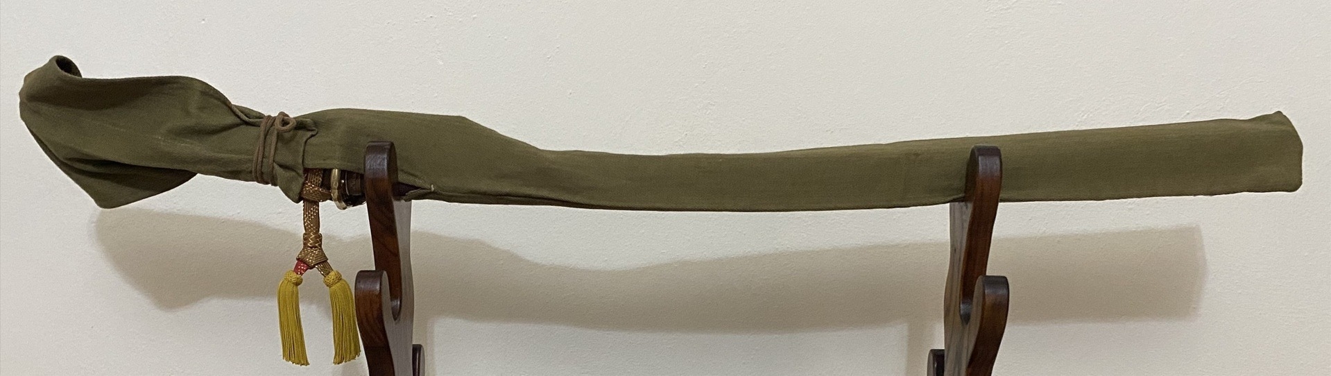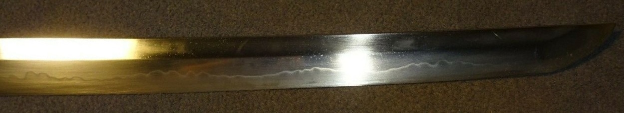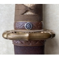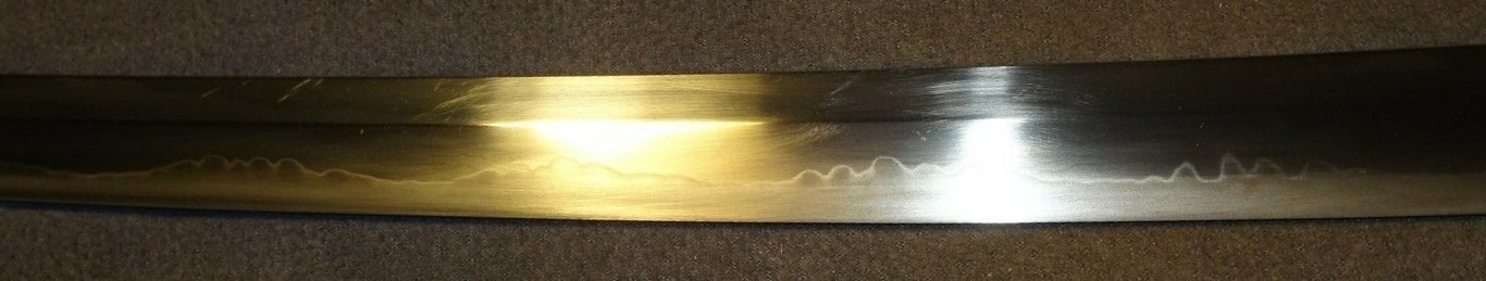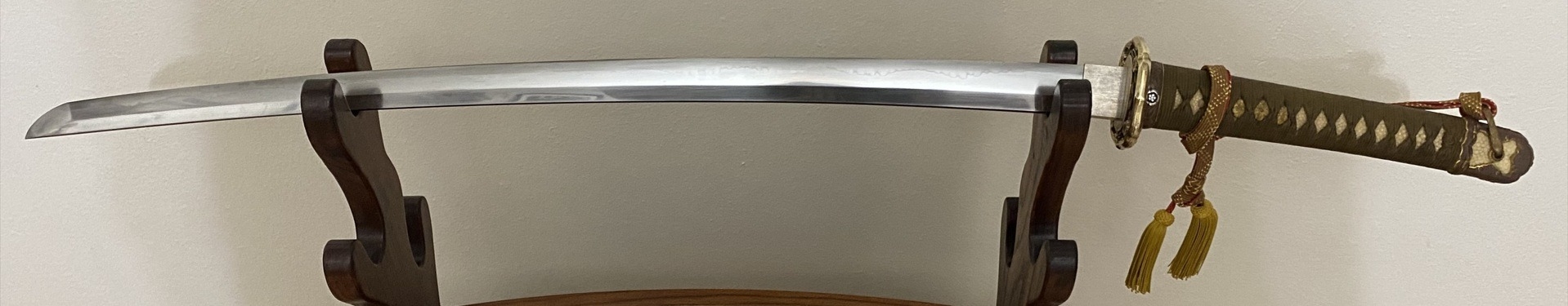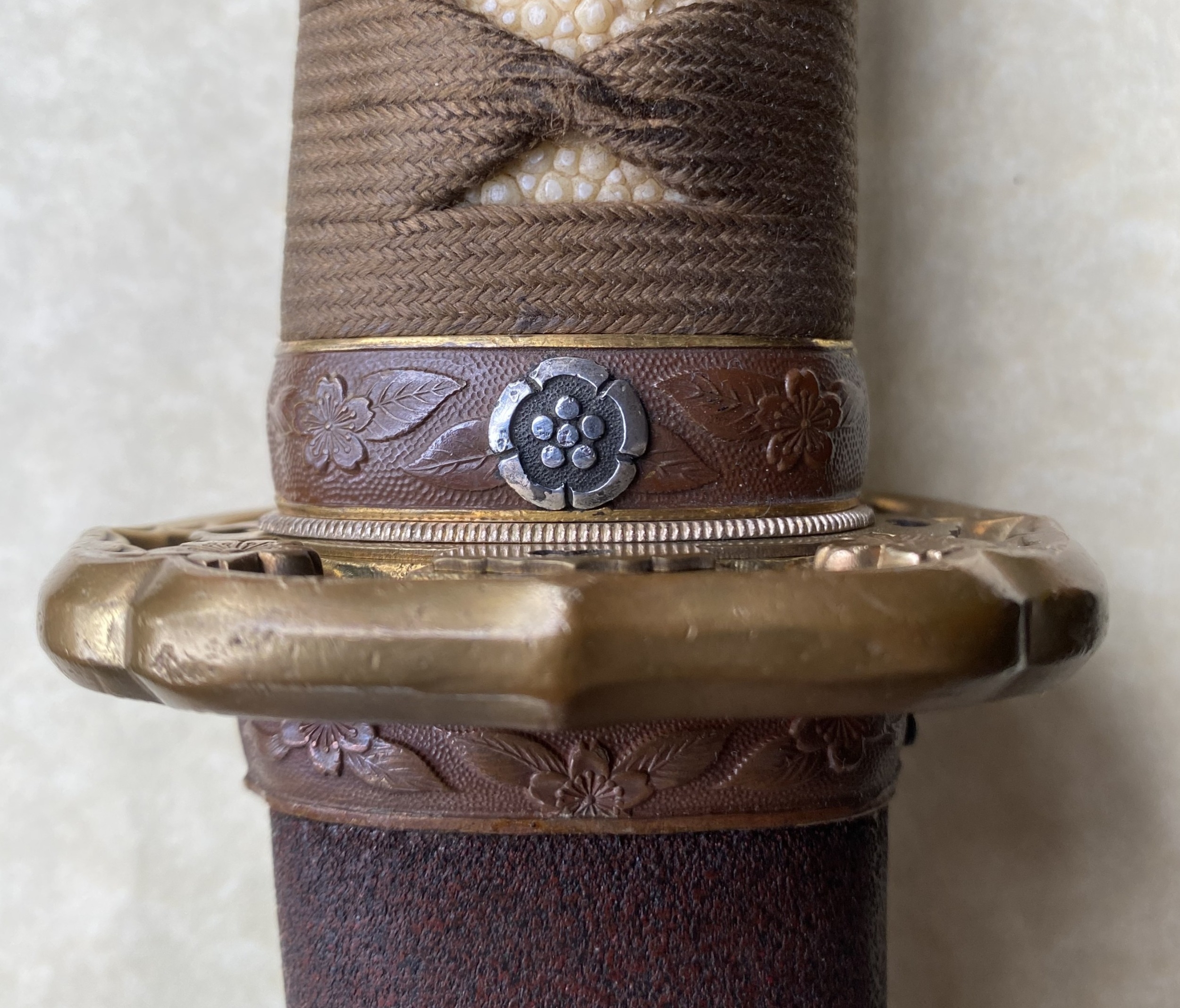 A WWII Japanese Sword with Silver Mon and Gold Coloured Tassel. PRICED TO SELL! A WWII Japanese Army officer's sword in mountings. The blade is signed 'Chounsai Emura saku', shinogi-zukuri circa 1940. Emura was the director of Okayama Prison and used prison labour to help him produce swords for the war effort. Listed on page 28 of Slough. The blade is traditionally hand forged and water tempered, is in old original polish and overall is in excellent condition. The outstanding hamon is a gunome-choji temper pattern with a deep boshi temper line at the point. The forging grain pattern is a tight itame-hada. The saya is of lacquered wood with fine ishime lacquer which is in excellent condition. The tsuka is a tight fit, with a silver Yo kamon on the fuchi, and the tsuka-ito is in good condition. The tsuba and seppa are a matched set all stamped number 3 with the lock mechanism working as it should. The blade is 26+1/8 inches or approximately 66.4cm long. With gold coloured tassel and khaki storage bag. UK Mainland shipping Only