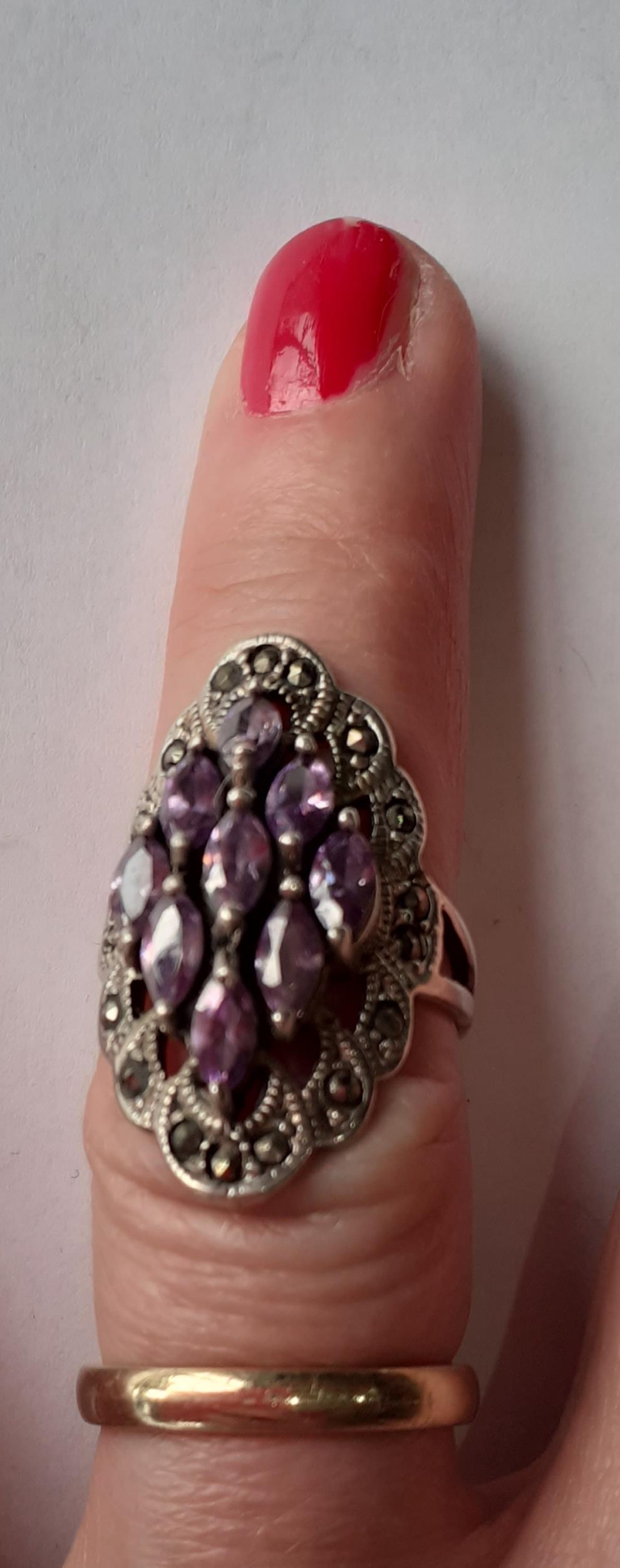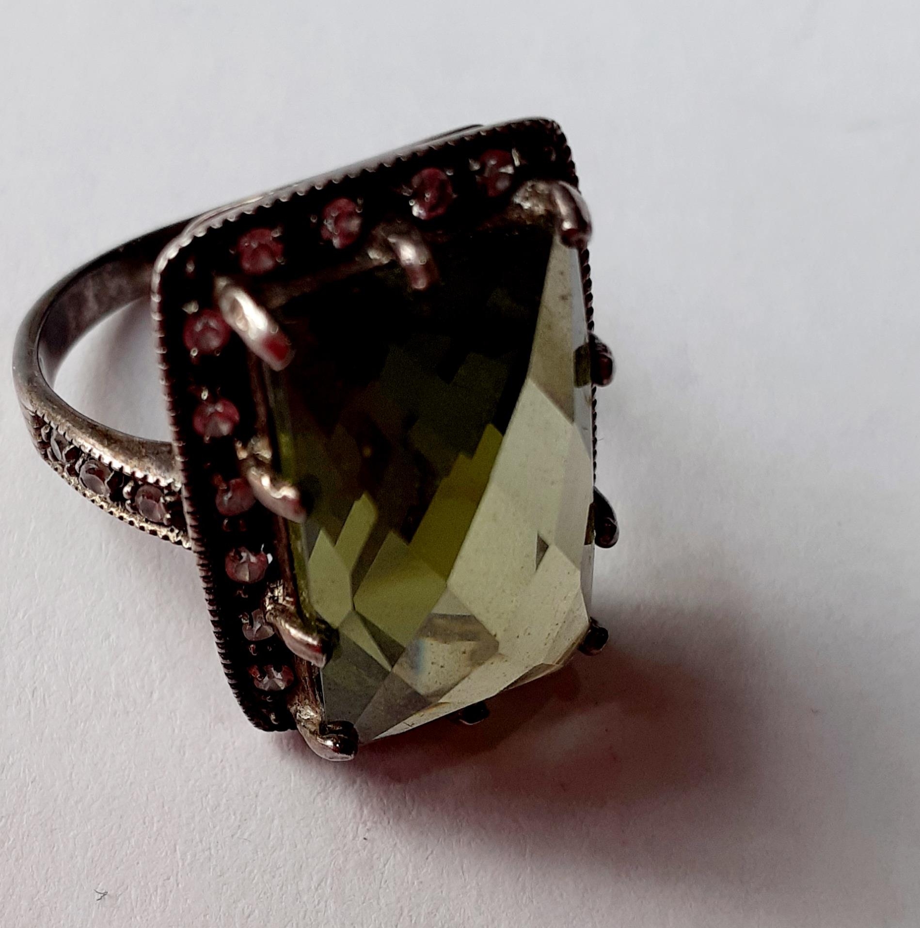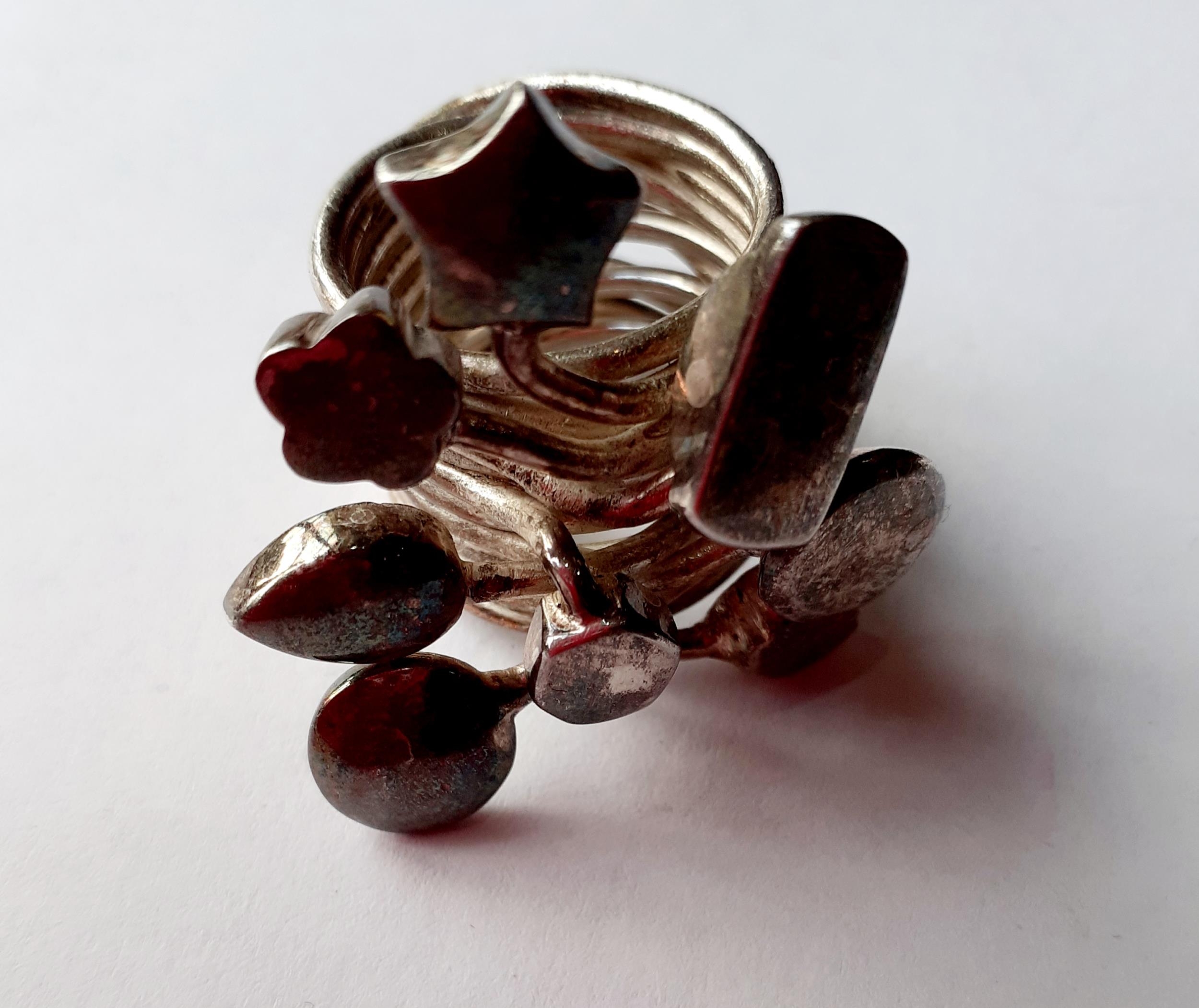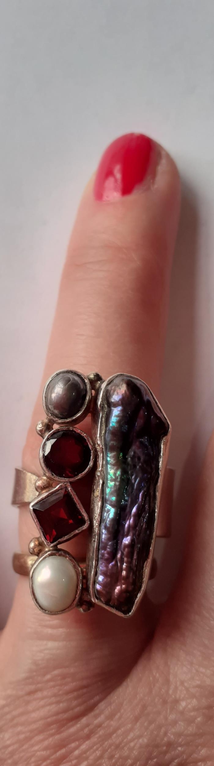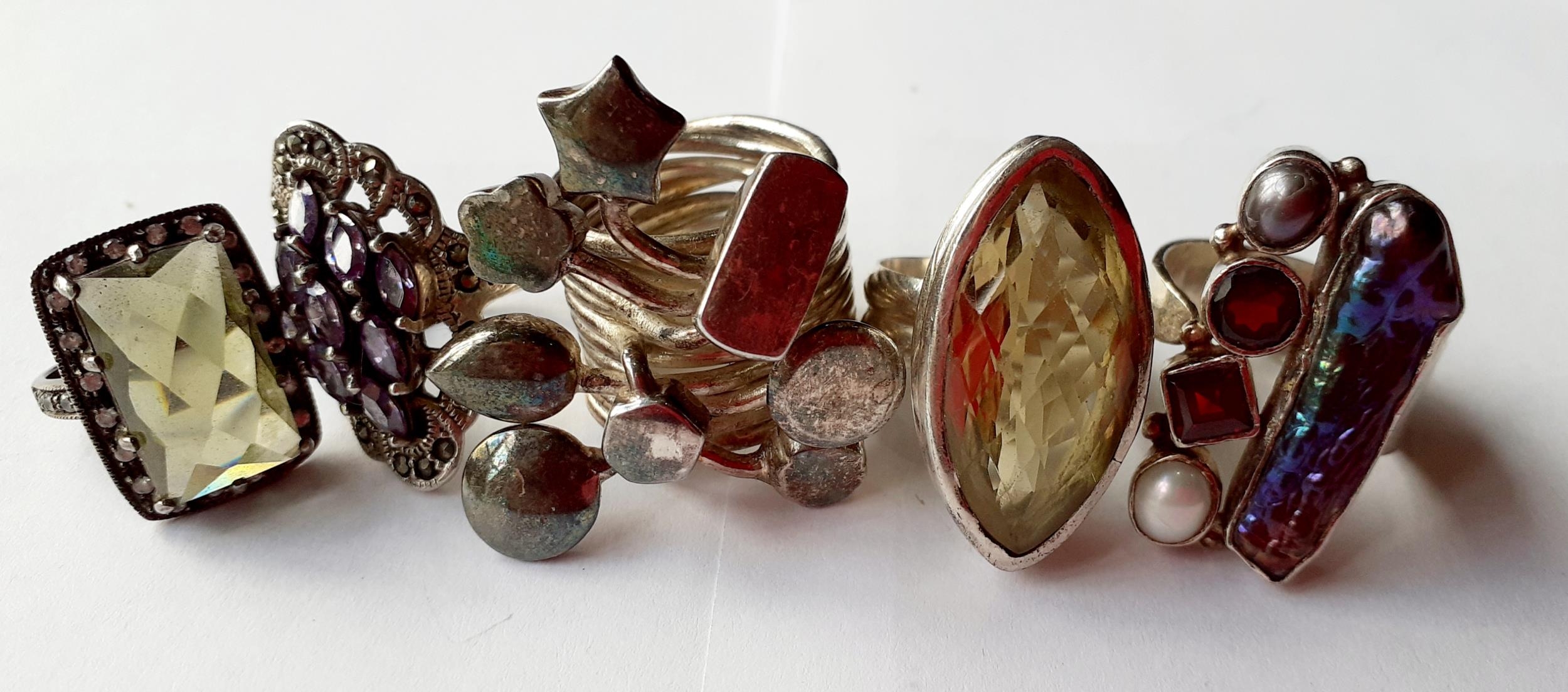 Five Modernist silver and silver tone fashion rings with coloured cabochons, total weight 79.2g. Location:Cab