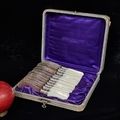 A complete vintage set of twelve beautiful butter knives by Sheffield Harrison Bros & Howson. Boasting fabulous mother-of-pearl handles and ornate collars. Housed in a purple satin lined canteen.